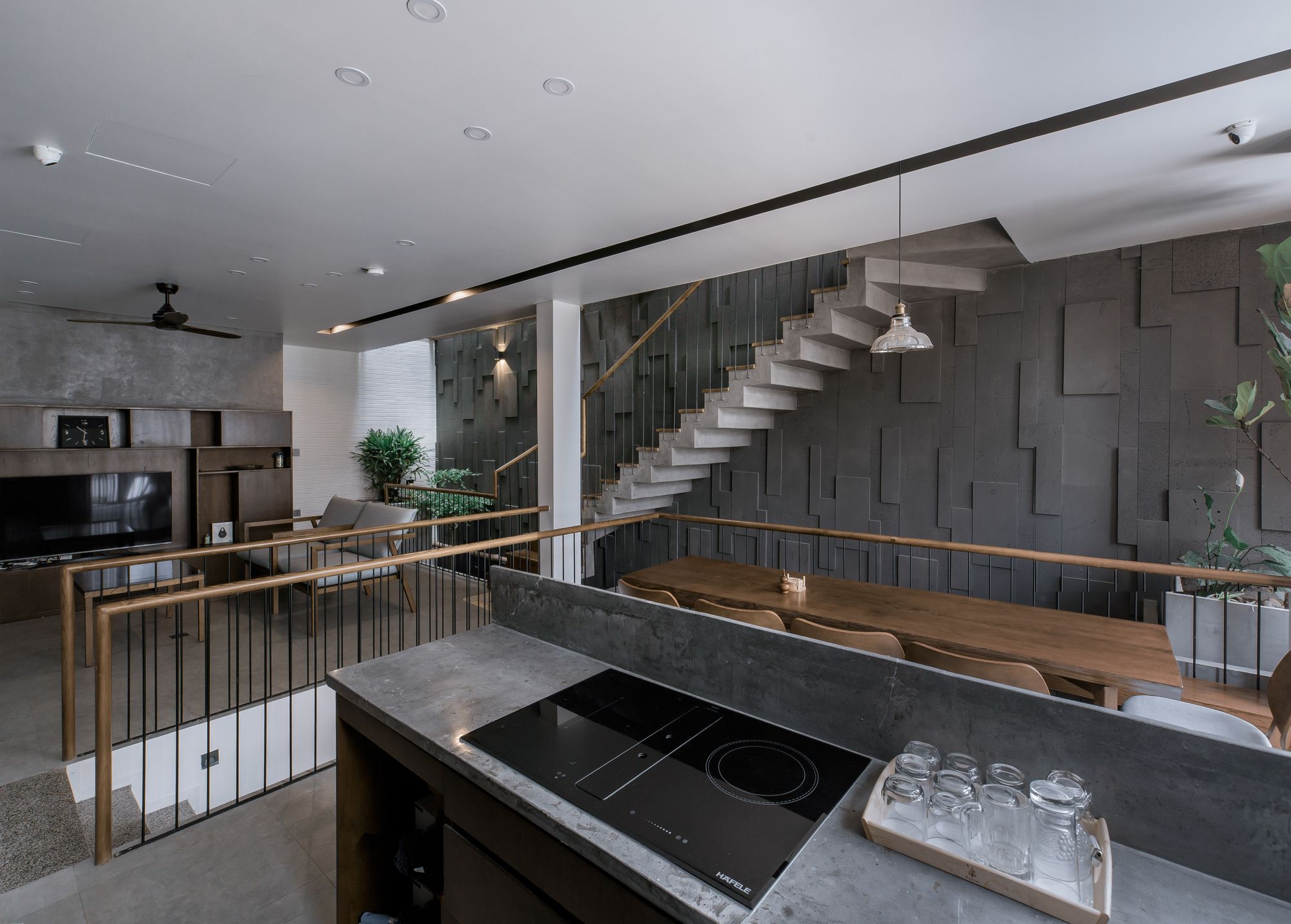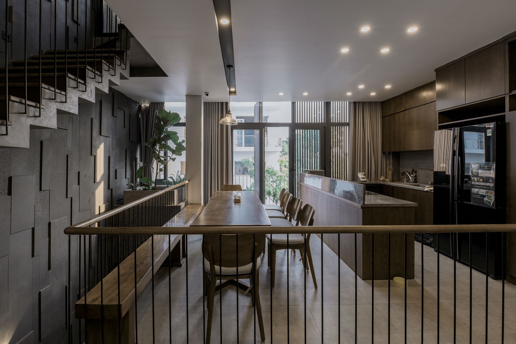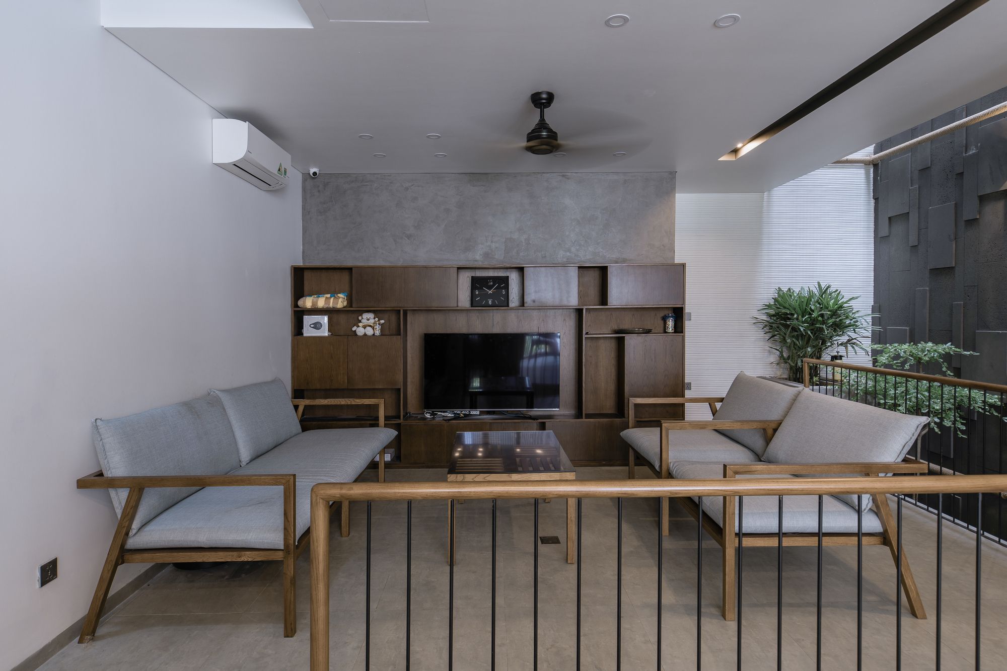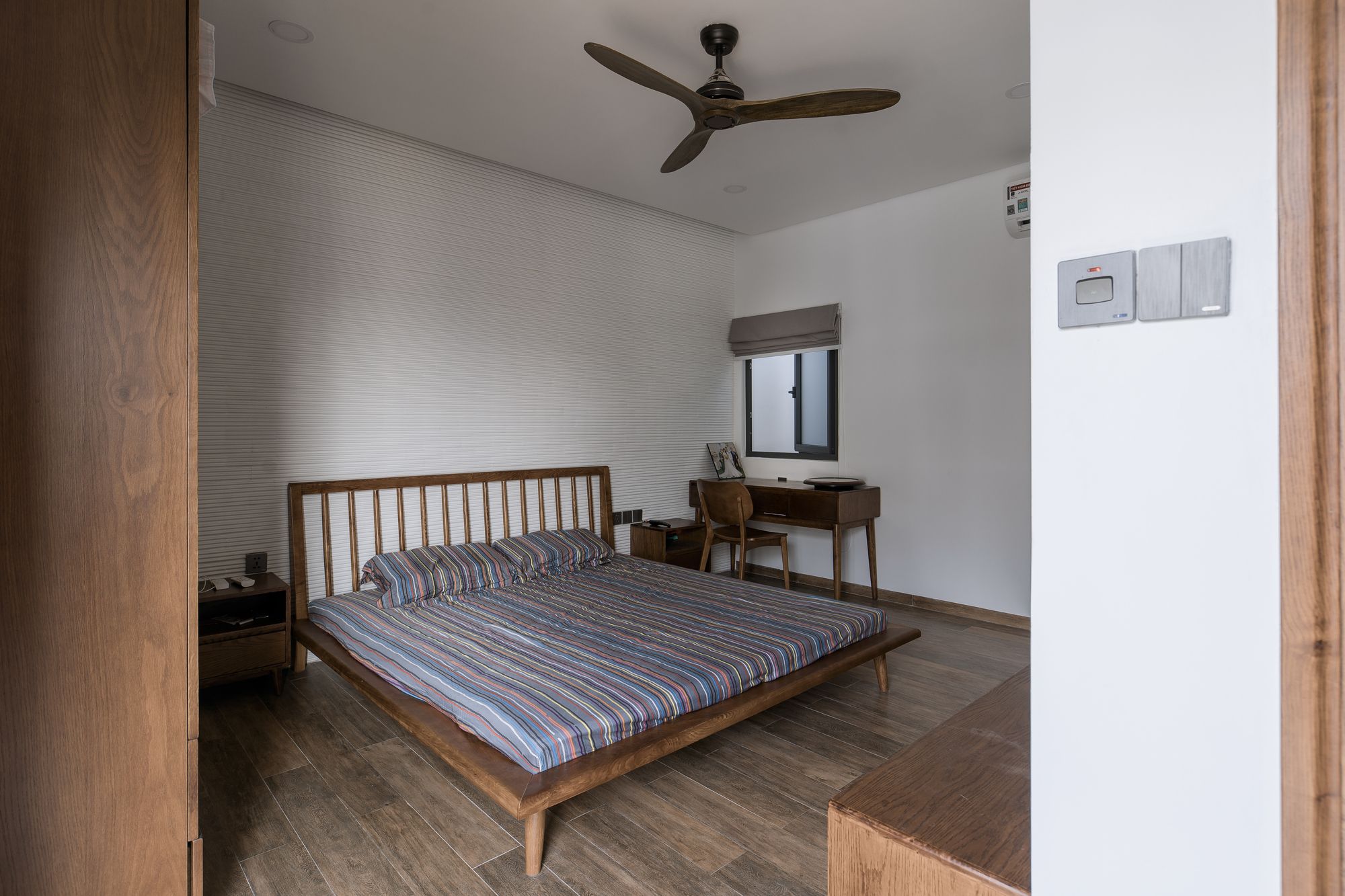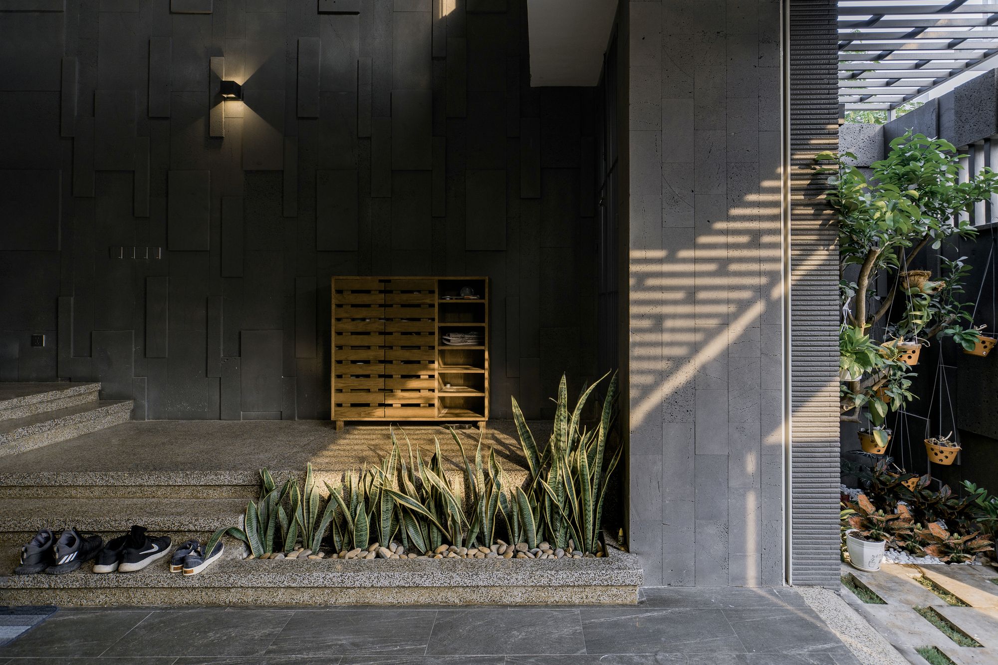 Because the house is oriented Southwest, the architect chooses solution to create a wooden sun louvre system throughout the front elevation to prevent effects from sunlight while still being able to open the ceiling glass doors to maximize the interaction between the space inside and outside.