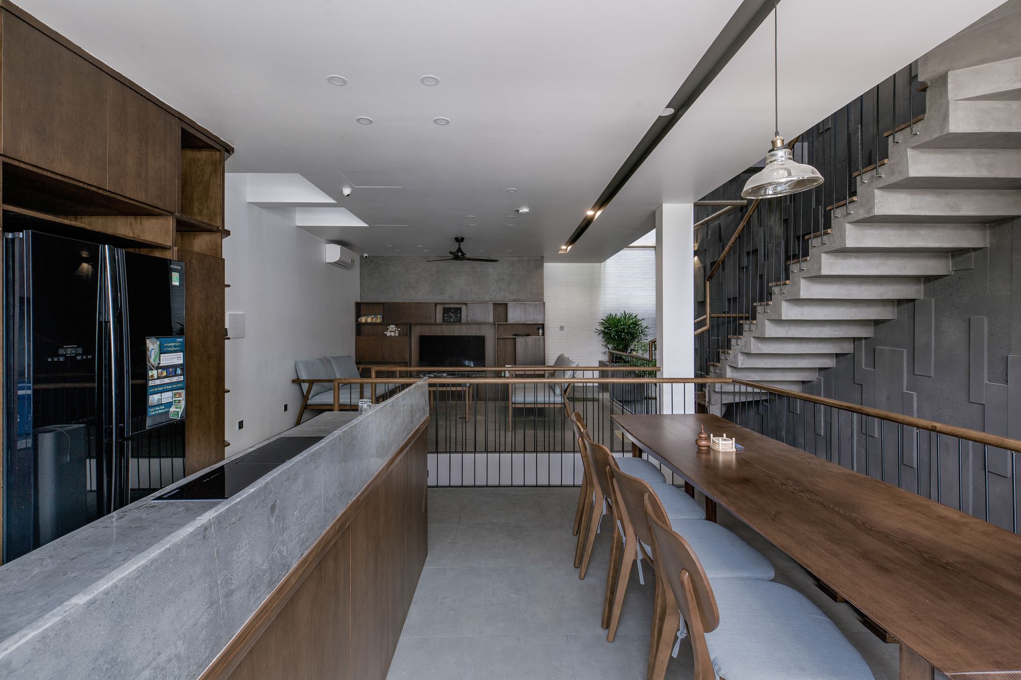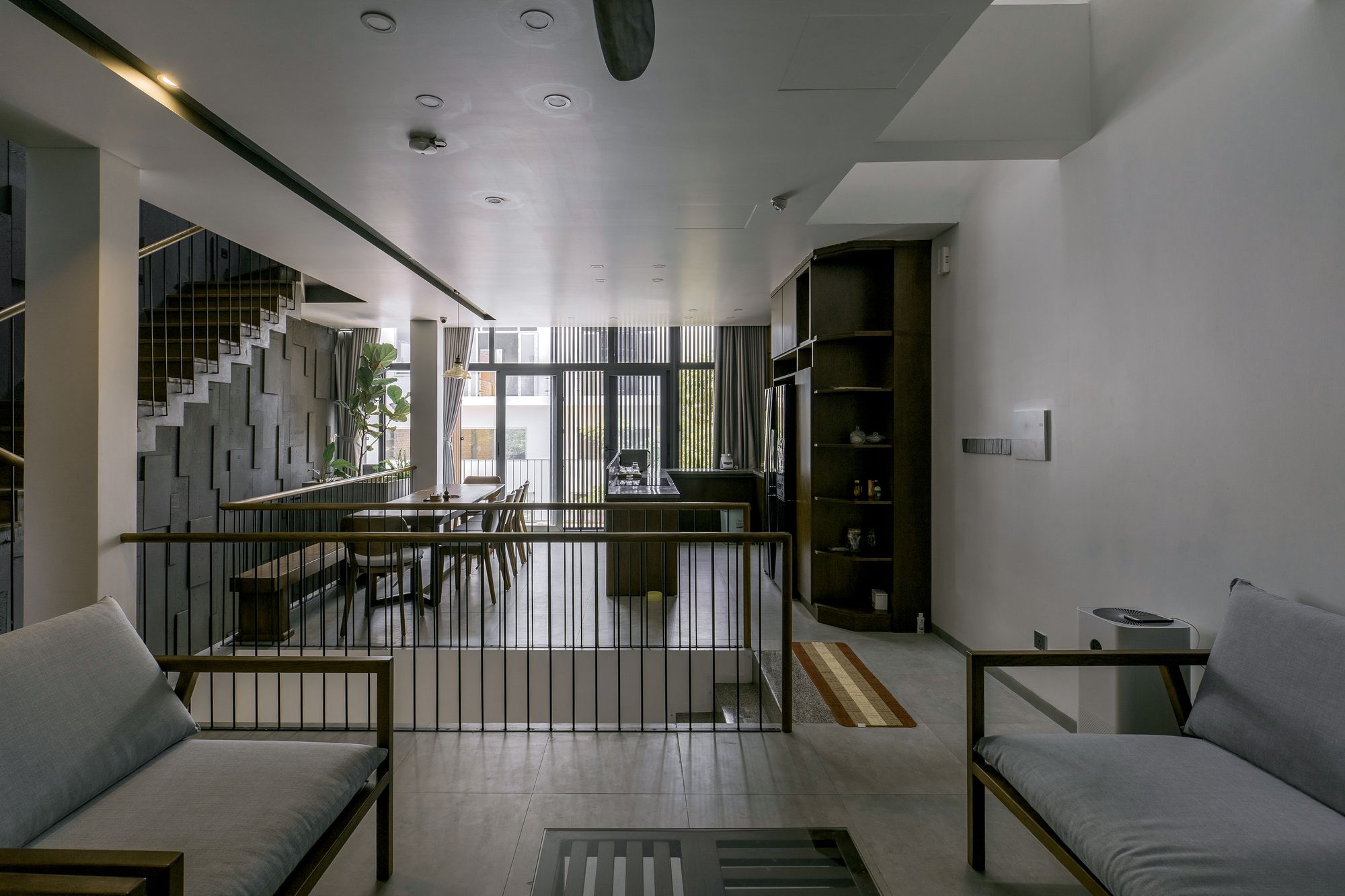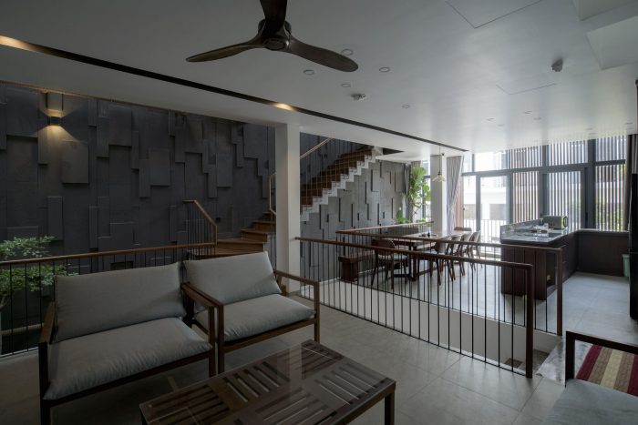 For the space problem, common spaces (living room-kitchen) are arranged in first floor, become an open-space in center which creating intersections outside of private spaces. Moreover, the ventilation corridor is arranged in boundary along the length of house combined with some voids can create an expanded impression of space and helps indoor illumination can be day-lighted. This is very useful for a city house just have only one frontage facing outside in the condition of tropical climate.