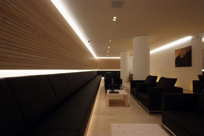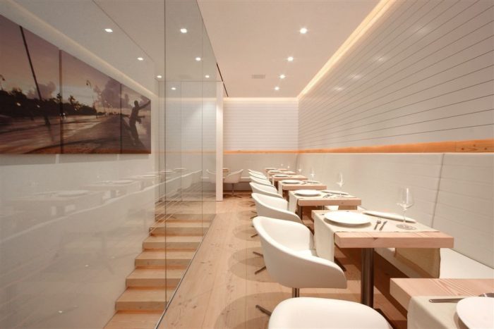 Aligned with the main counter is a white Corian full height block, with also serves as a perimeter wall corresponding to the exterior private setback space for the bar customers, made possible by setting back the transparent glass enclosure. The longitudinal direction is reinforced by the use of the wood flooring laid in the same direction and by lacquered wood planks cladding the wall above the bench. To give maximum strength to the perspective, linear light coves are located in the dropped ceilings and immediately above the bench’s backrest.