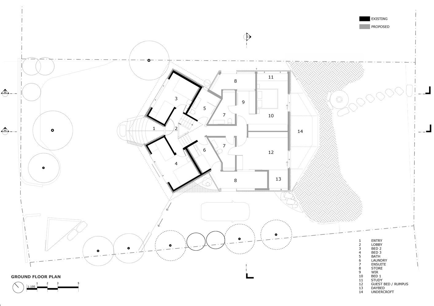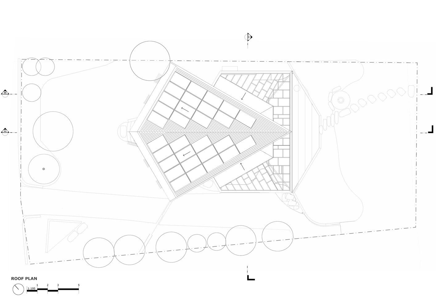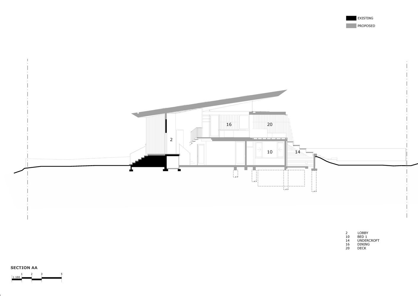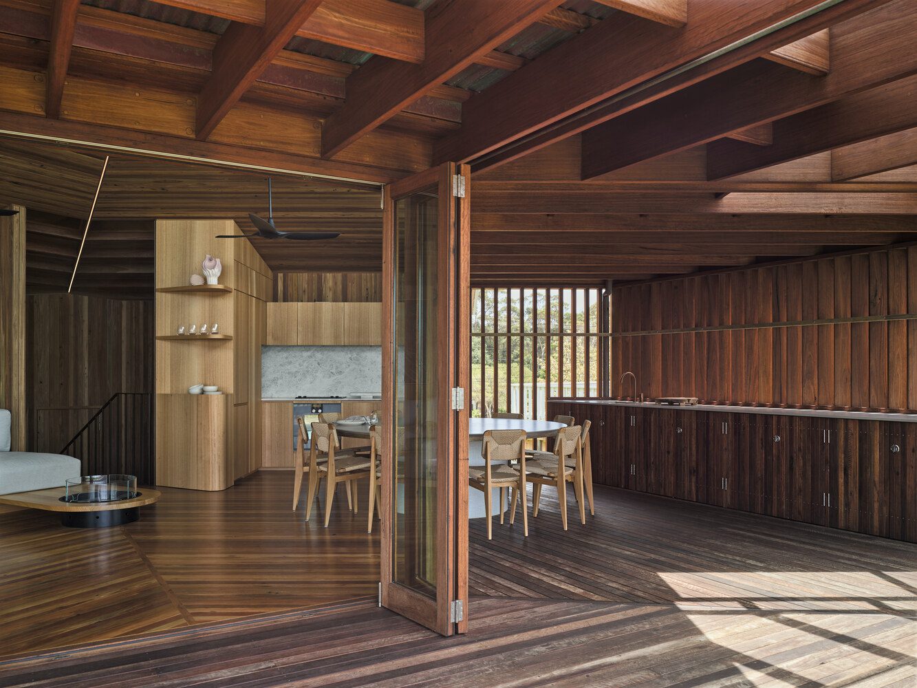 The programming of the house has remained similar, with ocean ocean-facing kitchen and living upstairs and bedrooms below. A landscape berm has been built around the lower level to protect the rooms from increasing storm surges, acting as a hind sand dune. The diamond entry and lobby, anchoring the two levels, has been retained and upgraded. The reinstated ‘kite’ roof has been sharpened and lightly sails over the internal spaces. The light roof form is grounded by the recycled hardwood and carbon-neutral concrete formed from the original aluminum cladding.