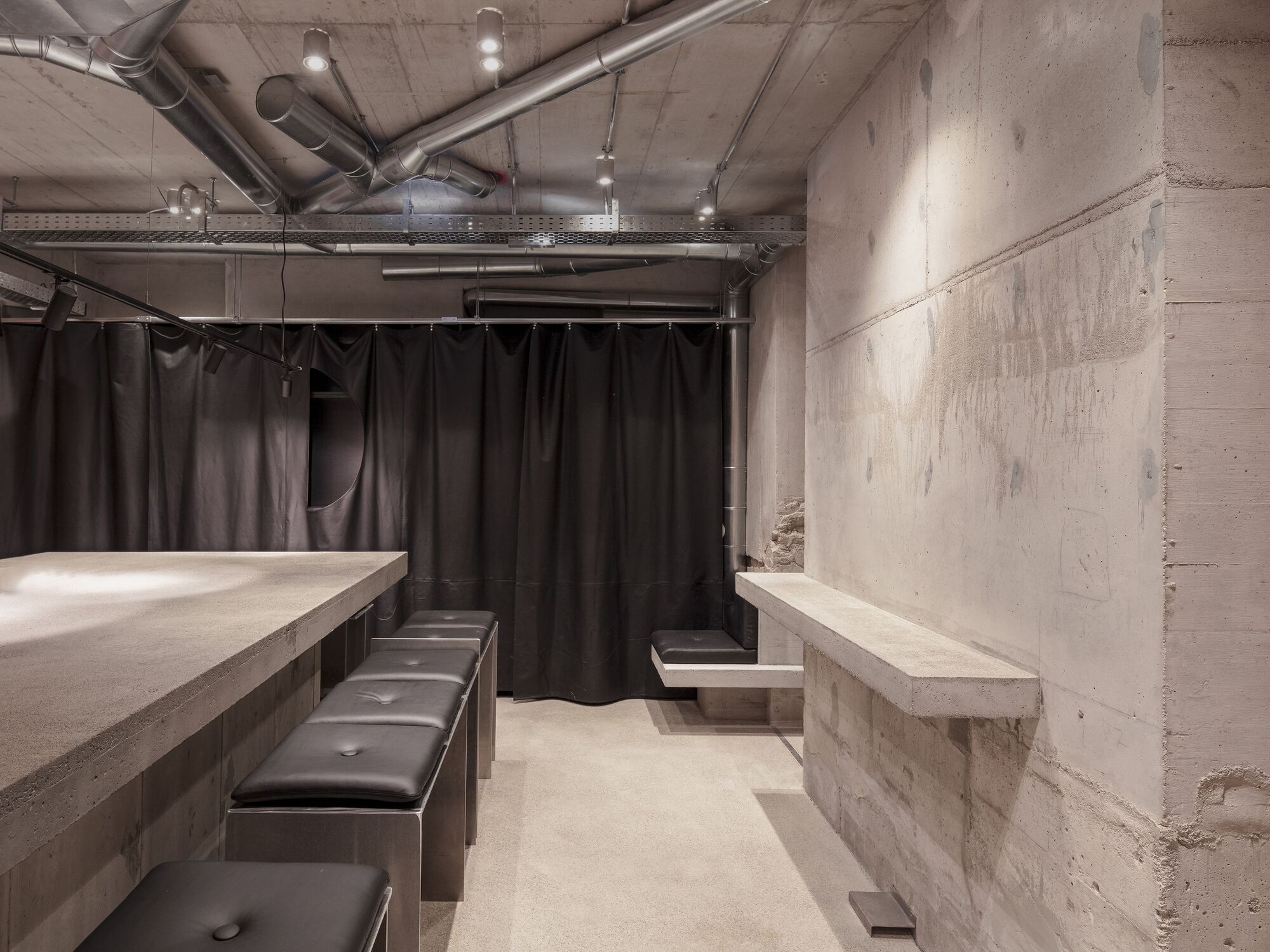 The necessary building services were installed under the concrete ceiling in the bar area – heating and ventilation are located on the floor. The vault itself was kept free of installations except for lighting and sound. Two- and three-seater bar stools made of solid aluminum were manufactured as counterparts to the metal piping systems. The chairs and concrete surfaces are upholstered in black leather. A leather curtain also forms the front end of the bar. Half of this was made from leftovers and offcuts from upholstery production and conceals passageways and a shelf. Only bench-like seating was deliberately provided in the entire bar area. When arranging their height and distance from each other, great care was taken to create different seating positions and thus different communicative seating areas.