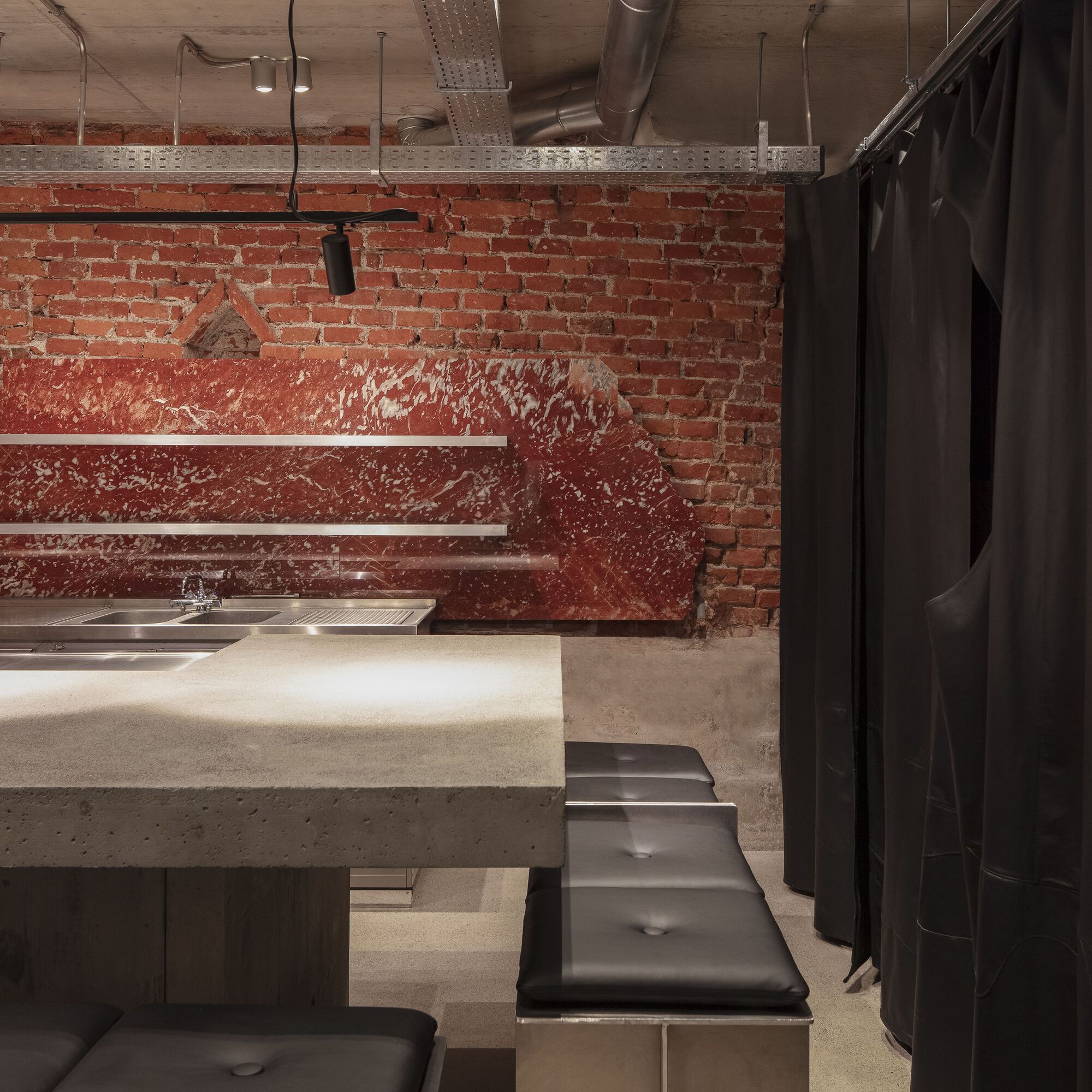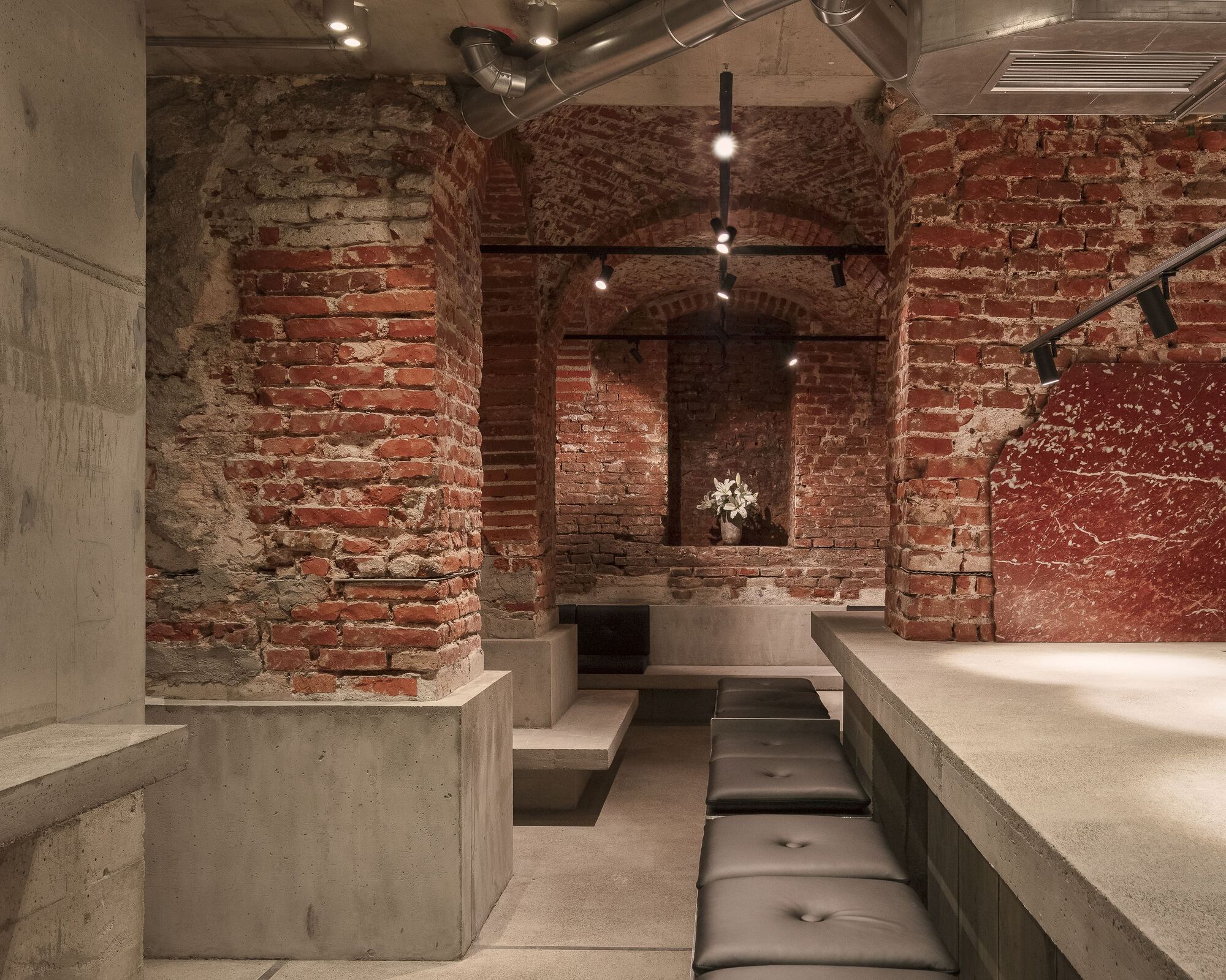 As part of a restructuring of the building, the house was rebuilt from the second floor upwards and extended downwards to a third basement level. The vaulted cellar, which was only around 1.70 m high, was extended and excavated by hand and the brick supports and walls were gradually underpinned. During this process, the benches, bar and high table were also concreted directly onto the underpinnings. The benches and bar thus simultaneously form the foundations and furniture of the building. Guests and the building thus sit on the new foundations, which carry and support the building. This also creates a clear separation between the downward extension and the historic building fabric. The existing brick structures themselves were not interfered with. Various layers of plaster were removed and their original appearance was exposed. Only the areas at risk of splashing water were clad and protected with a red natural stone. The visible broken edges of the stone block meant that there were no offcuts and the entire stone block could be processed without loss.