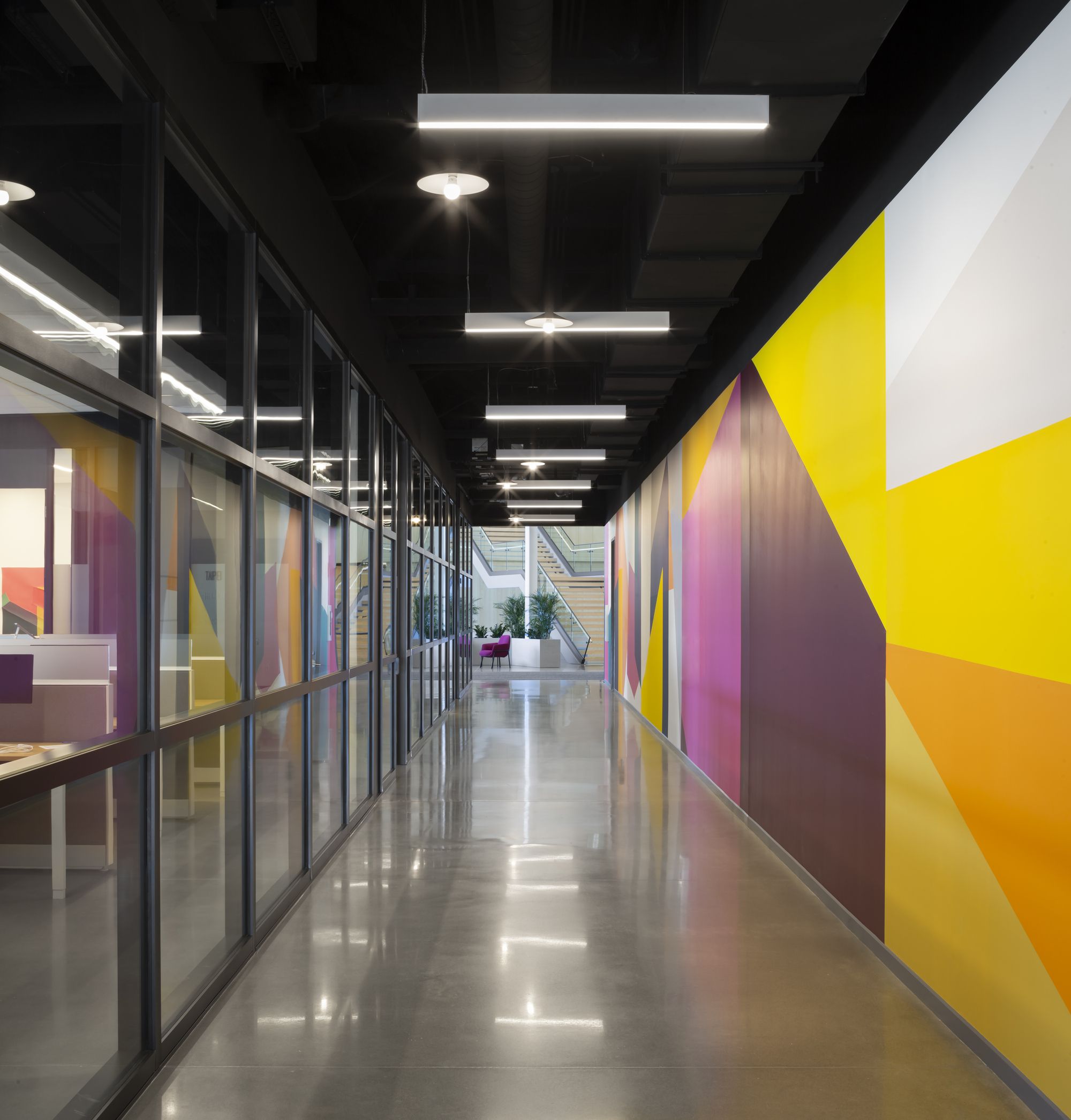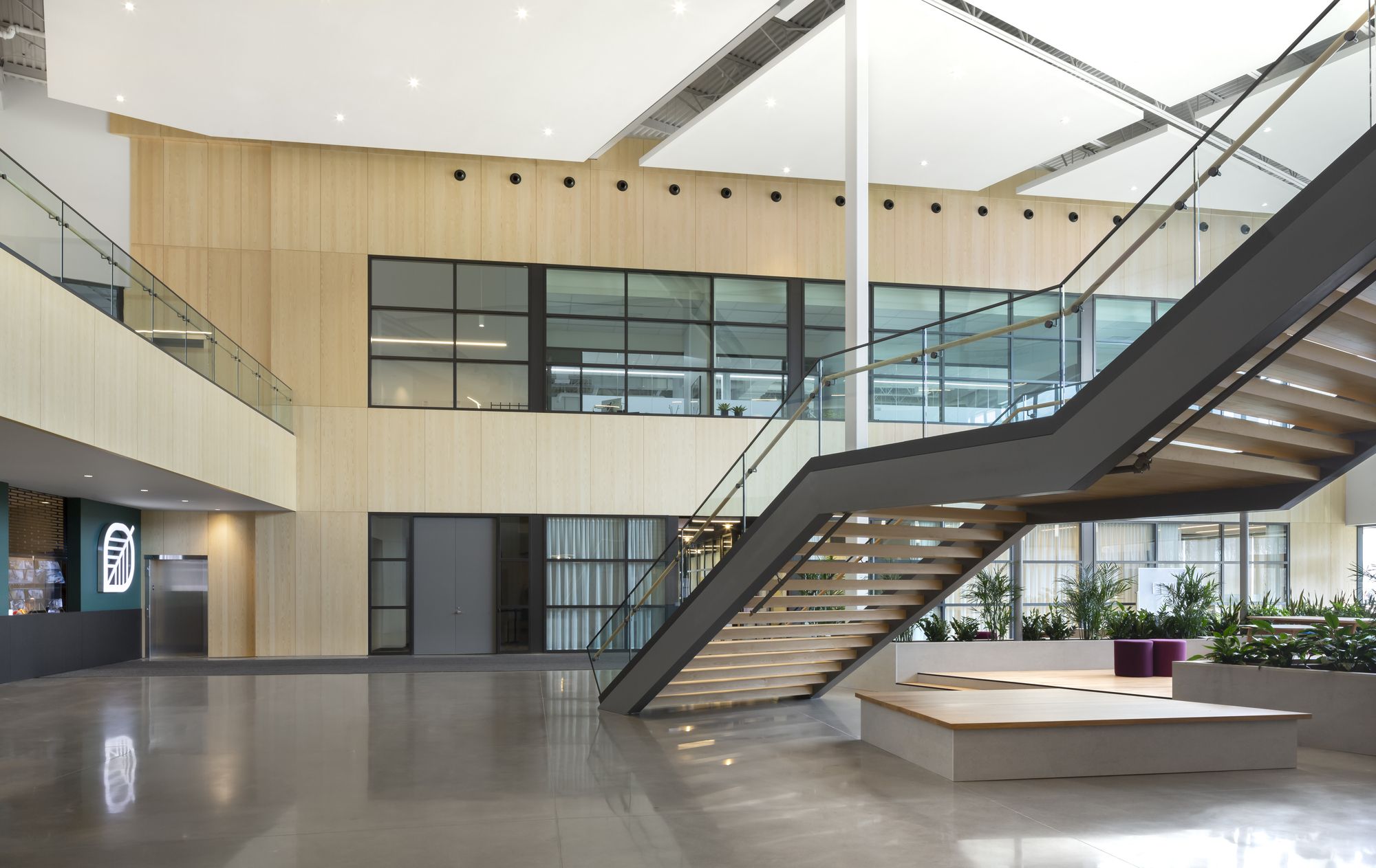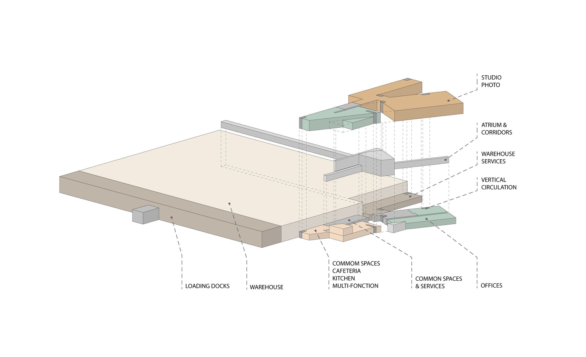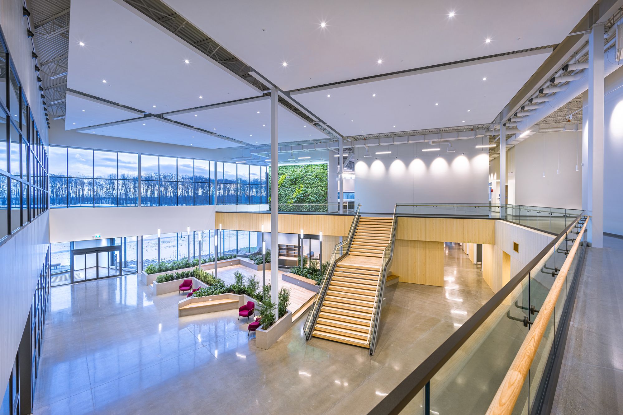 The programming and interior design of this work campus consisted first of all in controlling the flow between the offices and the distribution center through a main artery and natural direct interior paths to create a human, dynamic work environment, efficient and above all flexible. The orientations and concerns relating to interior design were aimed at giving users spaces bathed in natural light and offering them a real experience of collaborative space by offering them the possibility of being able to gather, meet and exchange in every place in the project.