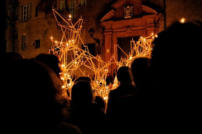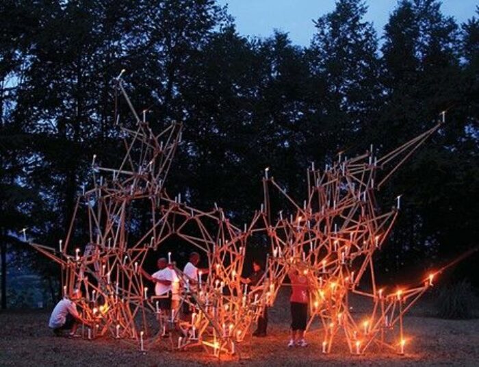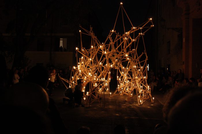 During the summer of 2012, an Italian furniture company hosted an international design workshop named Candelabrum 2.0 in which the interaction between digital realities and craftsmanship possibilities culminated in the realization of a wooden pavilion. Situated near the Medieval village of Castelvetro in the countryside of Modena, Italy, a complex volume of 900 components and 199 candles provoked a contrast between the old brick walls and ordered wine yards with the complex composition of fragile wooden sticks and dynamic shadow plays. The final outcome was the consequence of a collaborative process by designers with different backgrounds operating between digital intelligences and craftsmanship aesthetics. It was in the combination of advanced algorithmic tools, computer driven CNC manufacturing techniques and crafted woodwork experience that the hybrid character of the scheme could strongly appear.