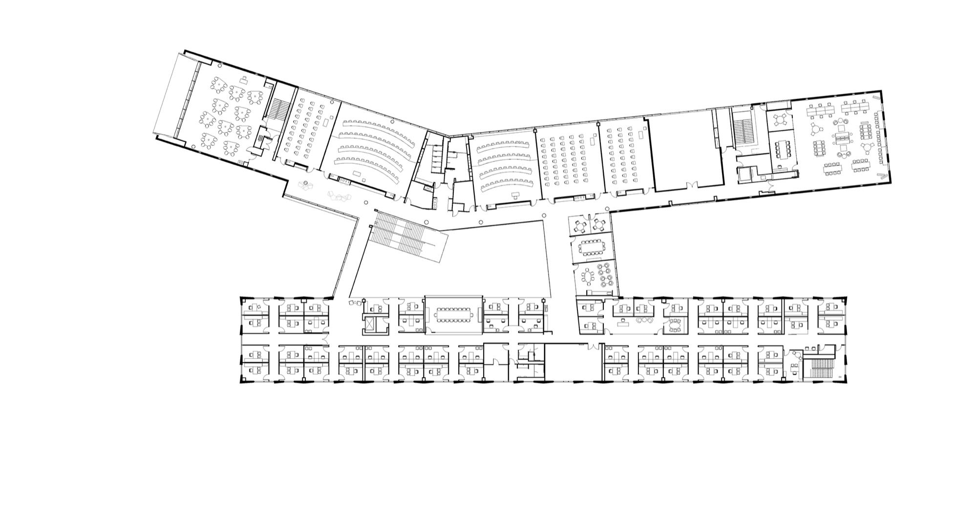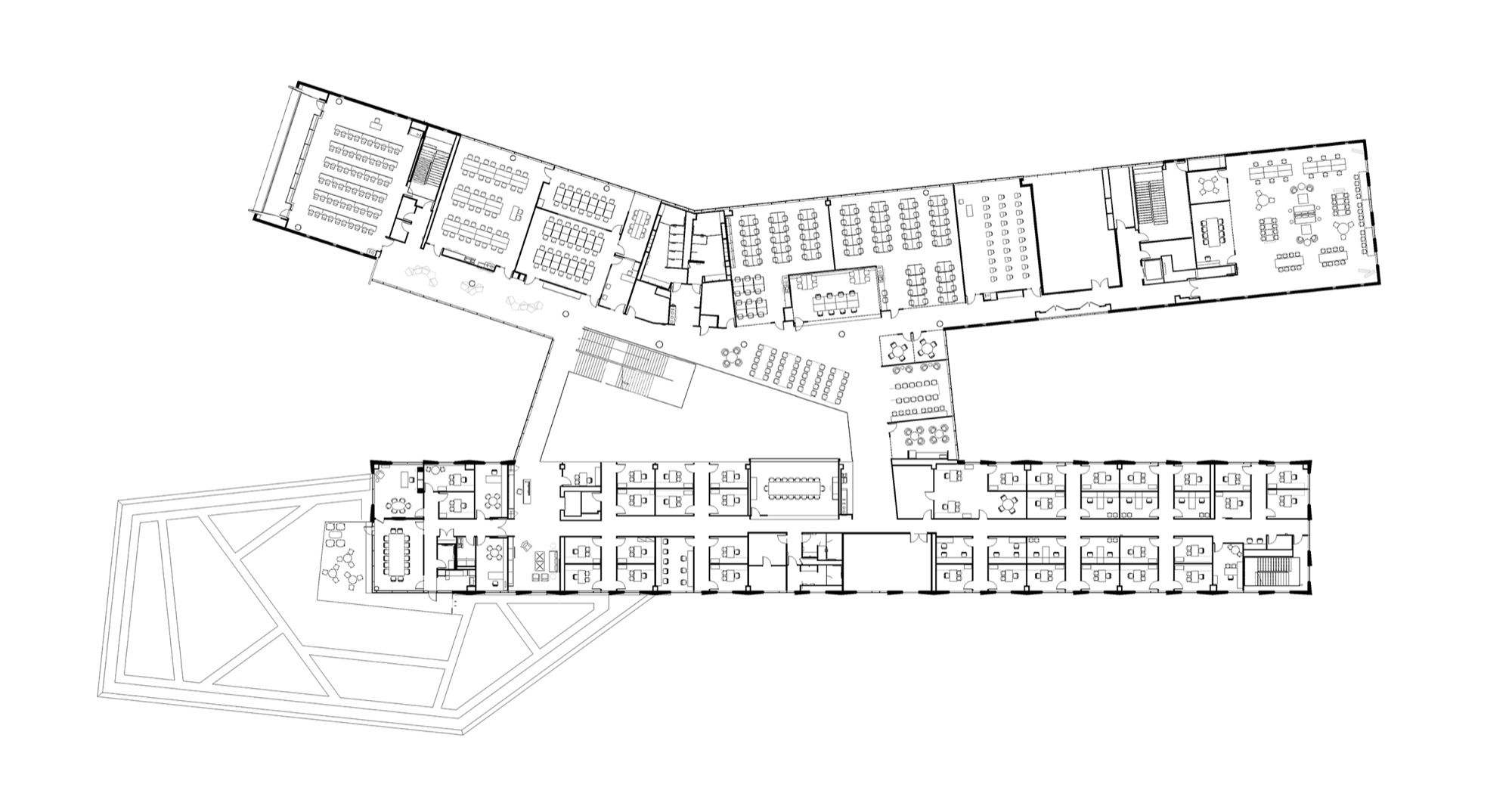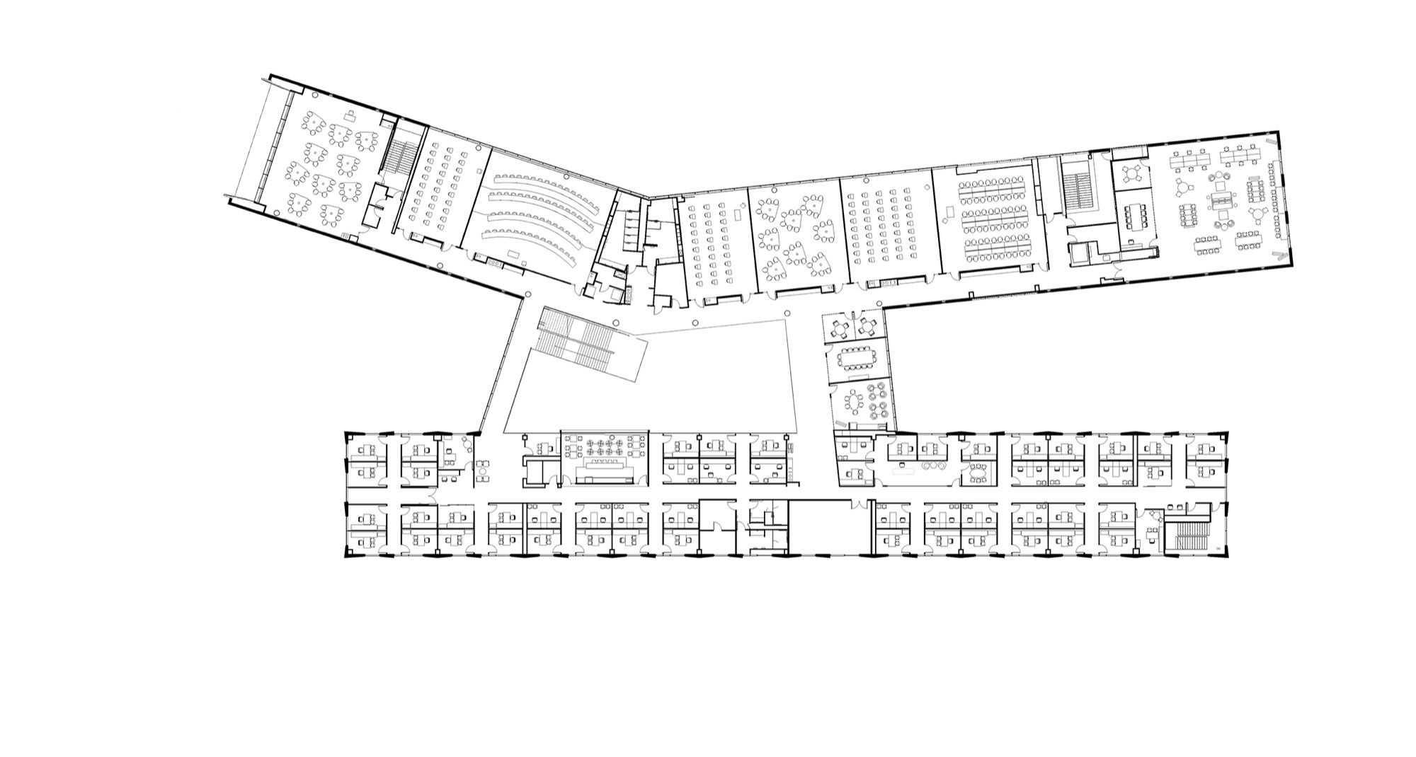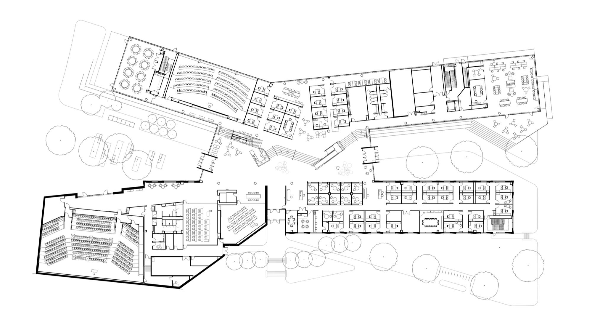 In a marked shift from traditional academic design, the school’s interiors are more closely related to academic incubators, co-working spaces and start-up offices than they are to typical classrooms, student unions, libraries, or laboratories. The design offers students a glimpse of where they could go after they make the leap from campus to workplace.