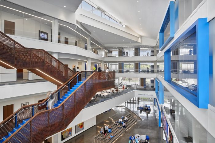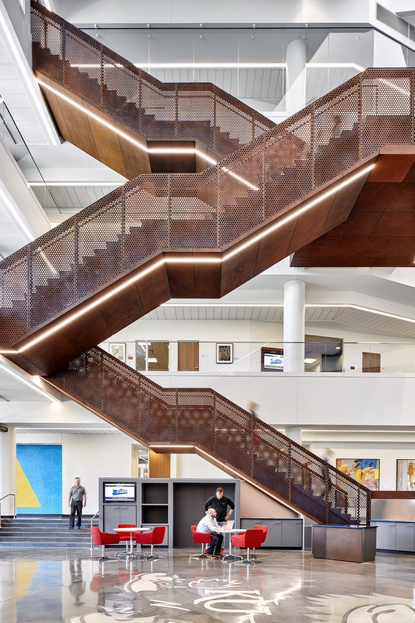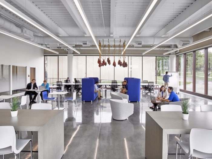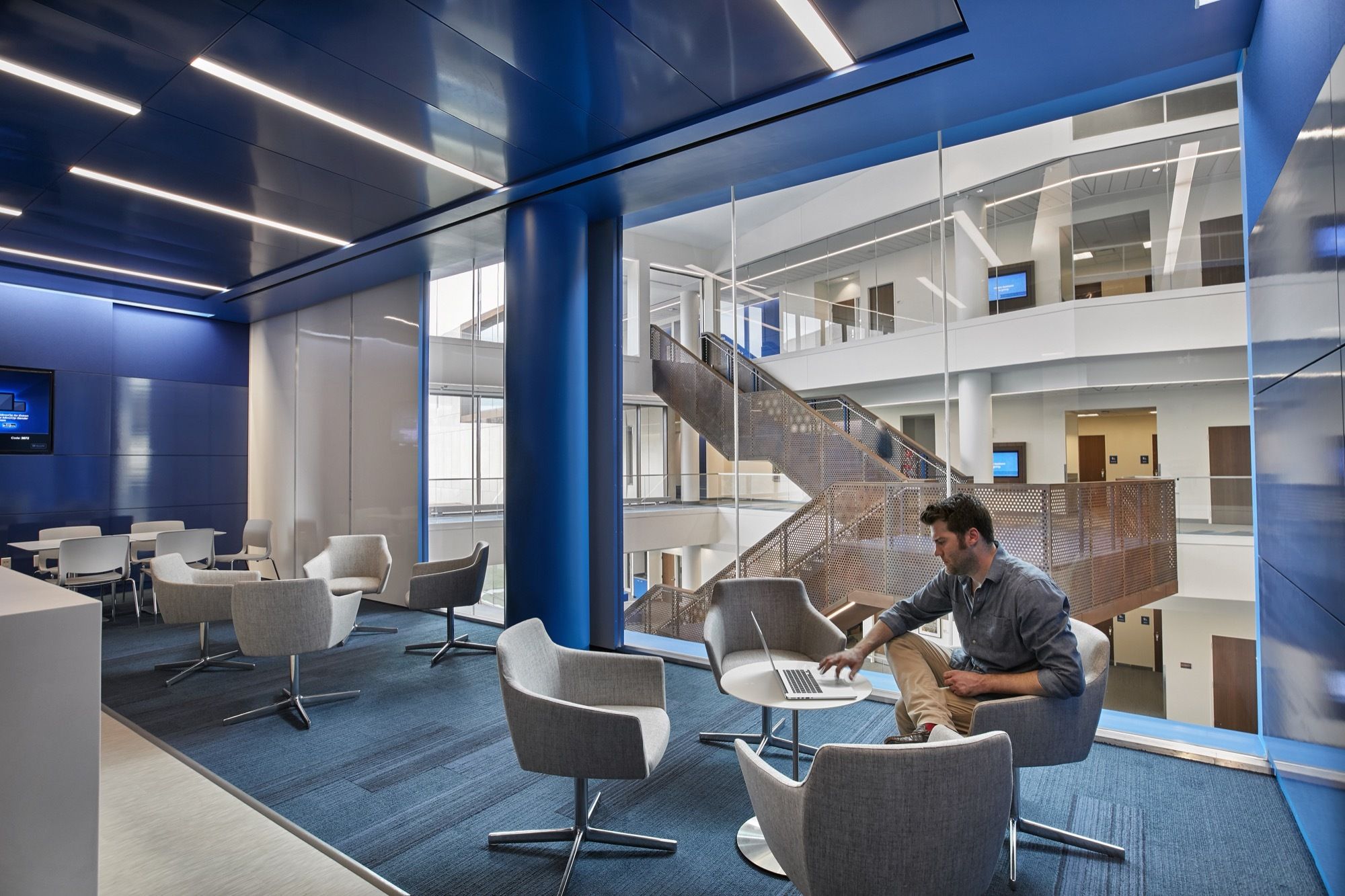 Louis Pasteur’s quote, “Chance favors the prepared mind,” served as inspiration to the design team. The team designed flexible interior spaces that offer cues to people using them, to motivate people to connect in new ways. The design engages students by inviting authorship and offering students choice and control over where and how they learn.