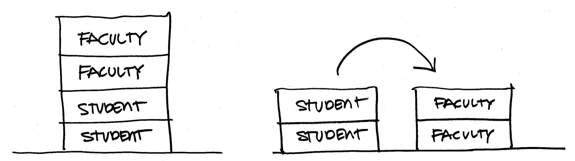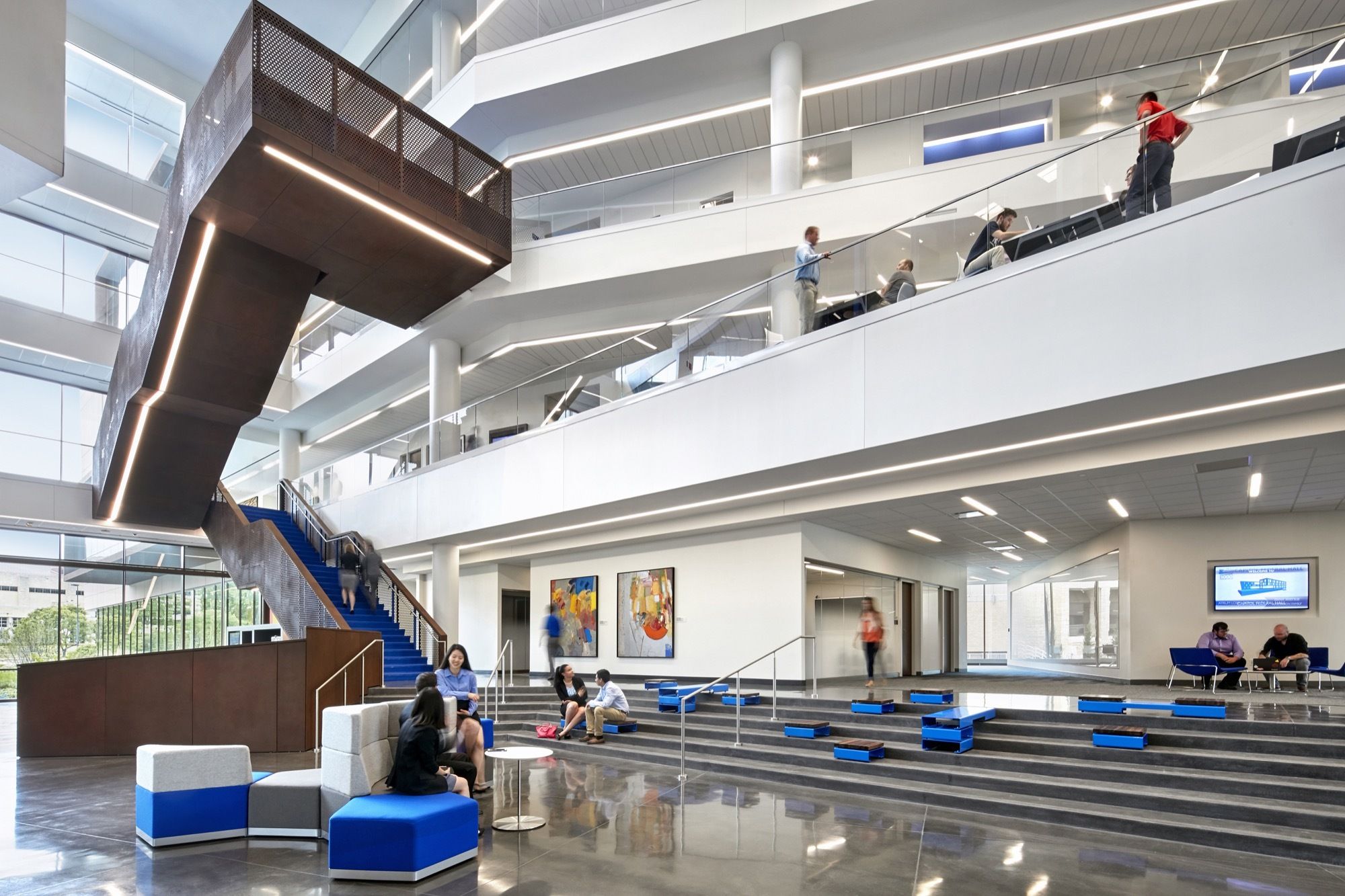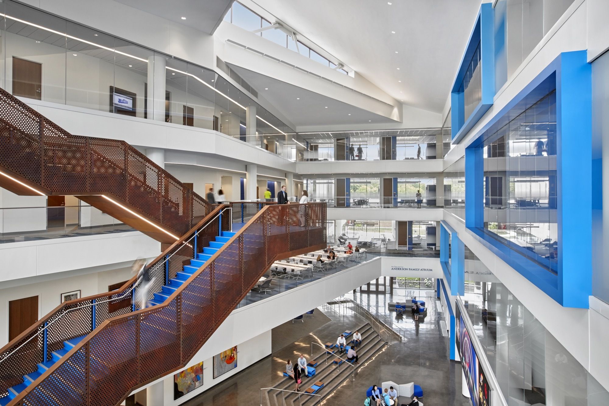 Designers realized that students and faculty had to see each other while going about their daily routines to promote new kinds of interactions. To that end, Gensler designers crafted sight lines to connect spaces that were previously isolated: faculty workspaces and student classrooms. Staggered floors and openings further drive a sense of awareness and continued connectivity.