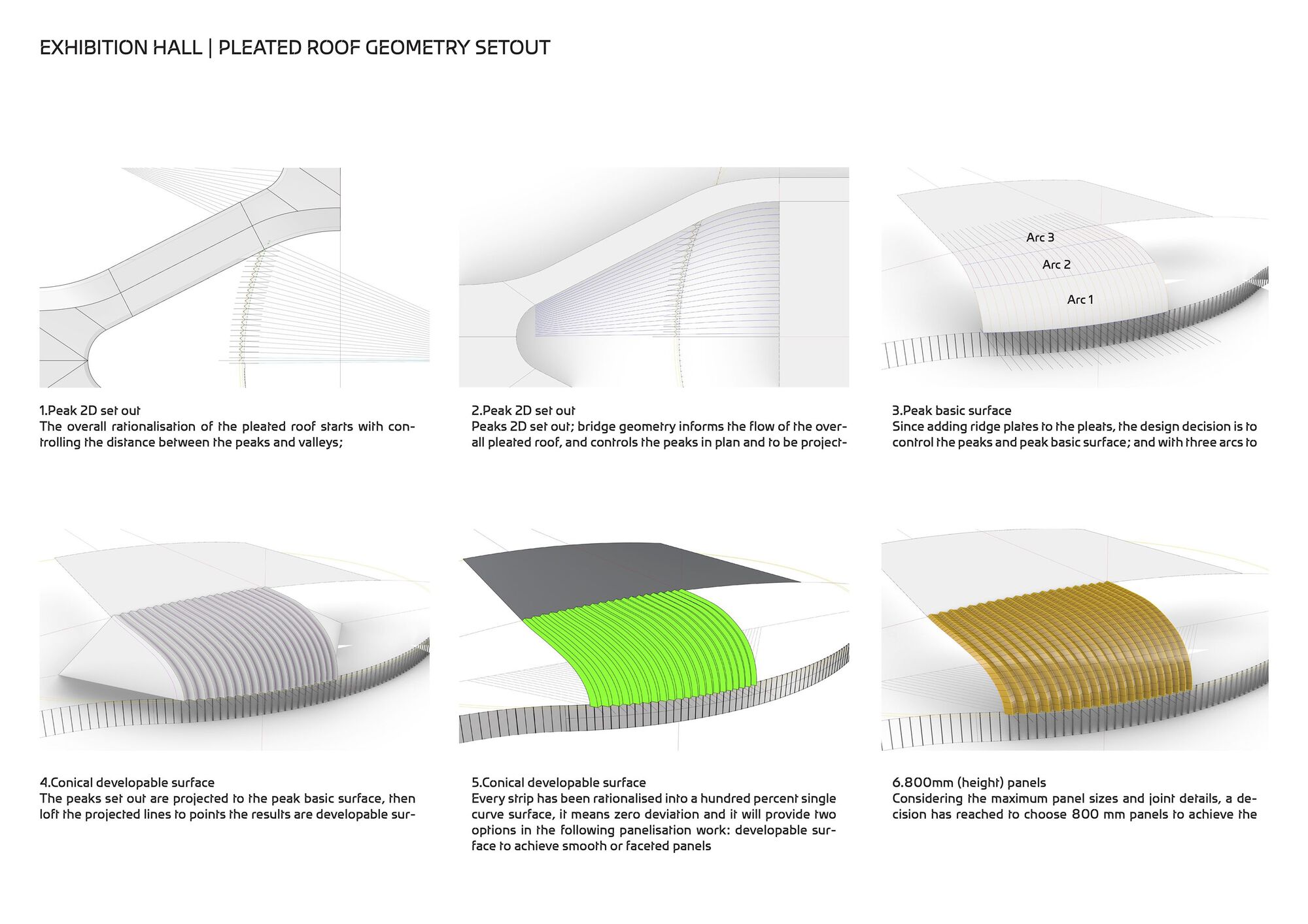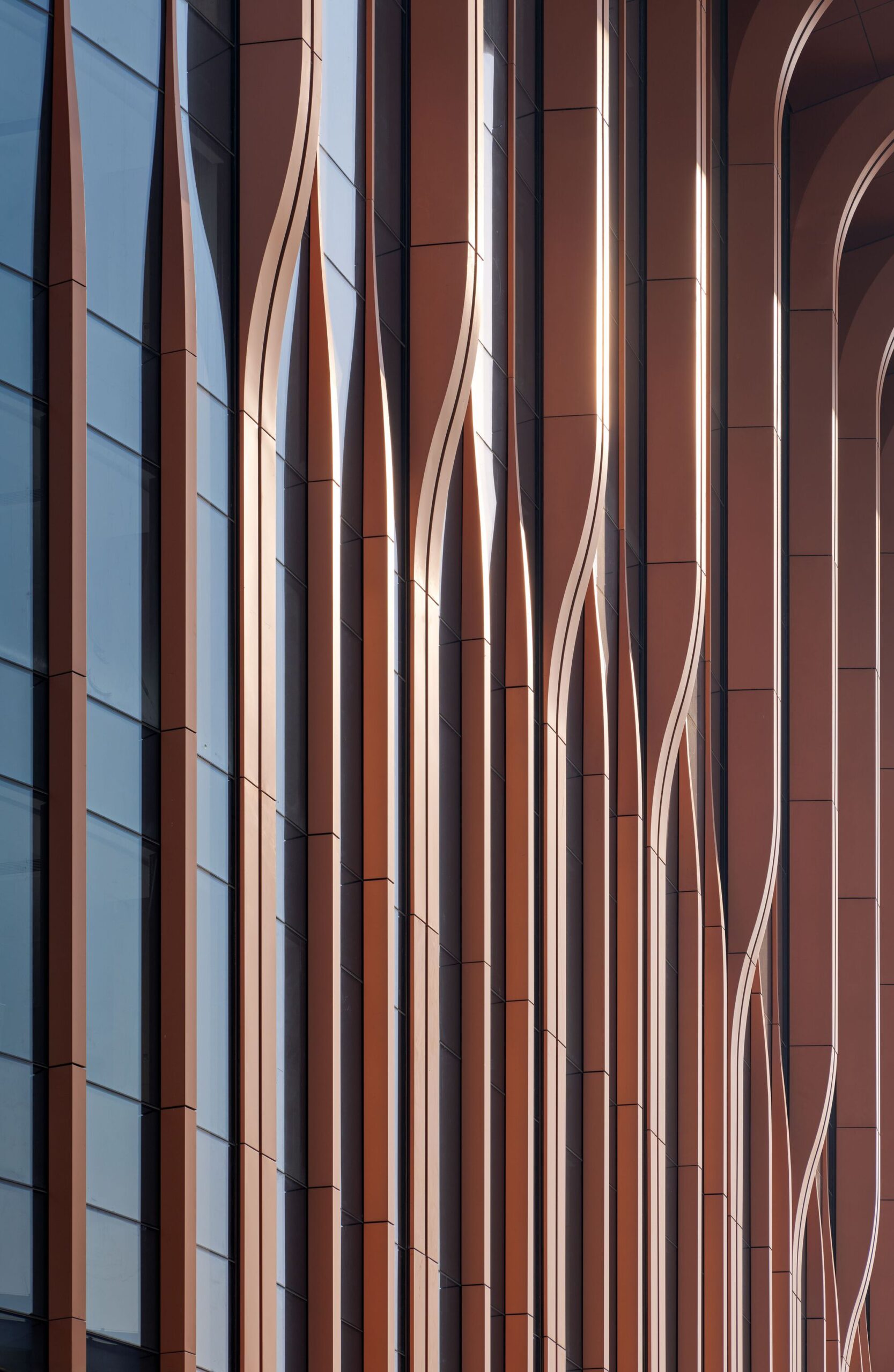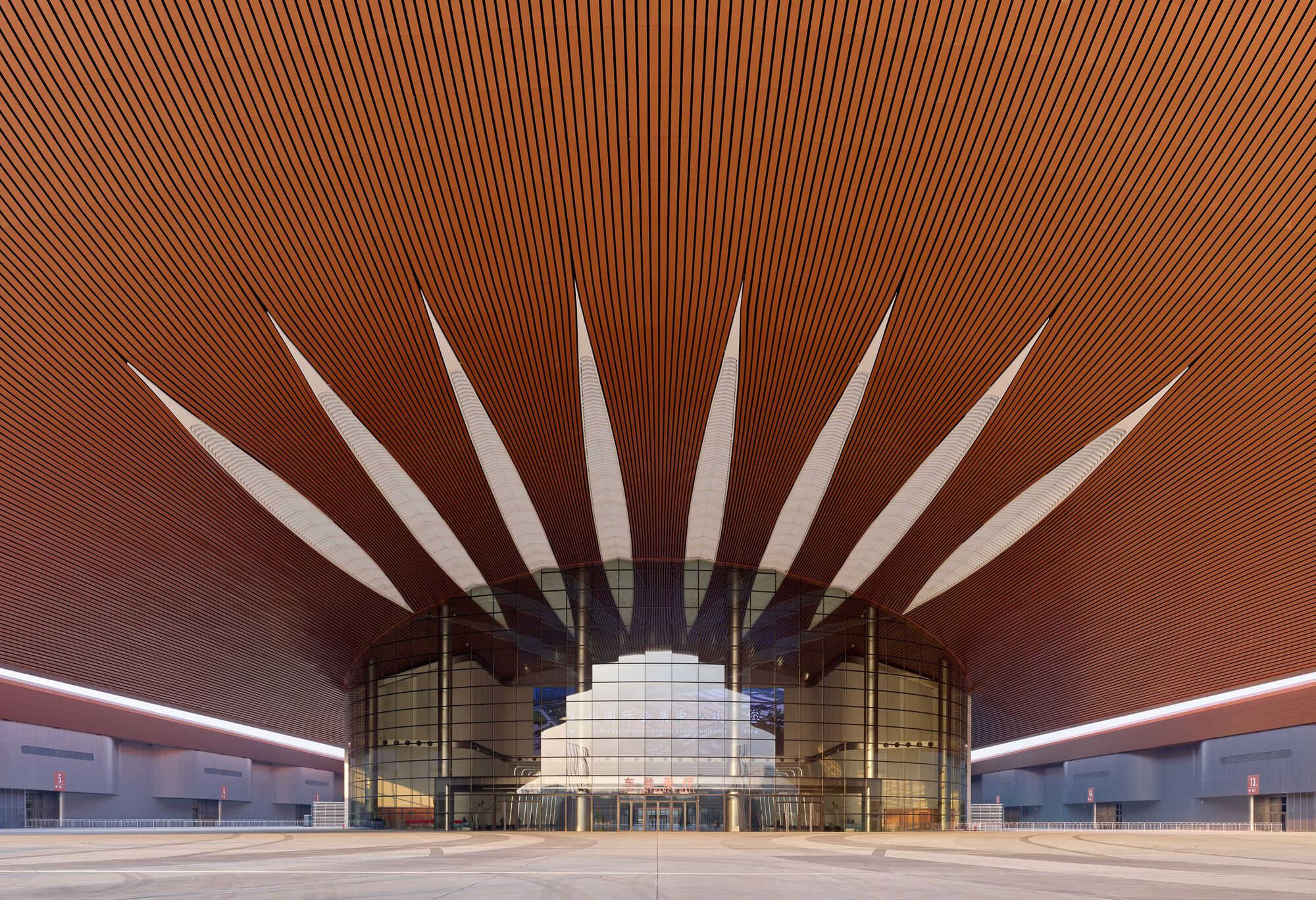 The CIECC’s composite roof system of symmetric geometries creates an insulated, lightweight, large-span structure providing column-free spaces that can be quickly adapted to changes in exhibitions and nature of use. This modular fabrication and construction minimized the center’s development time, investment, and operational costs. The center’s fluid architectural language and pleated, deep copper-colored façade incorporating large, recessed windows, have been designed to balance the CIECC’s immense industrial scale and materiality.