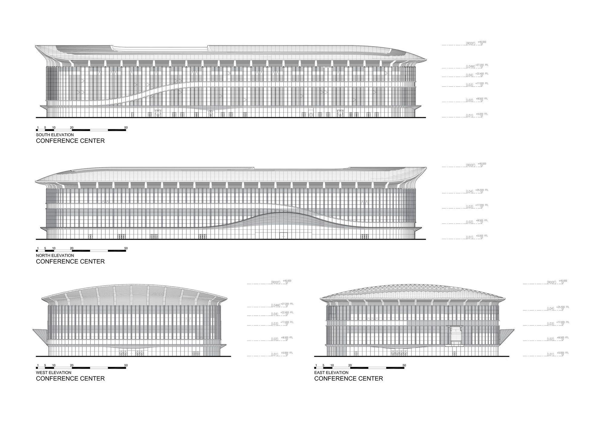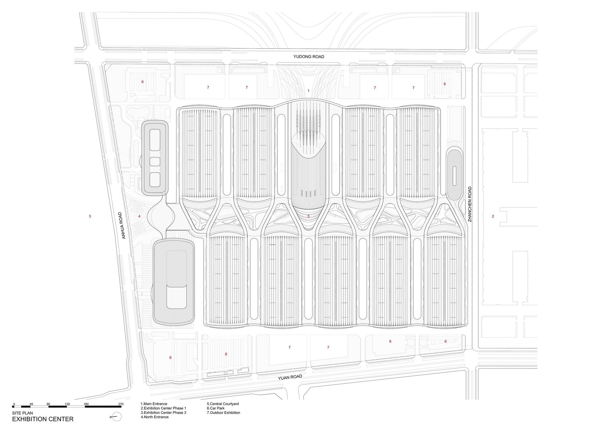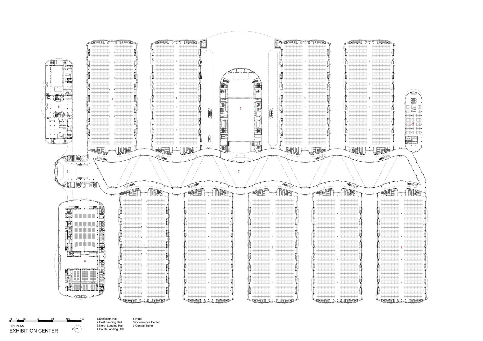 Conceived as ‘ribbons’ that weave together all the new facilities, bridges above this central courtyard also connect the exhibition halls, conference center and hotel, to provide indoor circulation between event spaces. The conference center and hotel are located to the north of the site, defining a new public square for exhibitions and events. The movement of people, goods, and vehicles throughout the CIECC is divided into three distinct routes to aid circulation, provide optimal adaptability and avoid disruption to different concurring events.