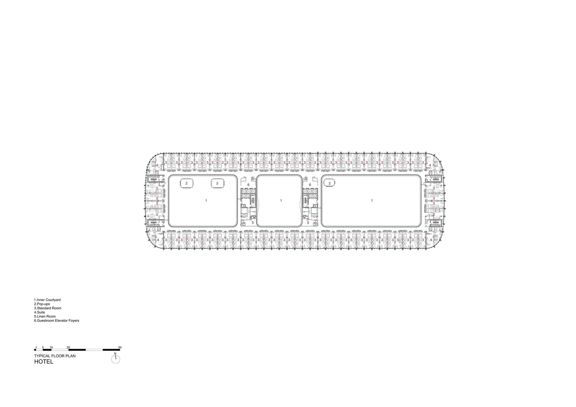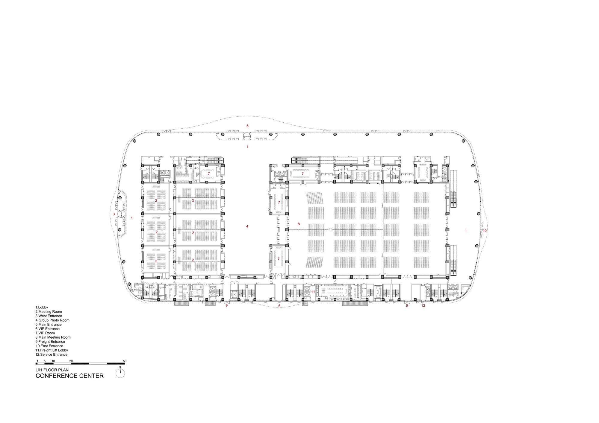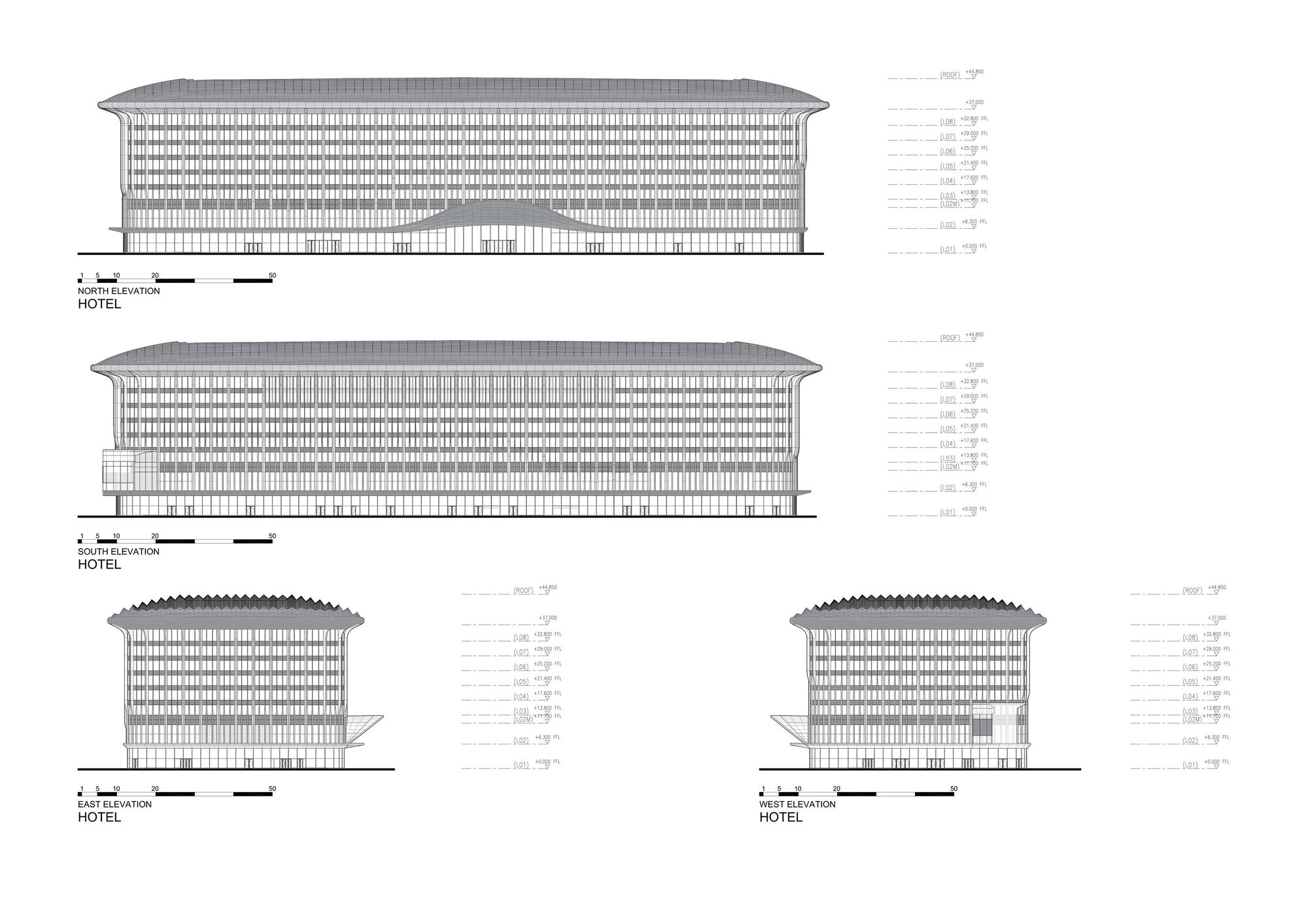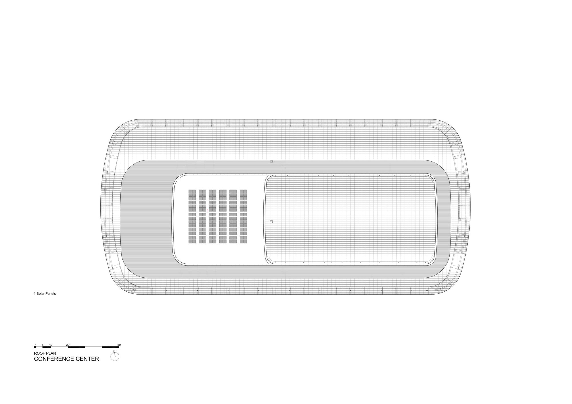 Conceived as ‘ribbons’ that weave together all the new facilities, bridges above this central courtyard also connect the exhibition halls, conference center and hotel, to provide indoor circulation between event spaces. The conference center and hotel are located to the north of the site, defining a new public square for exhibitions and events. The movement of people, goods, and vehicles throughout the CIECC is divided into three distinct routes to aid circulation, provide optimal adaptability and avoid disruption to different concurring events.
