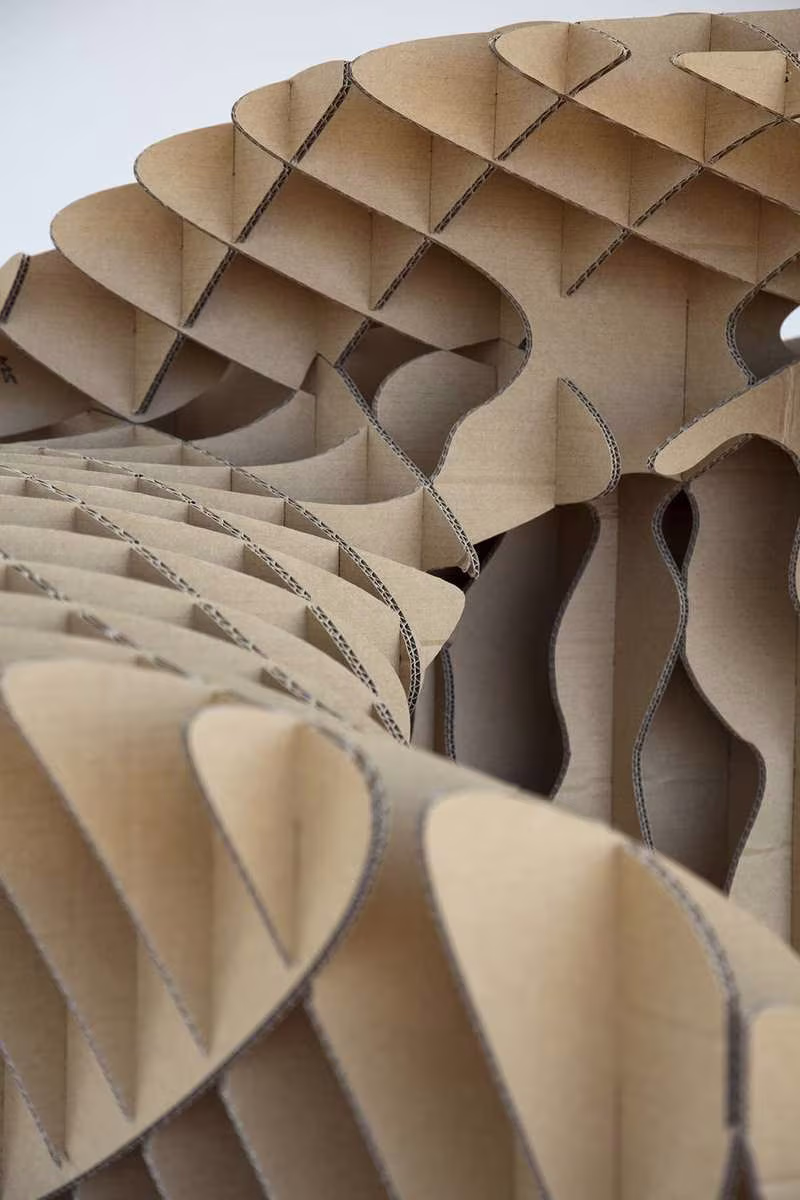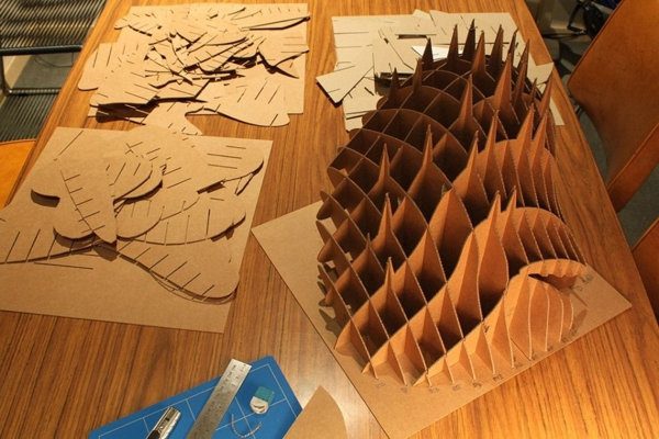 Attributes like stretching, twisting, squashing and pulling were then overlaid on the model to create an abstract icon and then sliced into many layers to form a kit of parts. The designer also uses cardboard as the material for the installation as it is an ideal medium for temporary displays. Each layer was then manufactured using CAD/CAM technologies and the final design was produced to be flat packed for transport.