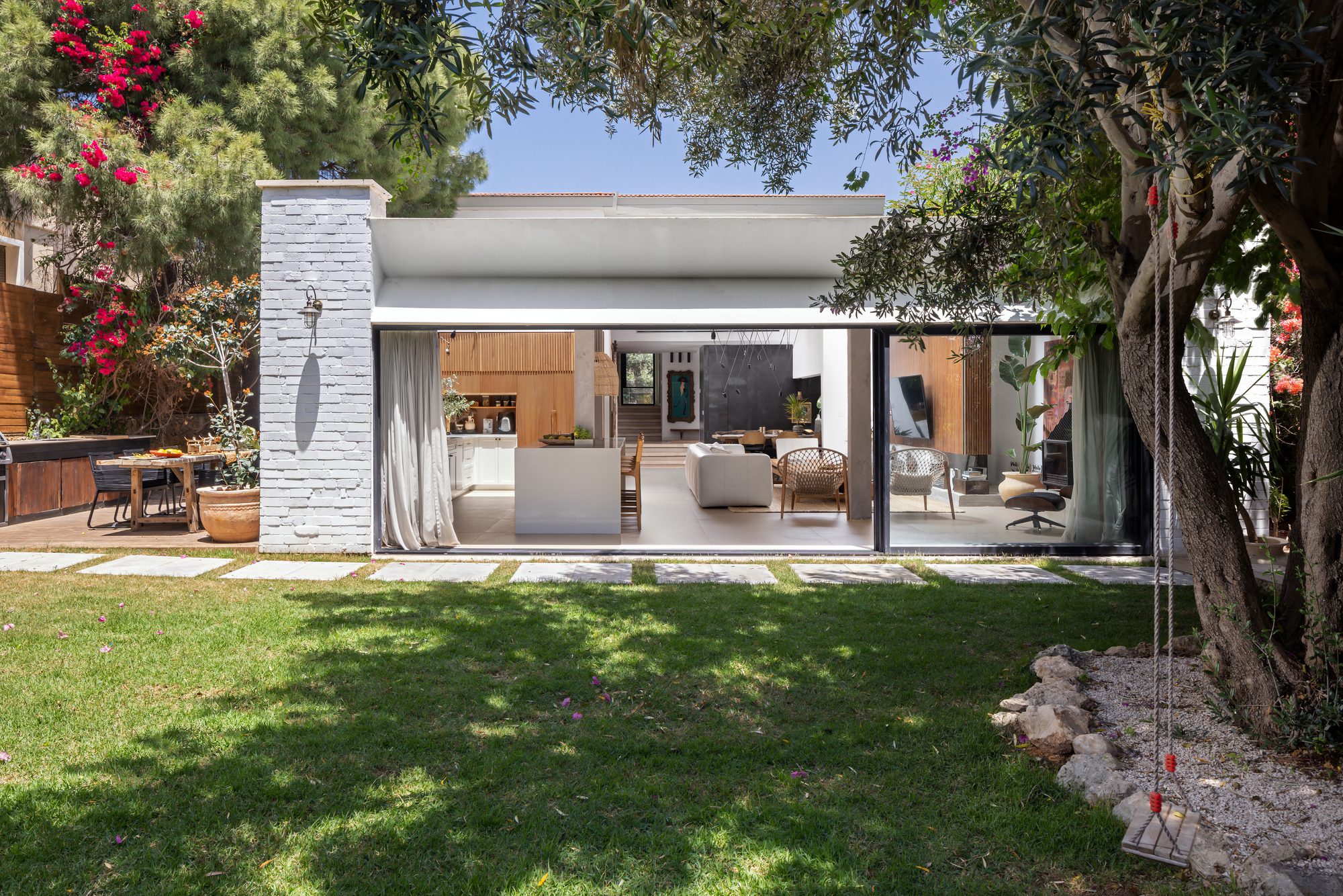 The house is crossed by a long longitudinal axis, it connects the front garden to the back. thus, emphasizing the depth dimension of the house. This main axis is illuminated thanks to the glass windows that were opened on both sides. The concrete roof is a remnant that remains from the original house and was sloping due to the tiled roof that was above. It is now hidden by a painted tin wind box to give the house character and a contemporary look. The whole house is covered with bricks from the dismantling of a house that burned down in Belgium and was shipped to Israel.