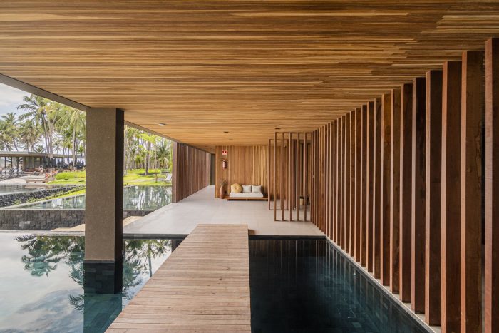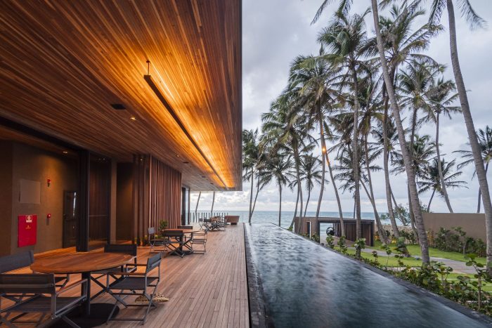 To make the most of pre-existing natural resources visually, the large communal swimming pool, with organic shapes, opens to the sea view, whose horizon is unified with the line of the infinite border, through which the water overflows. It is also in this perspective that one can contemplate the sunrise and sunset. Other generous bodies of water are laid out in the garden, such as the reception’s reflecting pool, which unites the curved shapes of its waterfall to a more regular geometry, since it is integrated with the building’s alignments. The reflecting pool around the spas, this one only with an orthogonal shape, at the same time that the floating steps and planters allow a freedom of flow of the users along its surface. Even when it comes to fire as a central element, in the lounge lowered to the outdoor fireplace, there is an immersive experience of being surrounded by water.