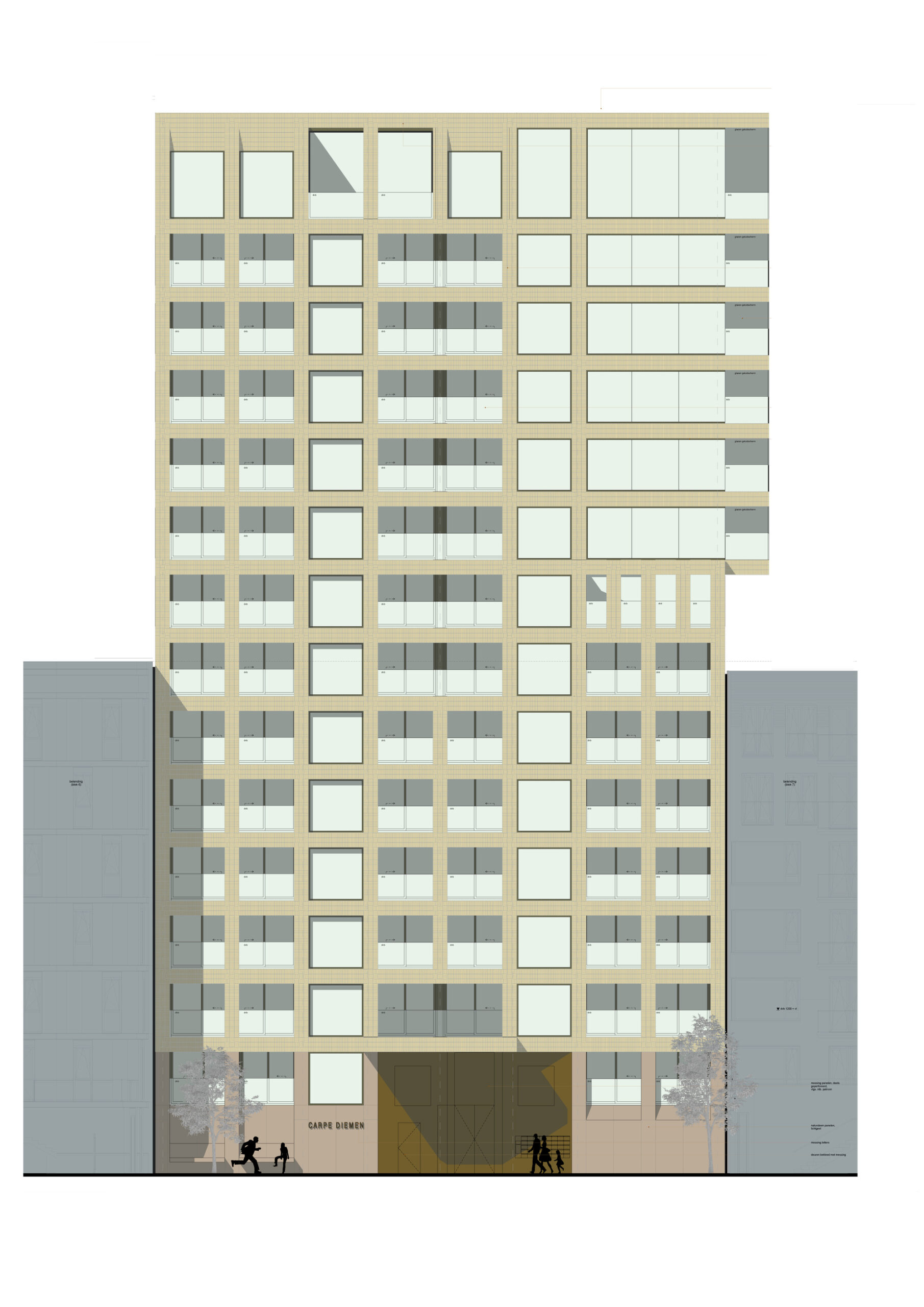 Carpe Diem Apartments, Architecture. It had to be a striking tower, which is a beacon in its area but also offers shelter to the Karel Appelhof square. Carpe Diem is therefore inspired by the towers in the beautiful medieval Italian San Gimignano. Towers that have grown over time to trump the neighboring buildings in prestige and beauty. That is how our quest towards, an architectural composition in which the different scale levels of the neighborhood and the place merge, started. With attention to detail and the human scale.