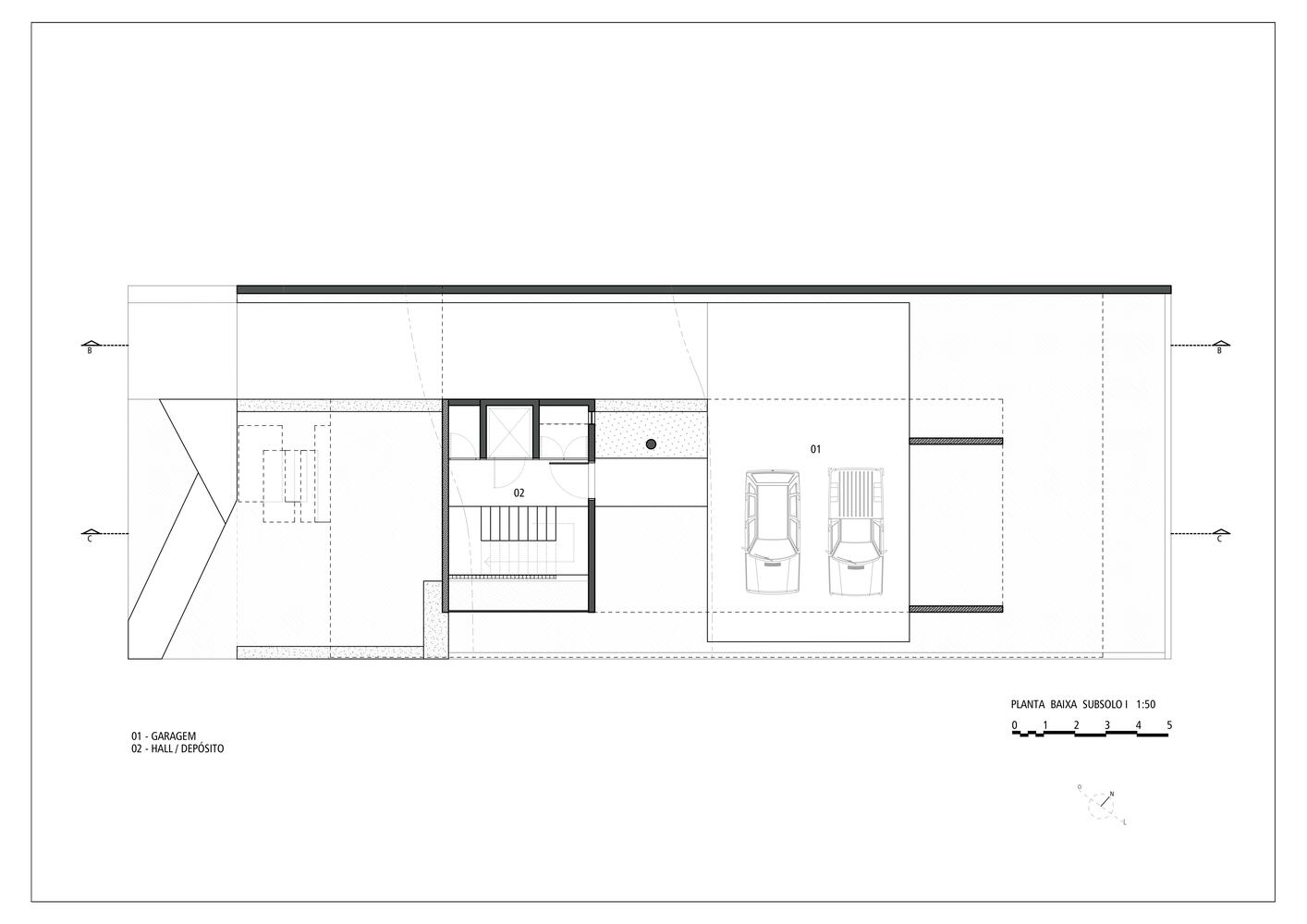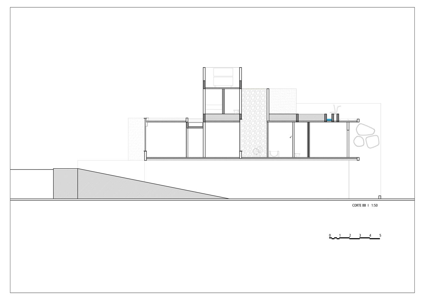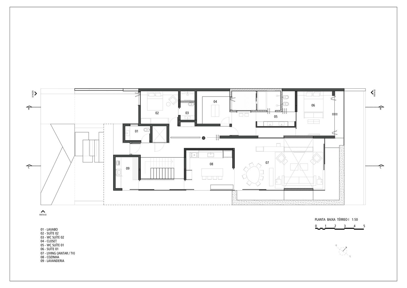 In seeking the proportion of the house to the land, with the lightness of the reinforced concrete structure and delicate proportions to create a connection with the area of native vegetation adjacent to the plot, the effort of rhizomatic thinking was present; we recessed the beams, from which a technical solution emerged. For those outside, it provides the experience of a linear view of the two slabs that seemingly appear in a clean and light cantilever. For summer days, a rooftop pool offers a view of the sunset, glimpsing the ephemeral orange that departs, taking the day with it. What could have become an obstacle in the project brought a solution: the depth of the pool shapes the ceiling of the TV room, with a cozier ceiling height, embracing the house in everyday comfort. Then, in small diagrams on paper on the table, the three fundamental areas that traverse the plot emerged. In the basement, taking advantage of the topography with a three-meter drop: circulation and garage; in the core of the house: the heart, the common area that opens to the side forest; and in a rectangle, the intimate area. Finally, on the rooftop, the leisure area that does justice to the lookout housing the pool, gardens, and the contemplation of freedom.