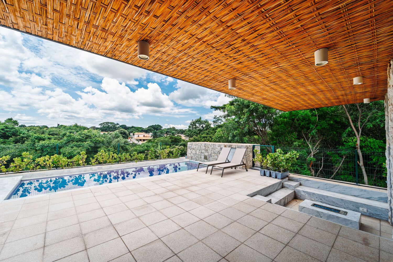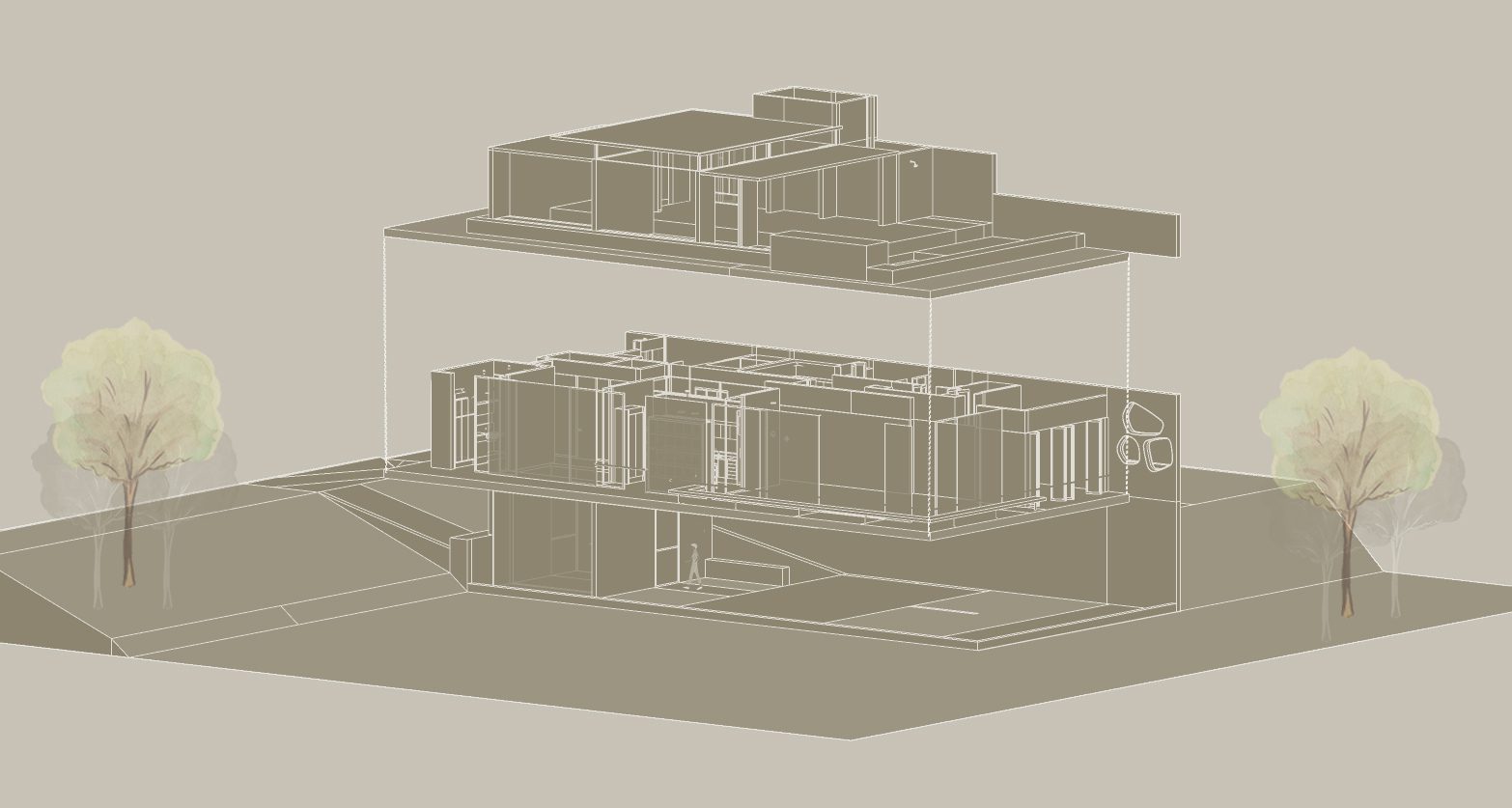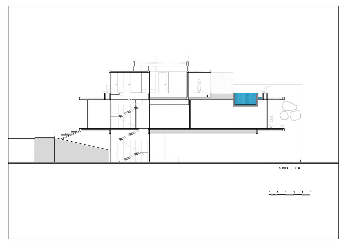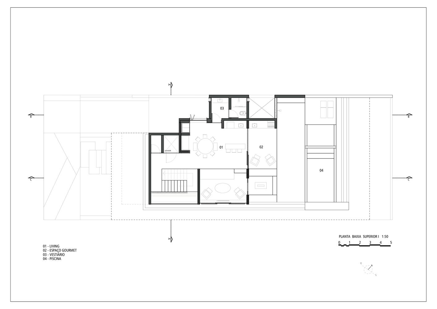 In seeking the proportion of the house to the land, with the lightness of the reinforced concrete structure and delicate proportions to create a connection with the area of native vegetation adjacent to the plot, the effort of rhizomatic thinking was present; we recessed the beams, from which a technical solution emerged. For those outside, it provides the experience of a linear view of the two slabs that seemingly appear in a clean and light cantilever. For summer days, a rooftop pool offers a view of the sunset, glimpsing the ephemeral orange that departs, taking the day with it. What could have become an obstacle in the project brought a solution: the depth of the pool shapes the ceiling of the TV room, with a cozier ceiling height, embracing the house in everyday comfort. Then, in small diagrams on paper on the table, the three fundamental areas that traverse the plot emerged. In the basement, taking advantage of the topography with a three-meter drop: circulation and garage; in the core of the house: the heart, the common area that opens to the side forest; and in a rectangle, the intimate area. Finally, on the rooftop, the leisure area that does justice to the lookout housing the pool, gardens, and the contemplation of freedom.