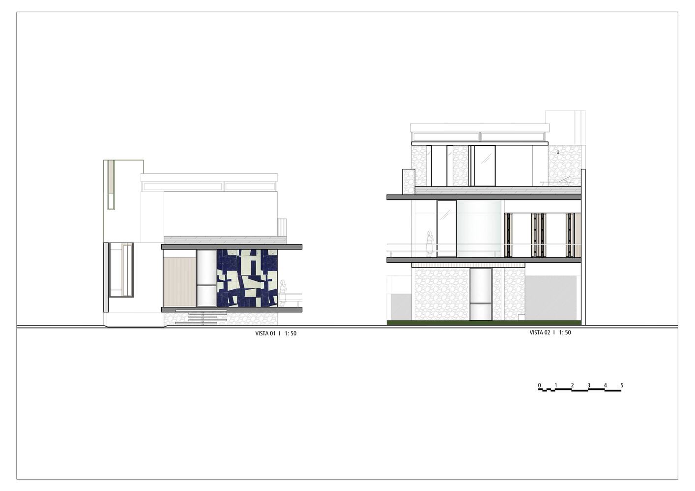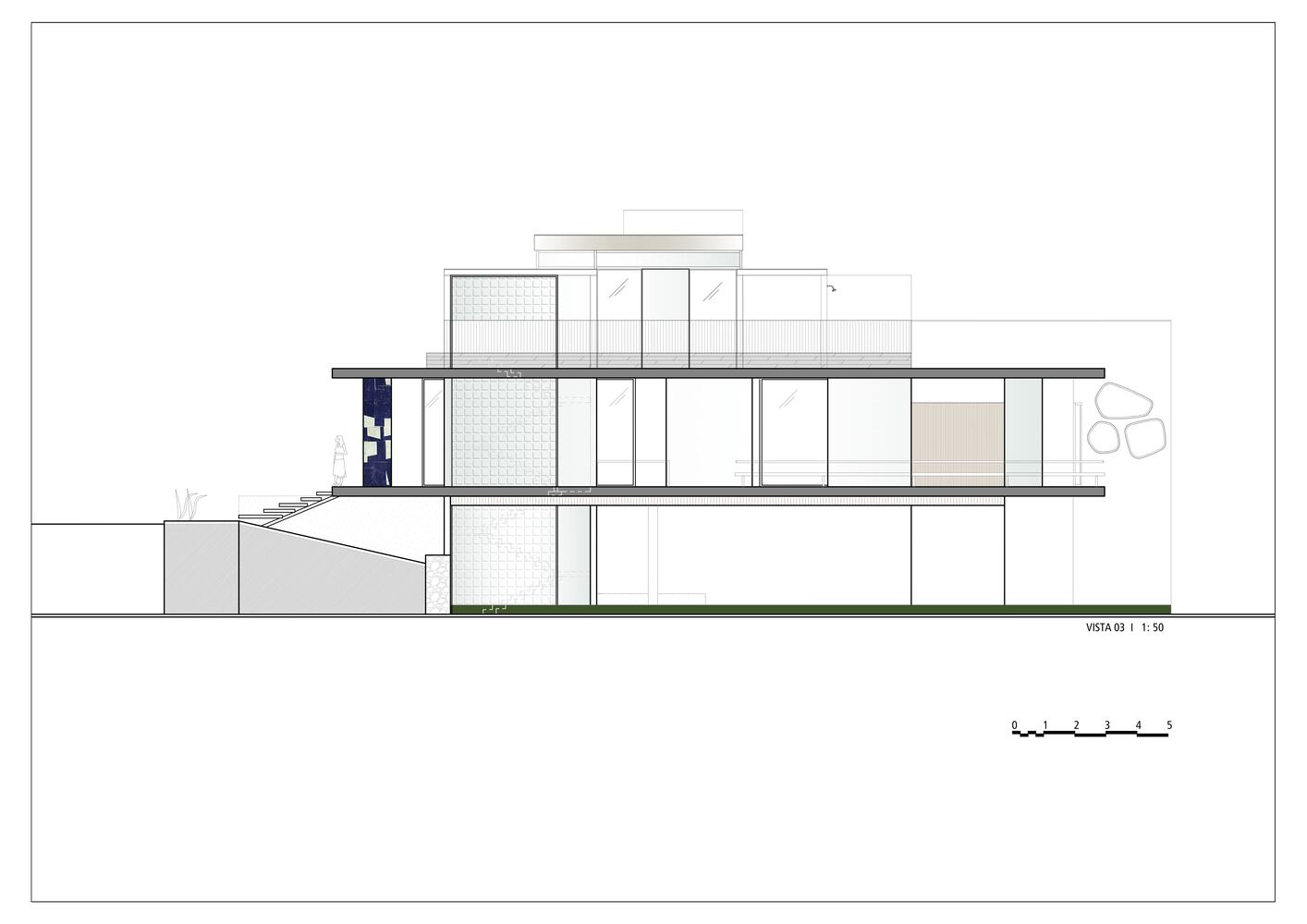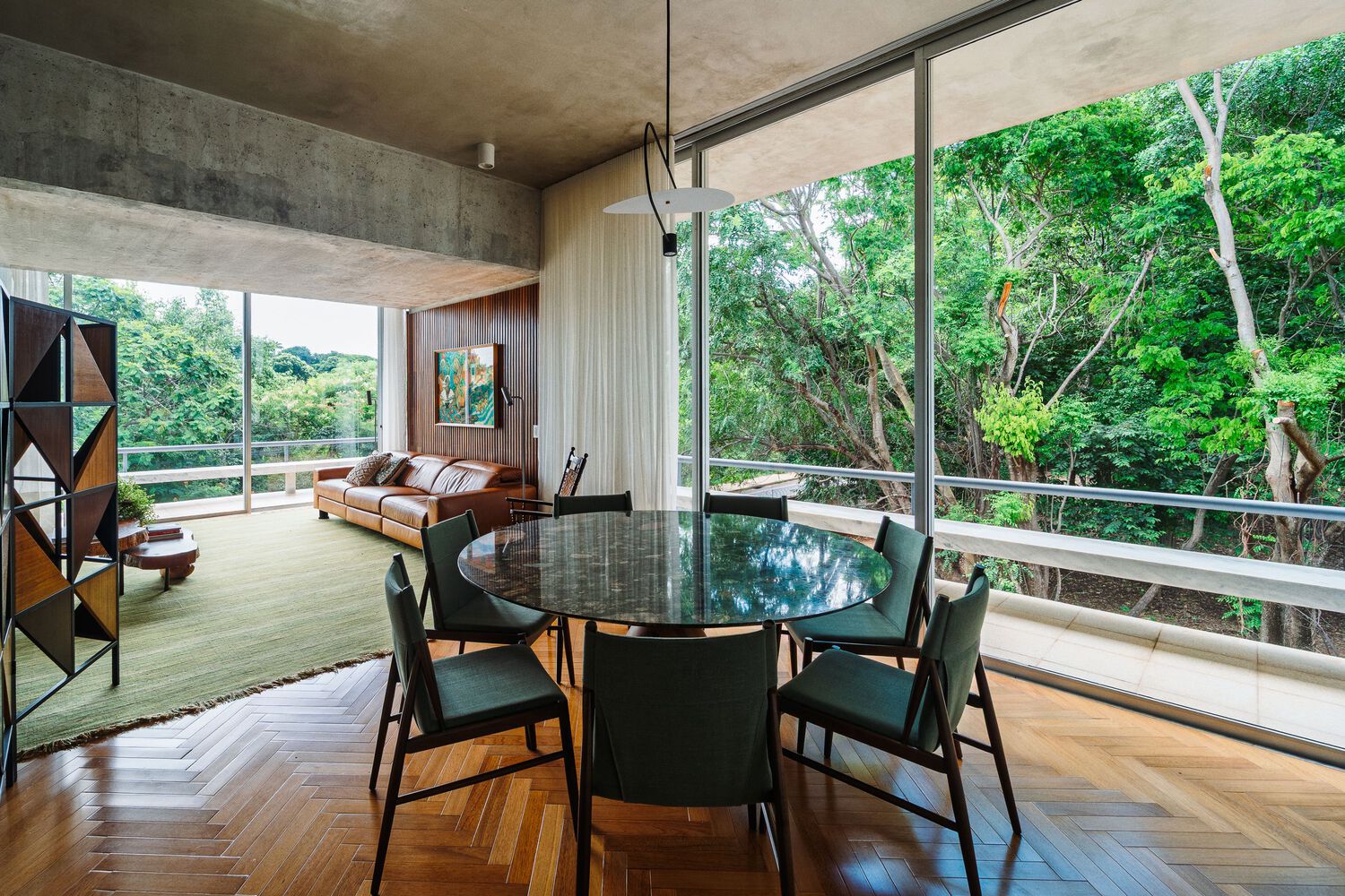 Three, a numerical symbol that inhabits the horizon of connections. The forest house “Casa da Mata”, with its three floors, hides among the vegetation while simultaneously opening up to it. Through its recessed glass, the observer contemplates the surroundings, and as they wander, they traverse long patios that connect the interior and exterior simultaneously. On a 12×30 meter plot, with setback requirements and the dream of a construction that encompasses the client’s entire program of needs, we faced a challenge that transformed into a production of meanings, textures, and studies.