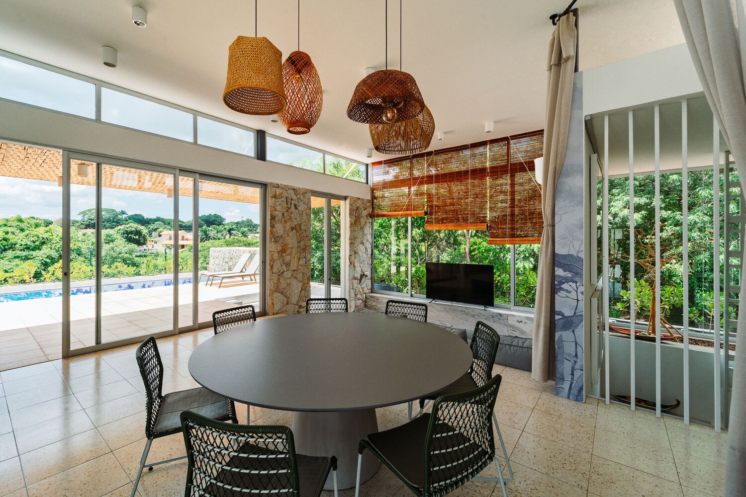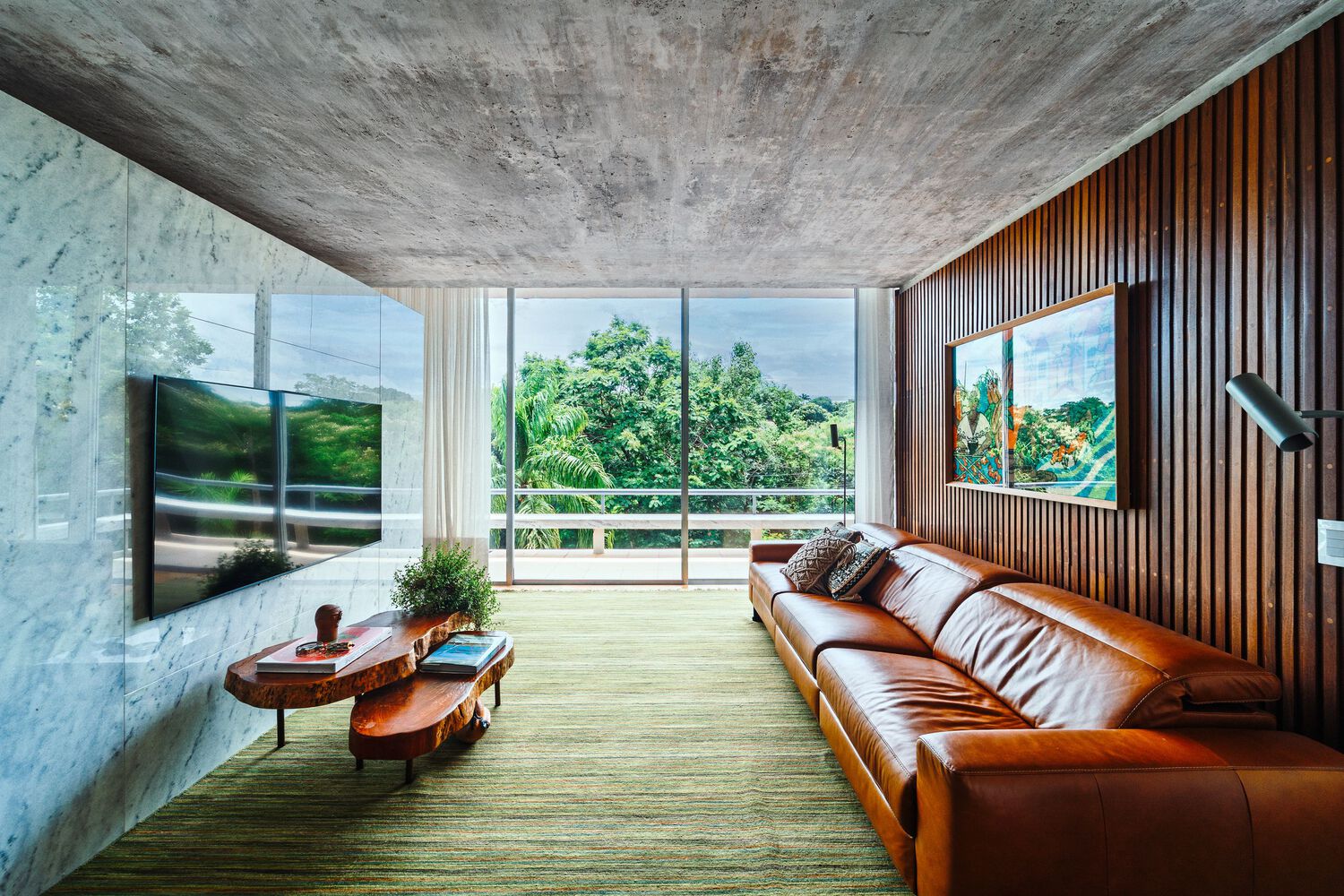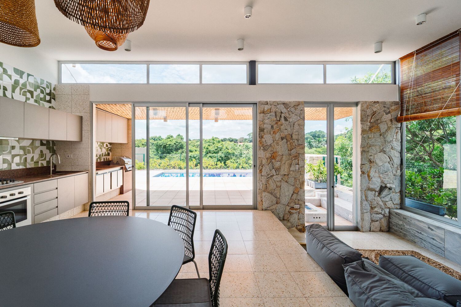 Three, a numerical symbol that inhabits the horizon of connections. The forest house “Casa da Mata”, with its three floors, hides among the vegetation while simultaneously opening up to it. Through its recessed glass, the observer contemplates the surroundings, and as they wander, they traverse long patios that connect the interior and exterior simultaneously. On a 12×30 meter plot, with setback requirements and the dream of a construction that encompasses the client’s entire program of needs, we faced a challenge that transformed into a production of meanings, textures, and studies.