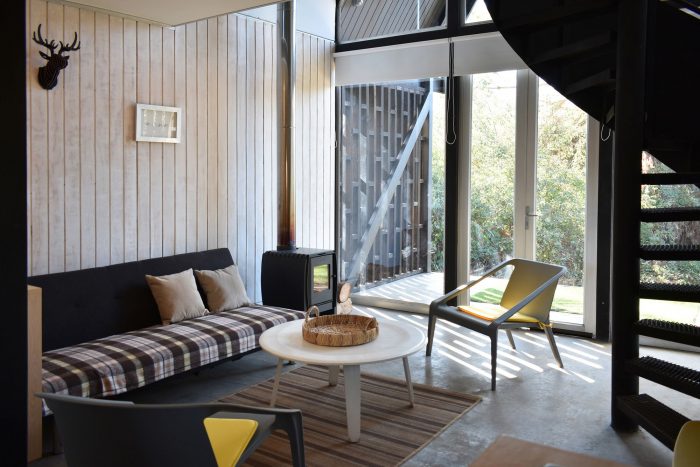 The specific program of this house, distributing the modules in two floors is the following: On the first floor is the woodshed and ‘chiflonera’ for accessing the cabin, then come the services such as kitchenette, bathroom and ends in the living-dining-terraces. On the second floor is the master bedroom, the living room and a work desk. As this is a holiday home, it has roofed terraces for winter and open for summer. It should be mentioned that in the perimeter of the house, it could be distributed from 1 to 3 more bedrooms.