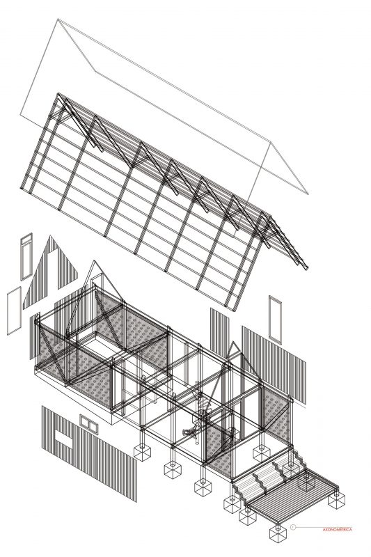 It was planed to modulate designed and prefabricated volumes of 2×4 and 3×4 mt, in response to the dimension of the iron (6 mt) and this way not having material losses. These modules are added side by side in open plan or open space, so they are attached to the main module that is the one of services like bathrooms and kitchenette, but without walls. The modules used in this cabin are 4, and some are repeated; Module A closed for Sanitary Services; Module B open for leisure on terraces and for woodshed; Module C open for bedrooms; and Module D for stairs or complement living spaces.