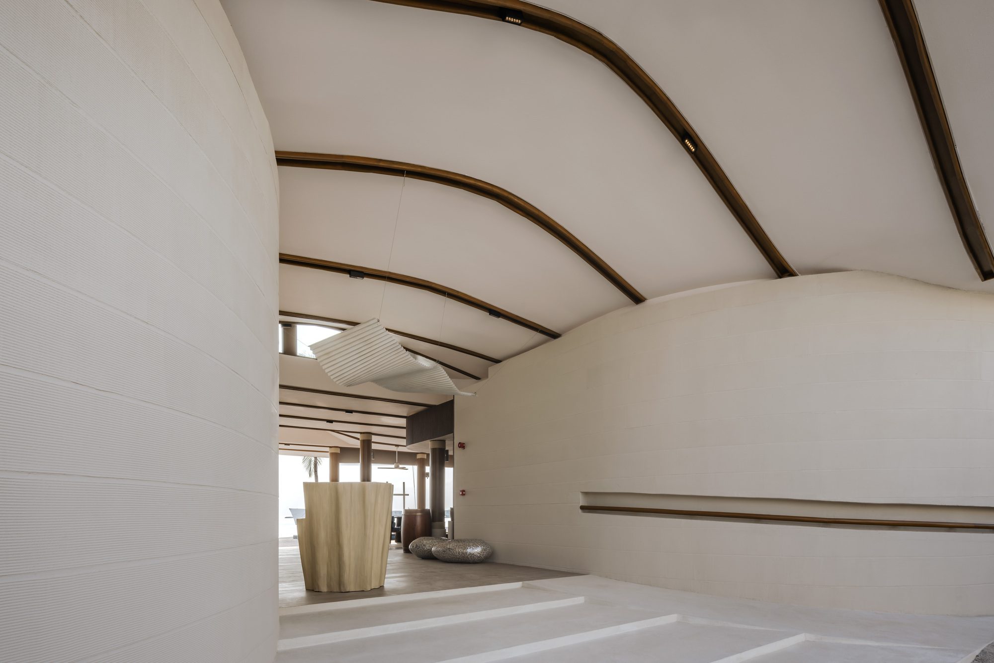 Rather than define the island with built form, the architecture amplifies what is already there. Privacy walls curve gently to shape each villa into a personal sanctuary—creating seclusion without cutting off views. These walls guide attention outward, subtly orienting the guest toward the horizon. Materials such as textured paint echo the tones of beach sand, blurring the boundary between structure and landscape. Skylights draw natural light deep into interiors, while timber details introduce warmth, tactility, and a sense of tropical ease.