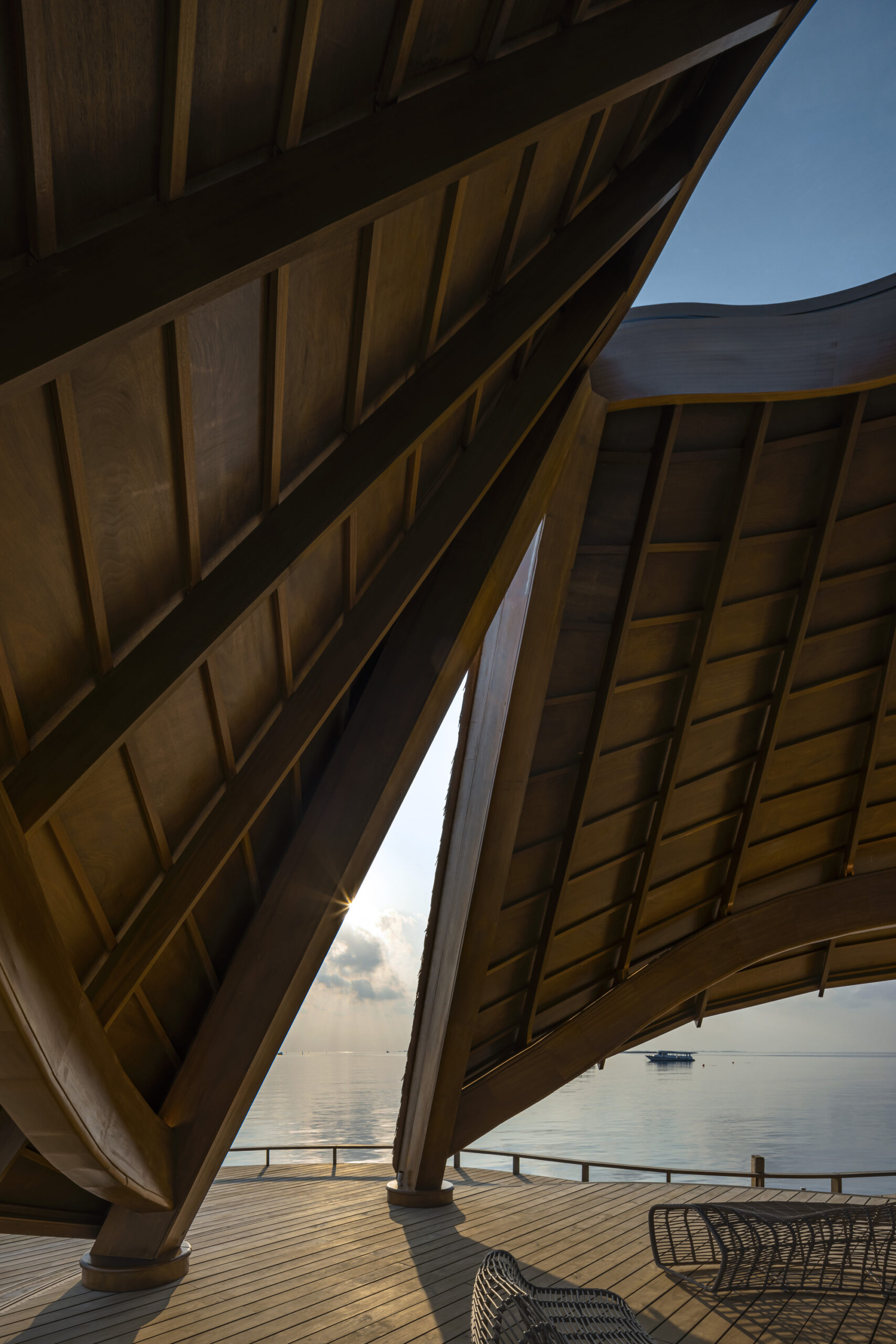 The architecture across the island is unified by a series of recurring gestures that deepen the experience of place. Rooflines taper into palm canopies, walls lean gently with the breeze, and windows become calibrated lenses that highlight sunrises, ocean tides, and shifting skies. Even the transitional spaces—the corridors, bridges, and open walkways—are treated with equal intention, ensuring the guest journey remains immersive and connected throughout.