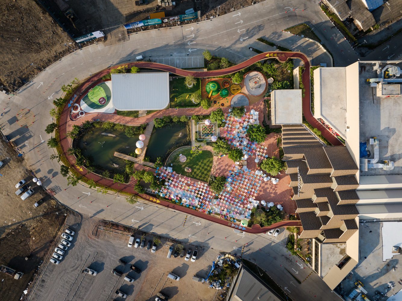 It is set on a 45-rai land plot with a total building area of 140,000 square meters. The project forms part of a larger mixed-use compound, with retail components positioned at the front of the site and a residential development situated toward the rear. Rather than beginning with the building mass, the design process began with the open spaces. At its heart, a central green park serves as the primary anchor, responding directly to the community’s need for accessible public space. This notion of openness extends across the site through the introduction of two additional squares, each supporting different types of activity. These public spaces are unified by a main circulation spine that establishes a clear, continuous pedestrian journey from the main entrance through to the park. Retail units line this spine, fostering a seamless interface between commercial programs and the public realm. The circulation itself is conceived as a closed loop, offering an uninterrupted, exploratory experience. The project integrates both fully air-conditioned indoor environments and semi-outdoor spaces with natural ventilation, providing users with adaptable settings responsive to varying climate conditions.