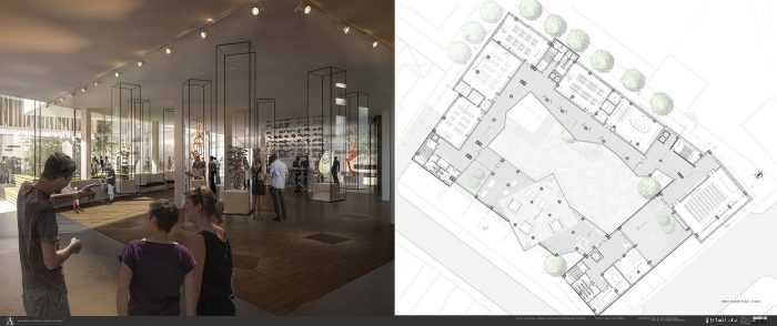 Within passage entrance are found the info points and the foyer with thematic exhibition space leads to multifunctional hall located on the first floor.