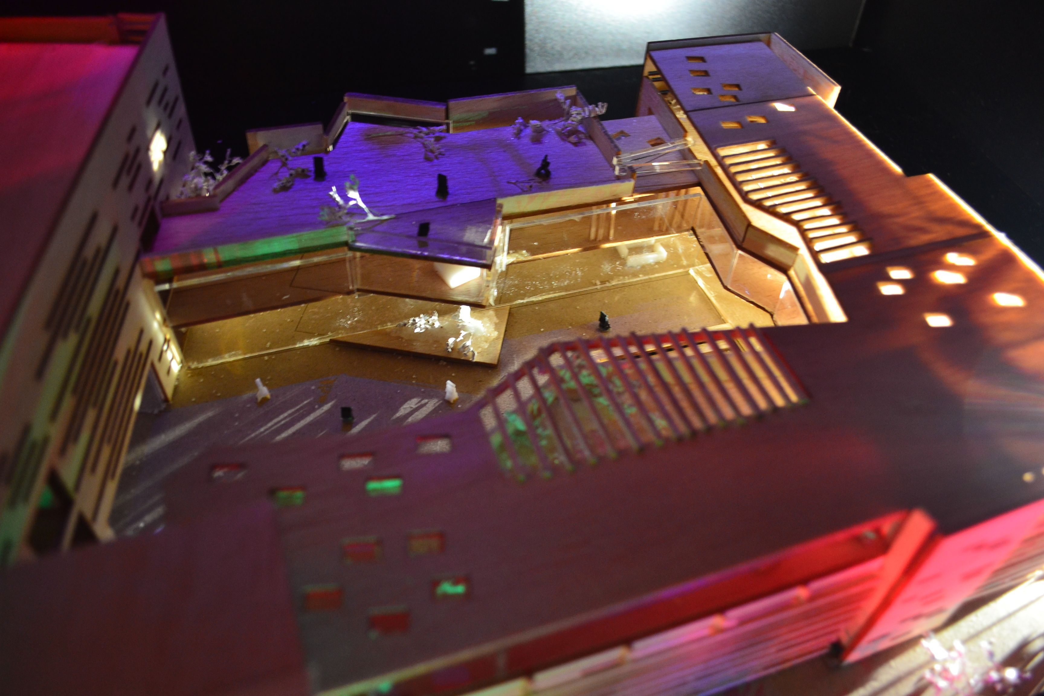 The building has an introverted character and decreases with height as it enters the island and fragmenting, relating to the surrounding tissue. The main facade is designed to screen the City Hall, and takes the idea of the passageway which is found on the site. Also, the greenery shapes my building, penetrating building in various forms.