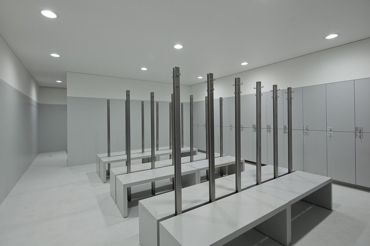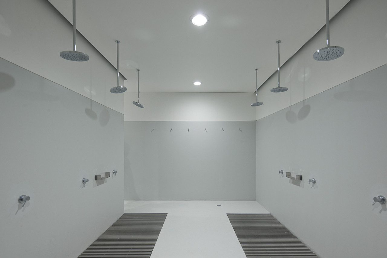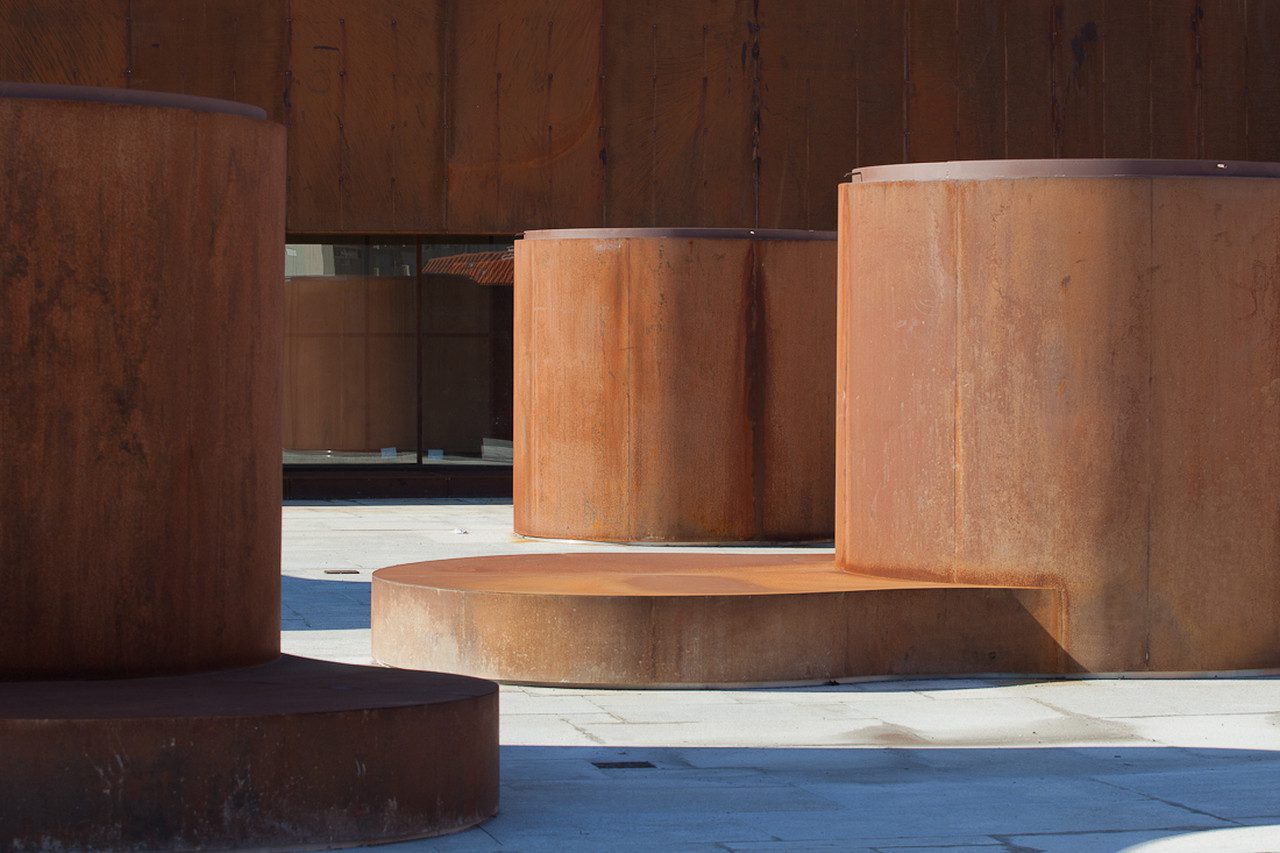 The Pavilion, in its weathering steel, anchors the rest of building, projecting out over steps and the plaza. Located within are shower and changing facilities for the gymnasium below, a multi-purpose room and an auditorium for 120 people.