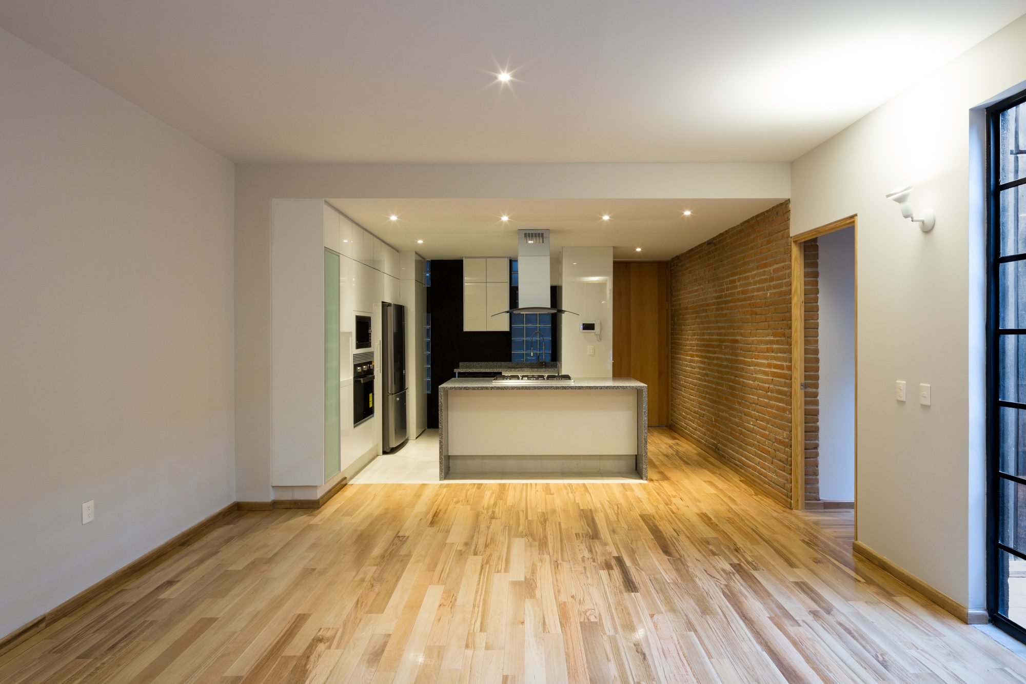 The project consists of 10 houses plus a commercial place on the ground floor. The criterion of free floor is fundamental to maximize the area and optimize the architectural program for each house, the spatial relationship between exterior and interior is achieved by means of floor to ceiling windows that connect the patios and balconies with public areas such as living room and dining room of each house. This allows to maximize the lighting and natural ventilation throughout the space.