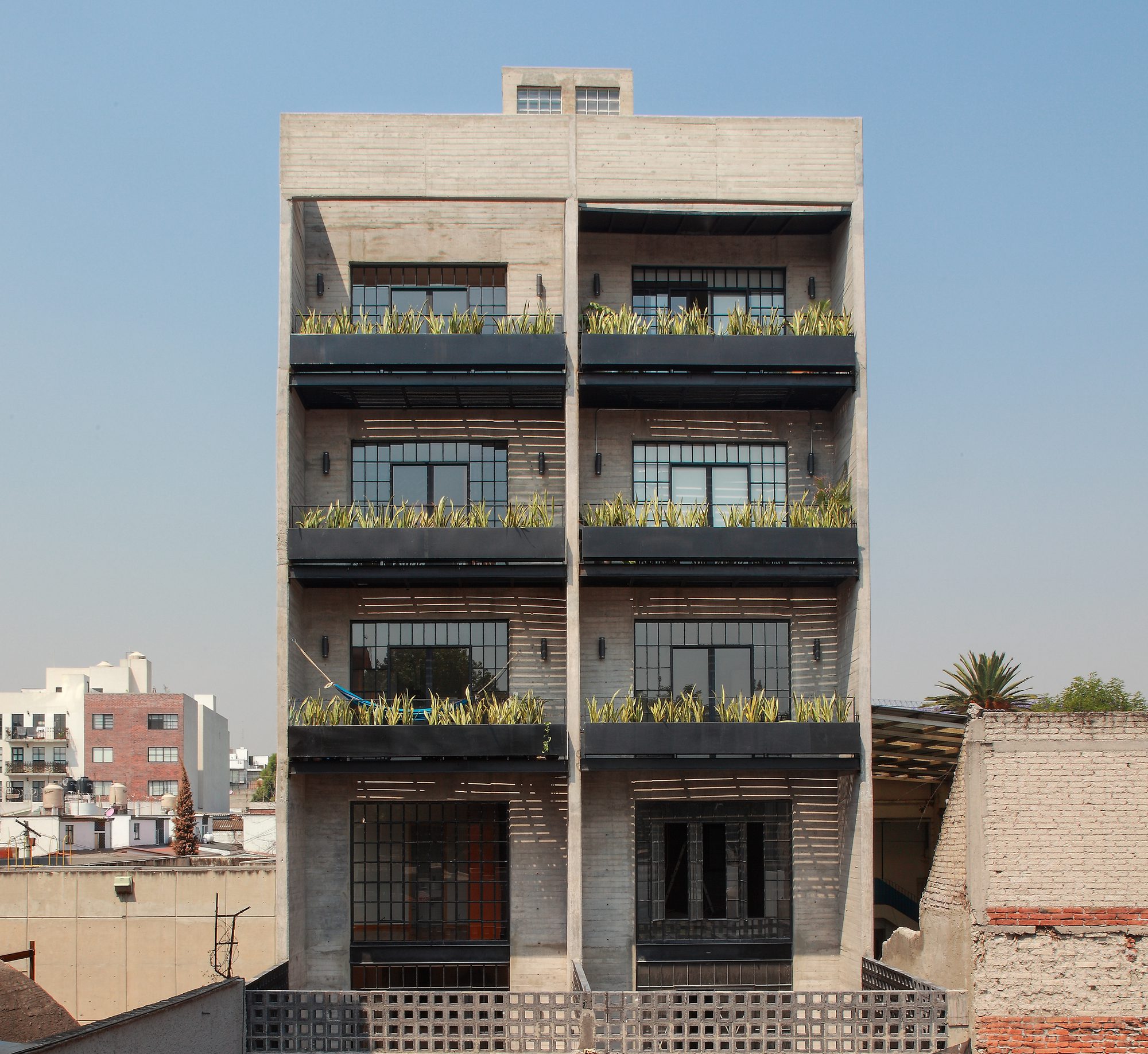 The interior circulation in each dwelling is a very frank longitudinal axis that distributes to the different spaces. The building is built with black block walls and black concrete walls on the side cut to stiffen the structure and apparent concrete panels to frame the balconies on the East and West facades.
