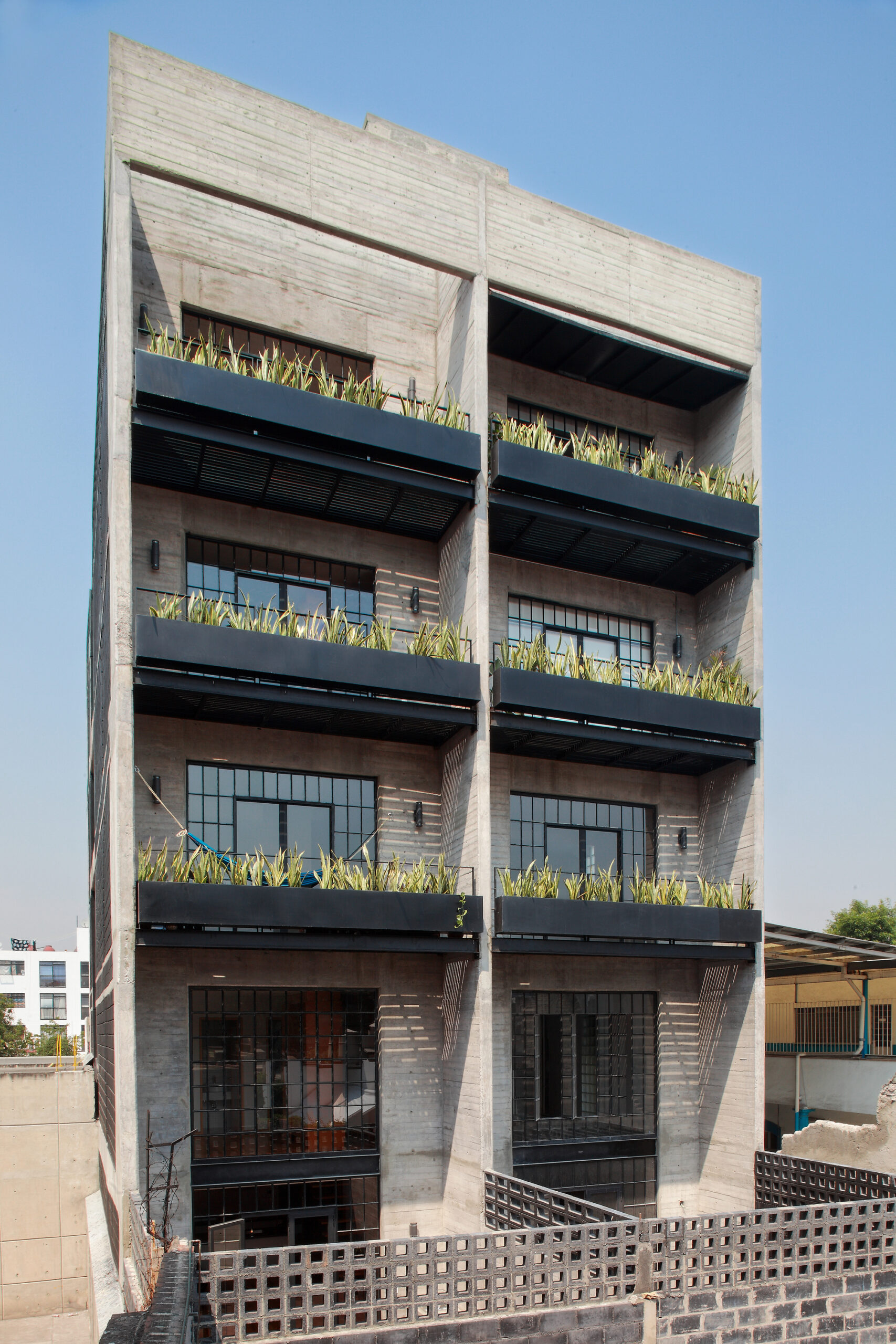 The openings of the building go from floor to ceiling with a rectangular proportion of 1 / 2.5 that generates a rhythm and configure the development of the façade, the building uses the lighting and ventilation in its longest side (south orientation) with openings at the end of each volume, and a patio that warranties cross ventilation, this is possible since the adjoining property is not developed and will not be in the future since it is a Metro facilitiy.