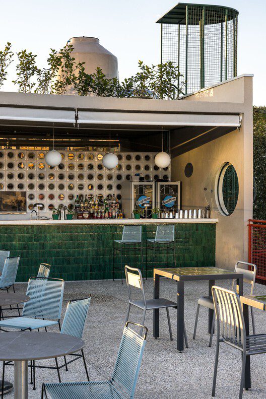 On the ground floor, a spacious outdoor area blends nature and social interaction, serving as a meeting point for various experiences, supported by a showcase-style bar. A red metal staircase and walkway connect the floors and stand out as striking visual elements of the project.