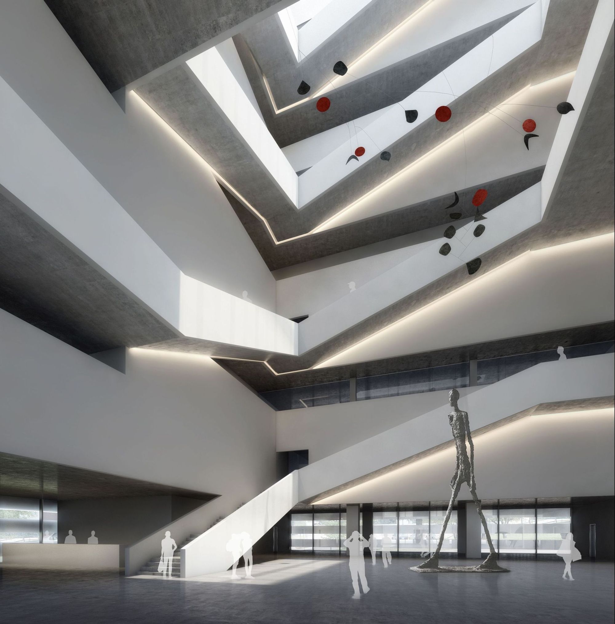 The building modules – which cantilever bridge-like in a large arc – consist of six 45 metre-high pavilions which vary significantly inside with their different architectural functions, but form a visual whole from the outside. The space between the art gallery to the east and the science and technology museum to the west forms the public plaza in the center of Changzhou. With its water features and generous landscaping, it provides an inviting ambiance and serves as a meeting point in the district.On the 256,000 square meter basement floor are an underground car park as well as numerous shop and retail areas which are lit by lightwells and which are directly connected with the cultural facilities.