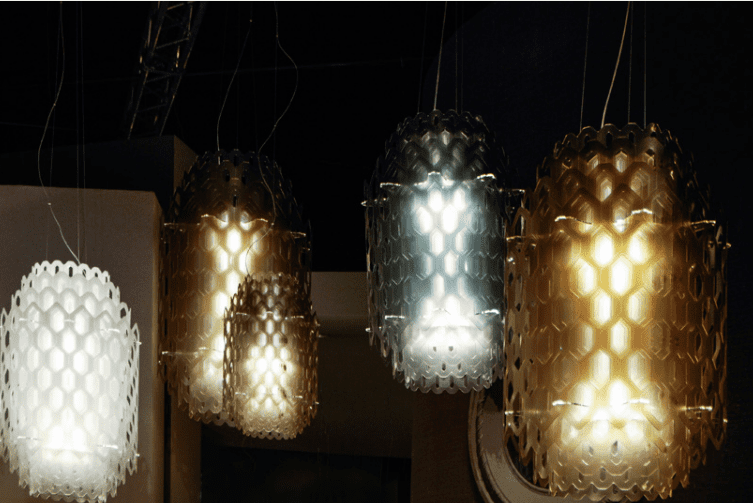 Made from the strata of materials such as Cristaflex and Lentiflex and then perforated, the hexagonal cut outs are placed strategically one behind another in order to give a diffused glow from the lamp that makes it appear as if the volume is really multiplying. Available in blue, orange and white and in 3 different sizes, what makes this lamp stand out is the kind of warm glow that it gives. Apart from that, each lamp holds the unique property of fitting into a modern minimalist setting as well as a more ornamental middle-eastern decor.