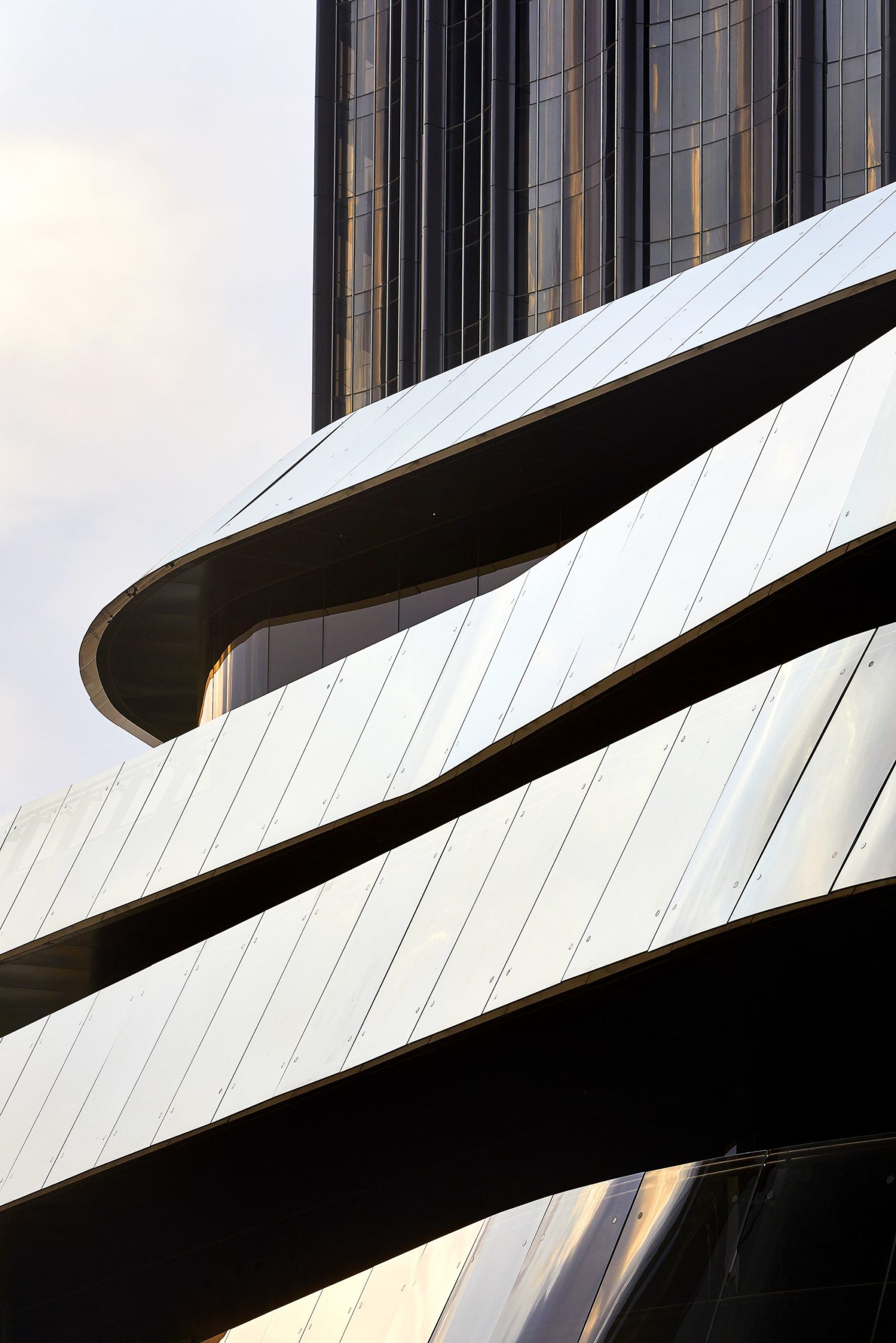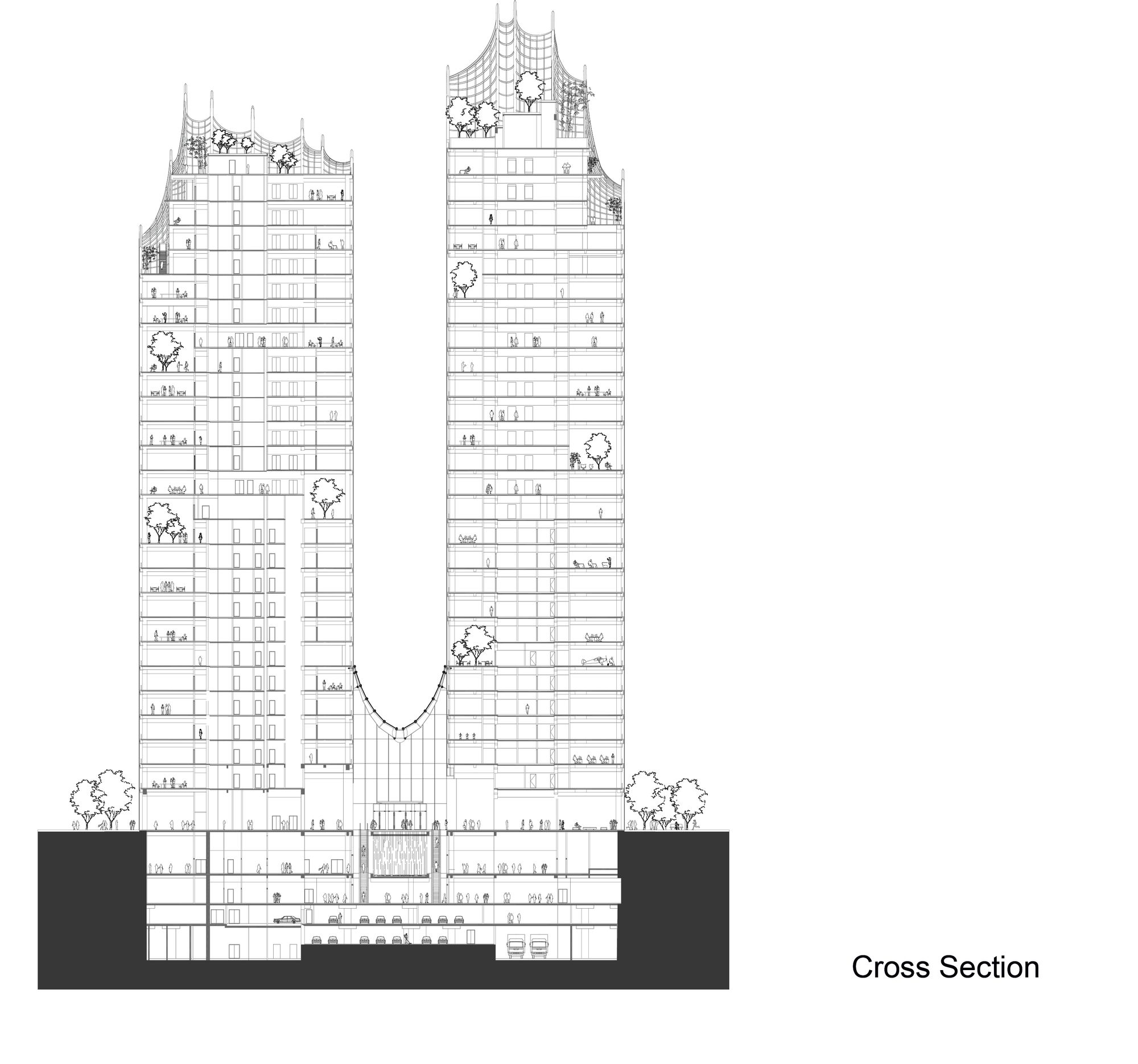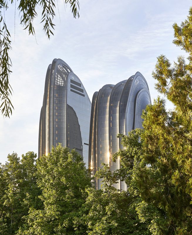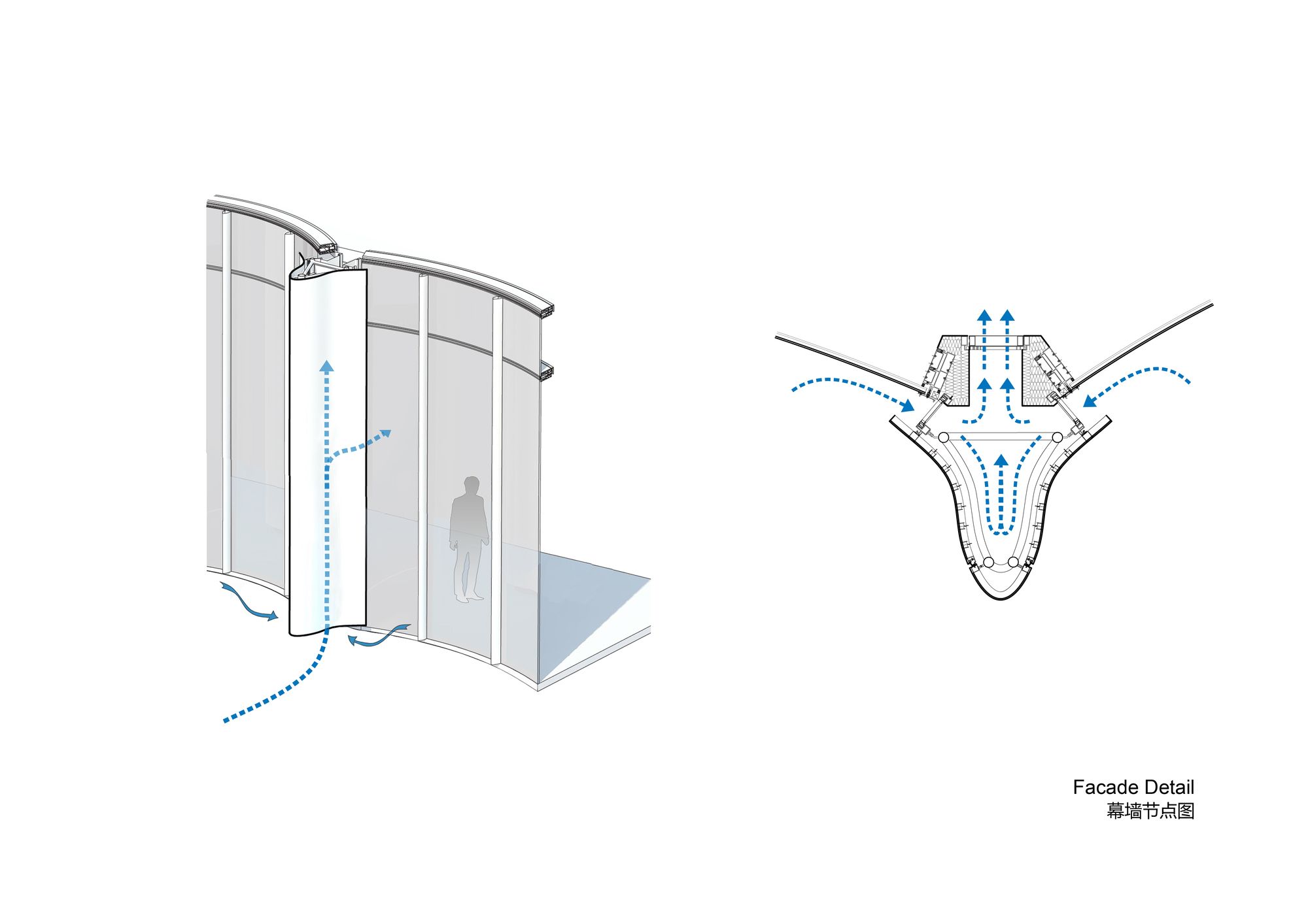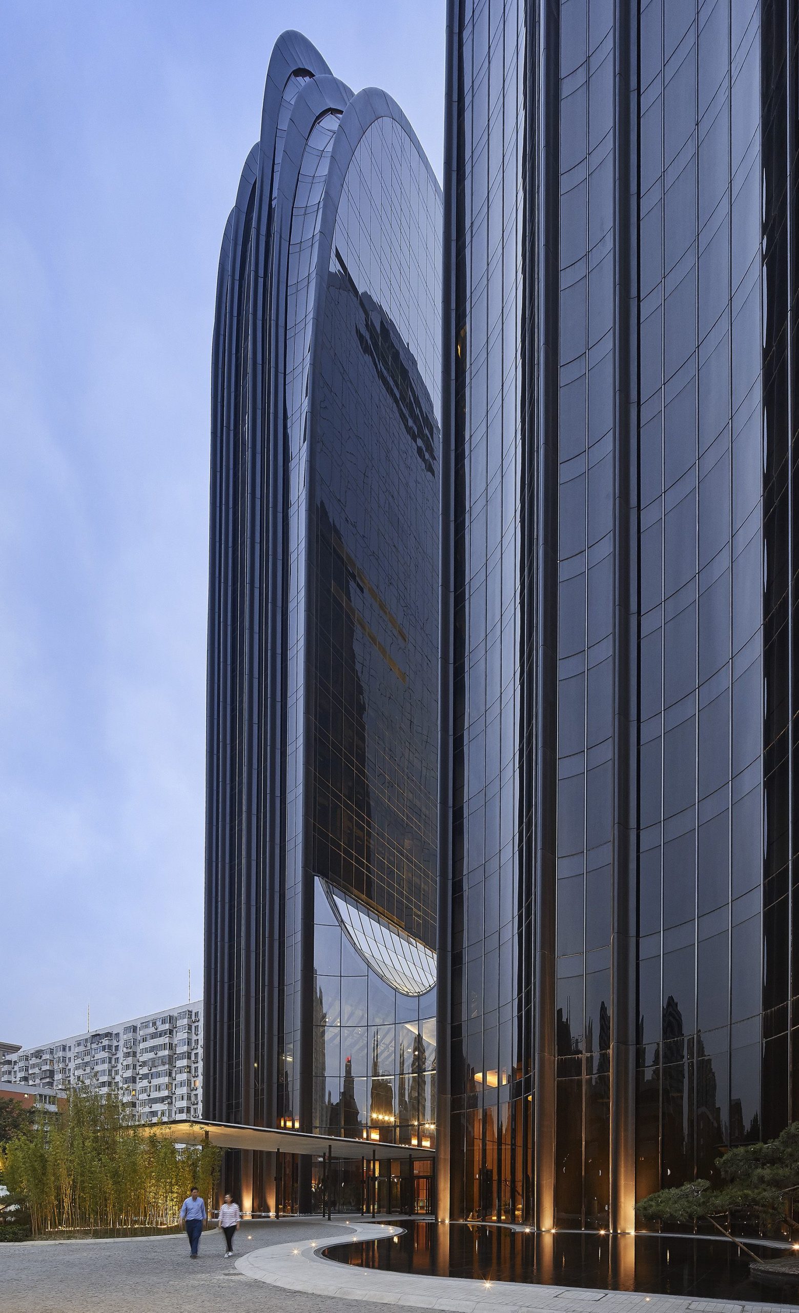 Like the tall mountain cliffs and river landscapes of China, a pair of asymmetrical towers creates a dramatic skyline in front of the park. Ridges and valleys define the shape of the exterior glass facade, as if the natural forces of erosion wore down the tower into a few thin lines. Flowing down the facade, the lines emphasize the smoothness of the towers and its verticality. The internal ventilation and filtration systems draw a natural breeze indoors which not only improves the interior space, but also creates an energy efficient system.