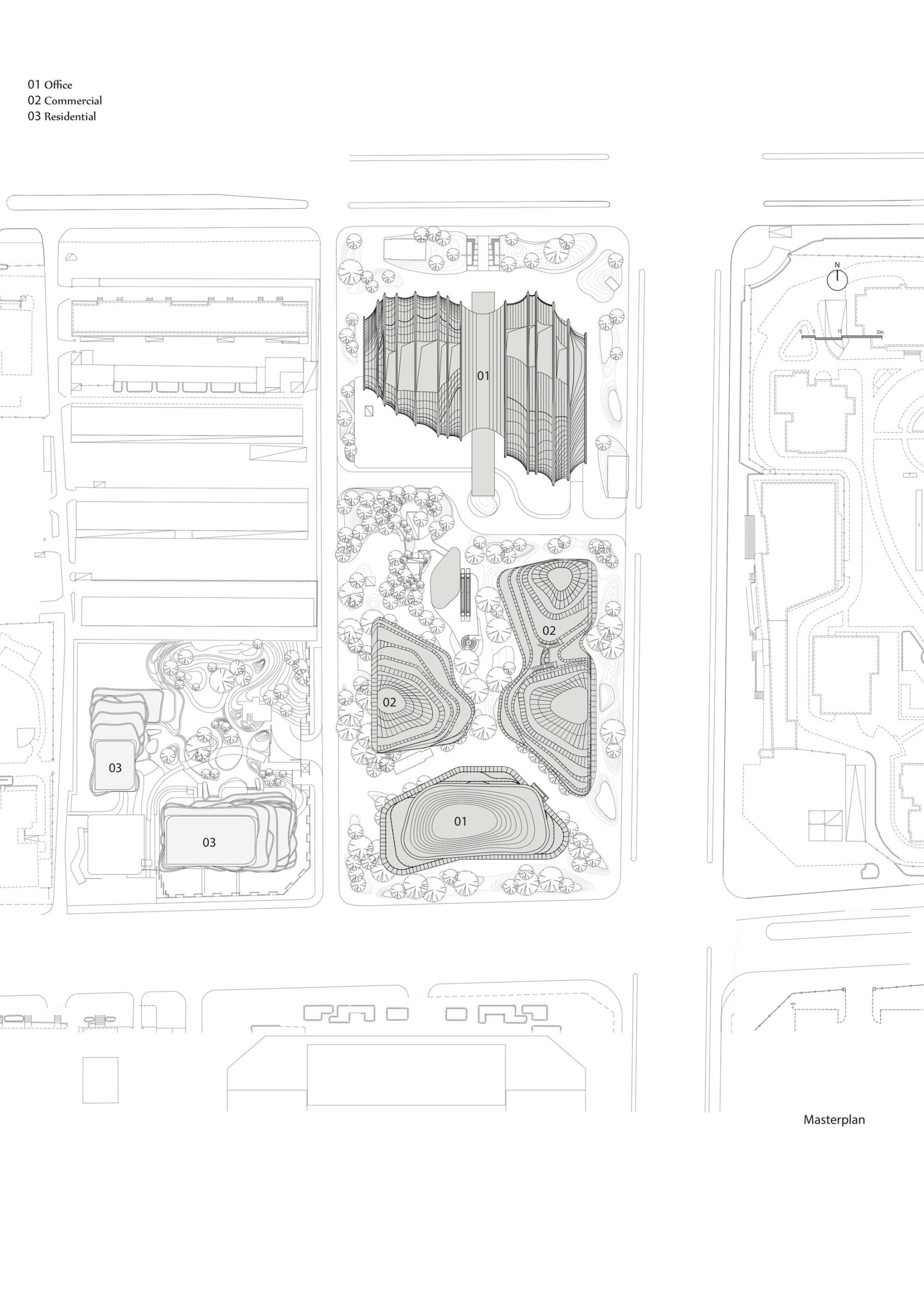Chaoyang Park Plaza is located in the central business district (CBD) of Beijing and is composed of over 120,000 square meters of commercial, office, and residential buildings. The site is on the Southern edge of Chaoyang Park, one of the largest public parks in Beijing. Its proximity to the park will not only create breathtaking views of the city, but will also impact the skyline of Beijing. By transforming features of Chinese classical landscape painting, such as lakes, springs, forests, creeks, valleys and stones, into modern ‘city landscapes’, the urban space creates a balance between high urban density and natural landscape. The forms of buildings echo what is found in natural landscapes and re-introduce nature to the urban realm.