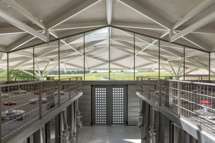 Like the grapes that grow on the land, the Nouveau Chai building stands over a square mile. 12 tree-like colons sprout from ground and bloom into a triangle roof. This is the visible new building in 200 years on the expansive estate.