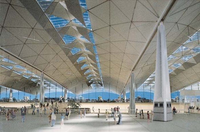 In a major reclamation program, its 100 meter peak was reduced to 7 meters above sea level and the island was expanded to four times its original area. It is characterized by a lightweight roof canopy, kept free of service installations, the use of natural lighting and the integration beneath the main passenger concourse of all the technical equipments for baggage handling, environmental services and transportation.