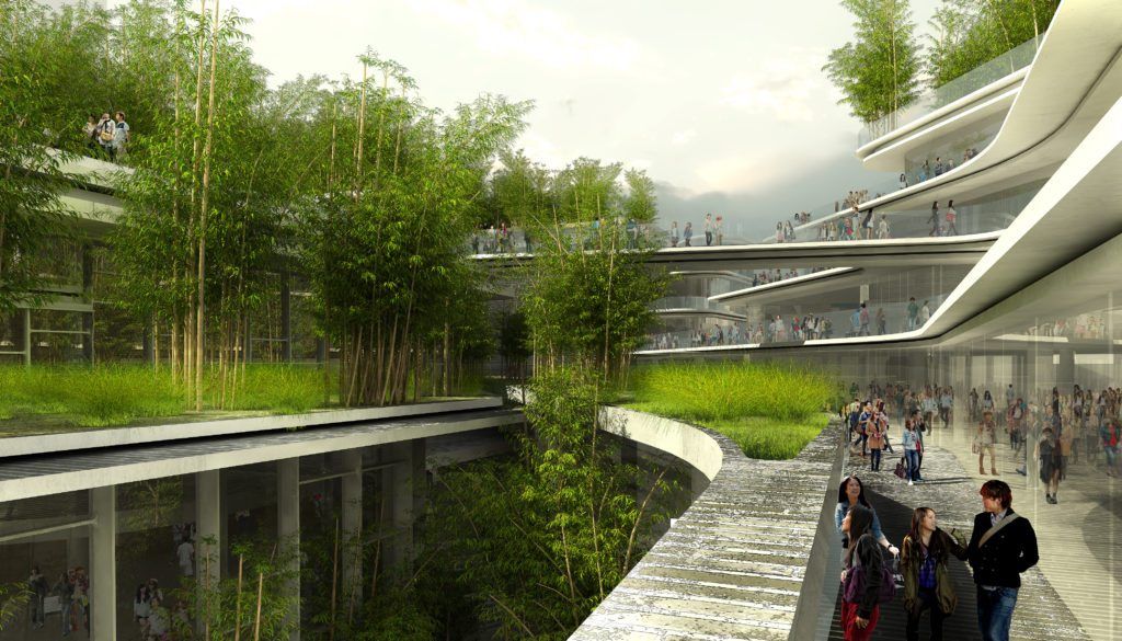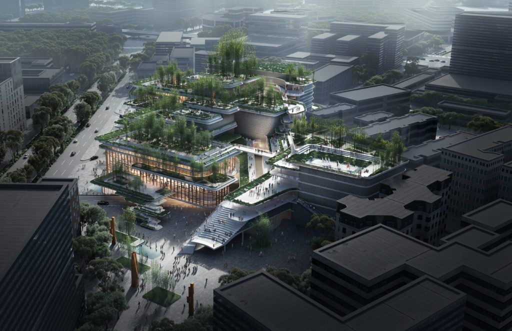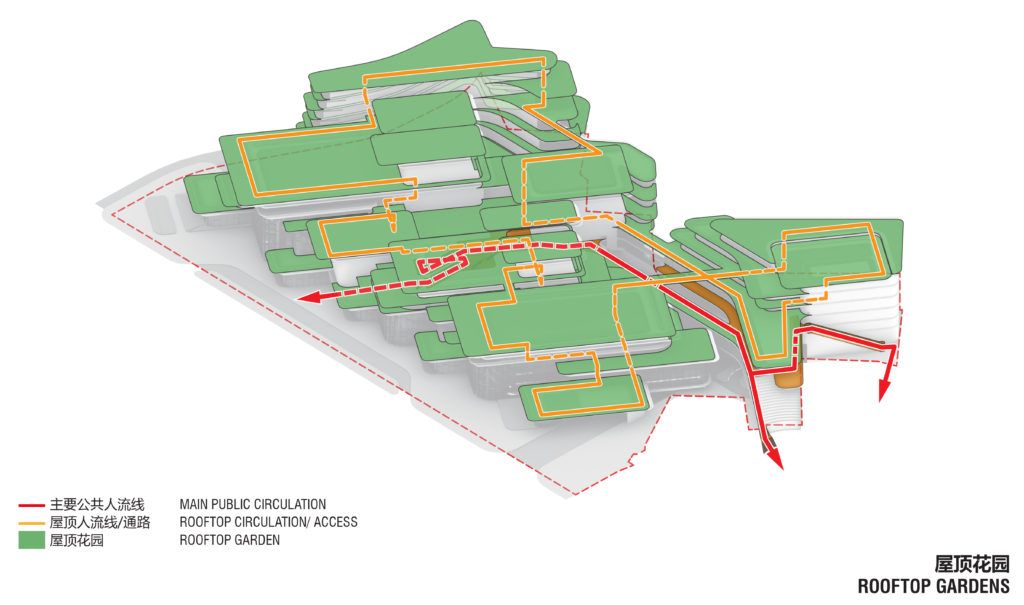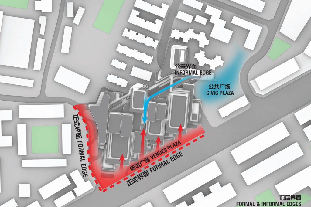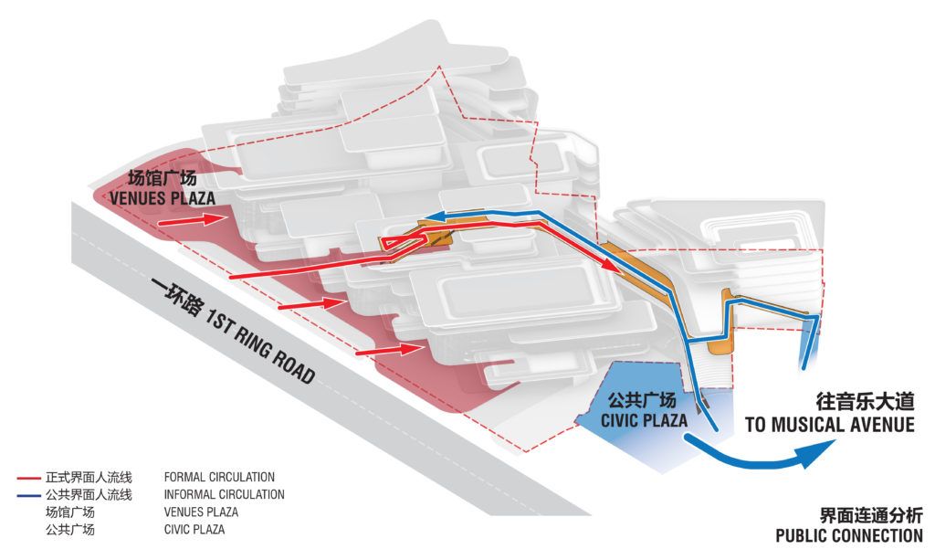 The physical line between the tangible and the ephemeral was celebrated as a stepped public series of connected terraces. Beneath these terraces are the varying volumes of venues below. Above these terraces are topographic bamboo gardens which provide an impression of the surrounding mountains.
