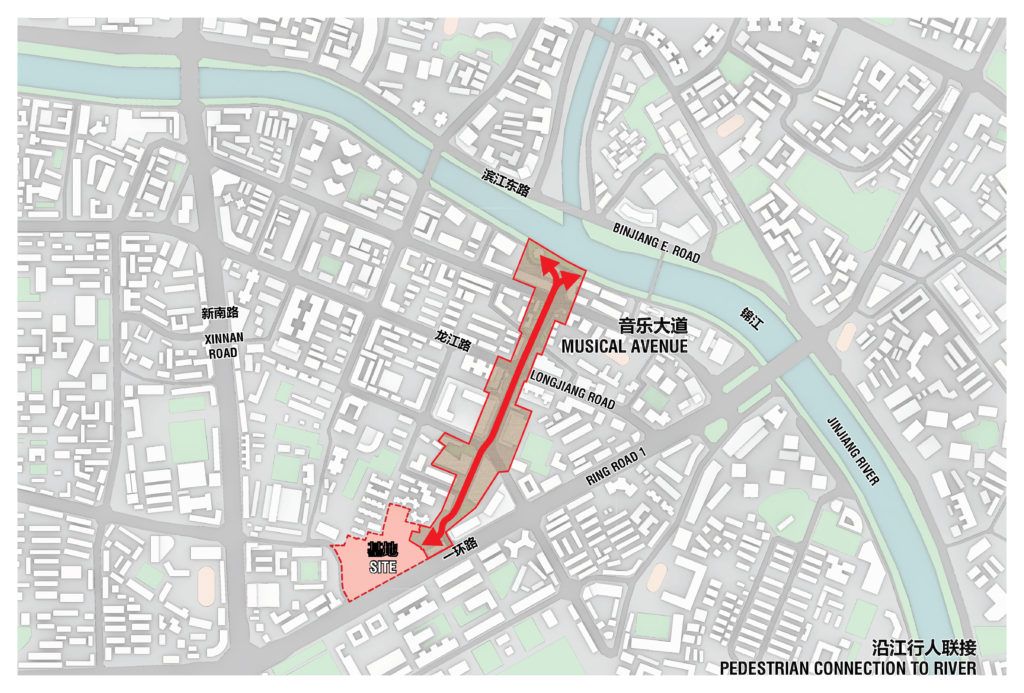 These accessible terraces step from the tall dense urban fabric towards the west and down to the more human scale pedestrian district to the east. The eastern edge is defined by an informal plaza which connects the project to the river and the arts district through the pedestrian ‘Music Avenue’.