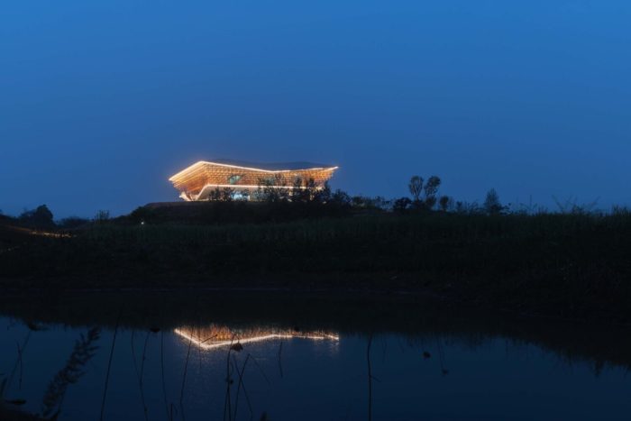 Nestled amidst lush wetlands and verdant forests, the Tianfu New Area graces the southern stretch of Chengdu’s central axis, Tianfu Avenue. Standing in perfect harmony with the surrounding fields, gentle hills, woodlands, and meandering rivers, the Chengdu Tianfu City Planning Hall perches gracefully atop a wetland hill, seamlessly blending with the natural landscape. It’s poised to become the defining symbol of the Tianfu New Area.