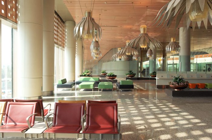 The hub is like a huge shell enclosing both domestic and international services. The shell is carried on mushroom like columns. The project consists of three symmetric concourses that are branched from a central core with inner courtyards. The building reflects the identity, culture and history of India and presents it in a new modern global way.