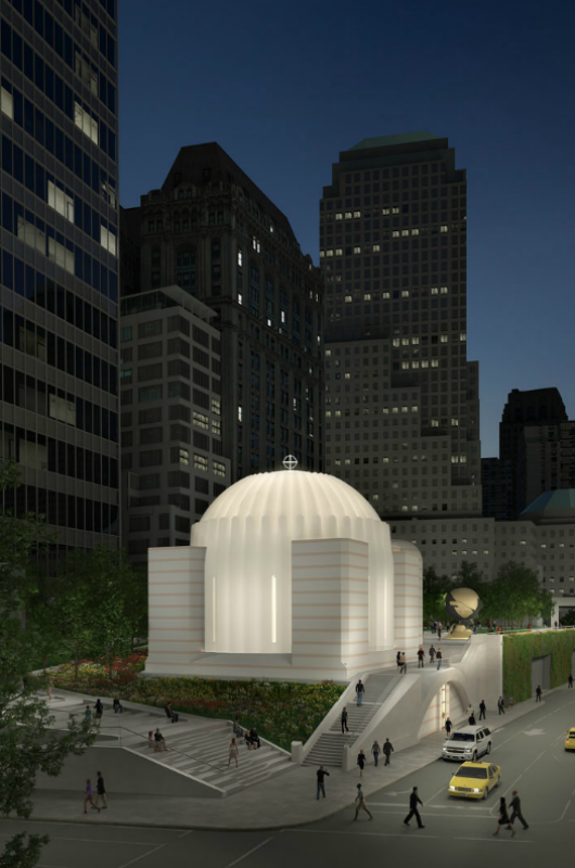 “Calatrava’s design was inspired by two places of worship in Istanbul, the Hagia Sophia and the Church of the Holy Savior in Chora“, described a press release following the ground breaking. “The dome-shaped design evolved loosely from a mosaic of ‘Madonna and Child Enthroned’. More than a dozen, other firms submitted designs for the new church, but ultimately the Greek Orthodox Archdiocese of America selected Calatrava’s vision for the building“.”A former small tavern, the Church was always an interesting counterpoint to the skyscrapers that grew up around it. Like its forebear, the new Church is to be a tiny jewel in Lower Manhattan“, said Calatrava in an open letter to the Greek Orthodox community after winning the commission.