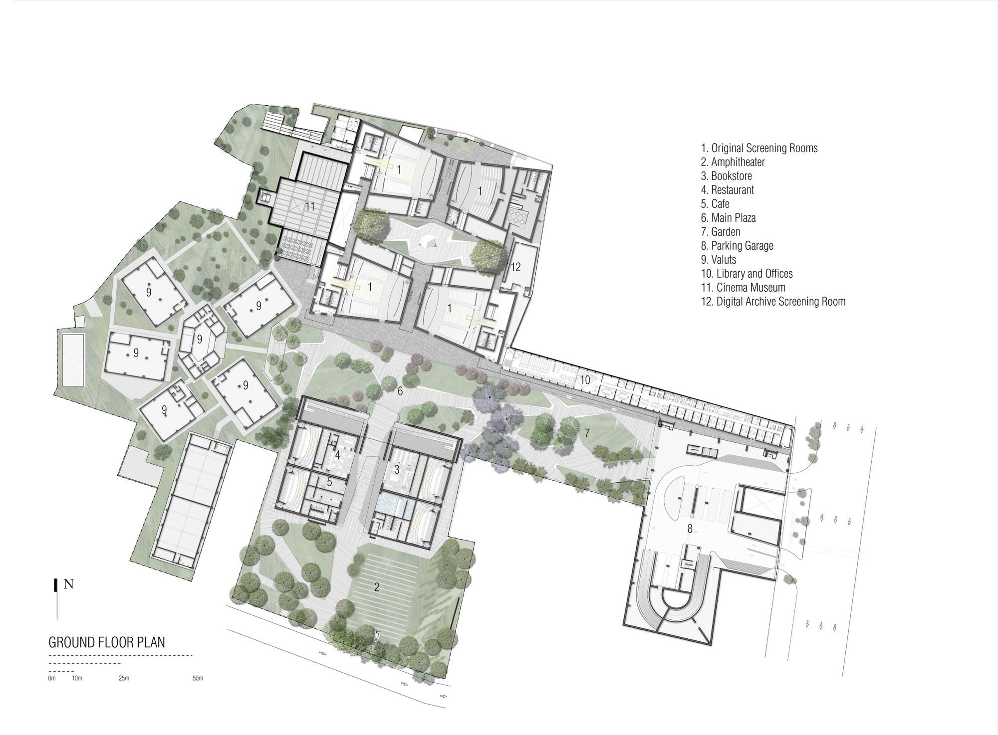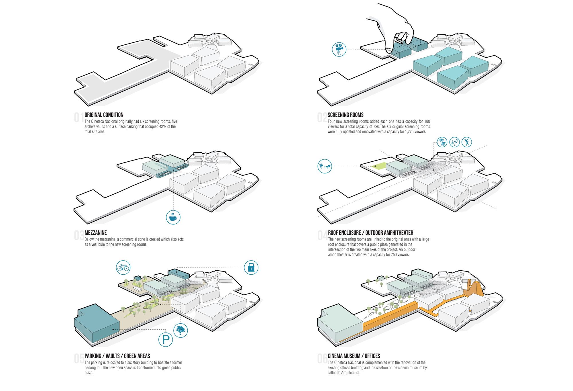 New screening rooms and retail spaces were added to the complex, in this renovation, as well as two new vaults for storing movie archives and an outdoor amphitheater. Parking was condensed into one multi-story building, contributing for the freeing of ground space for public use.