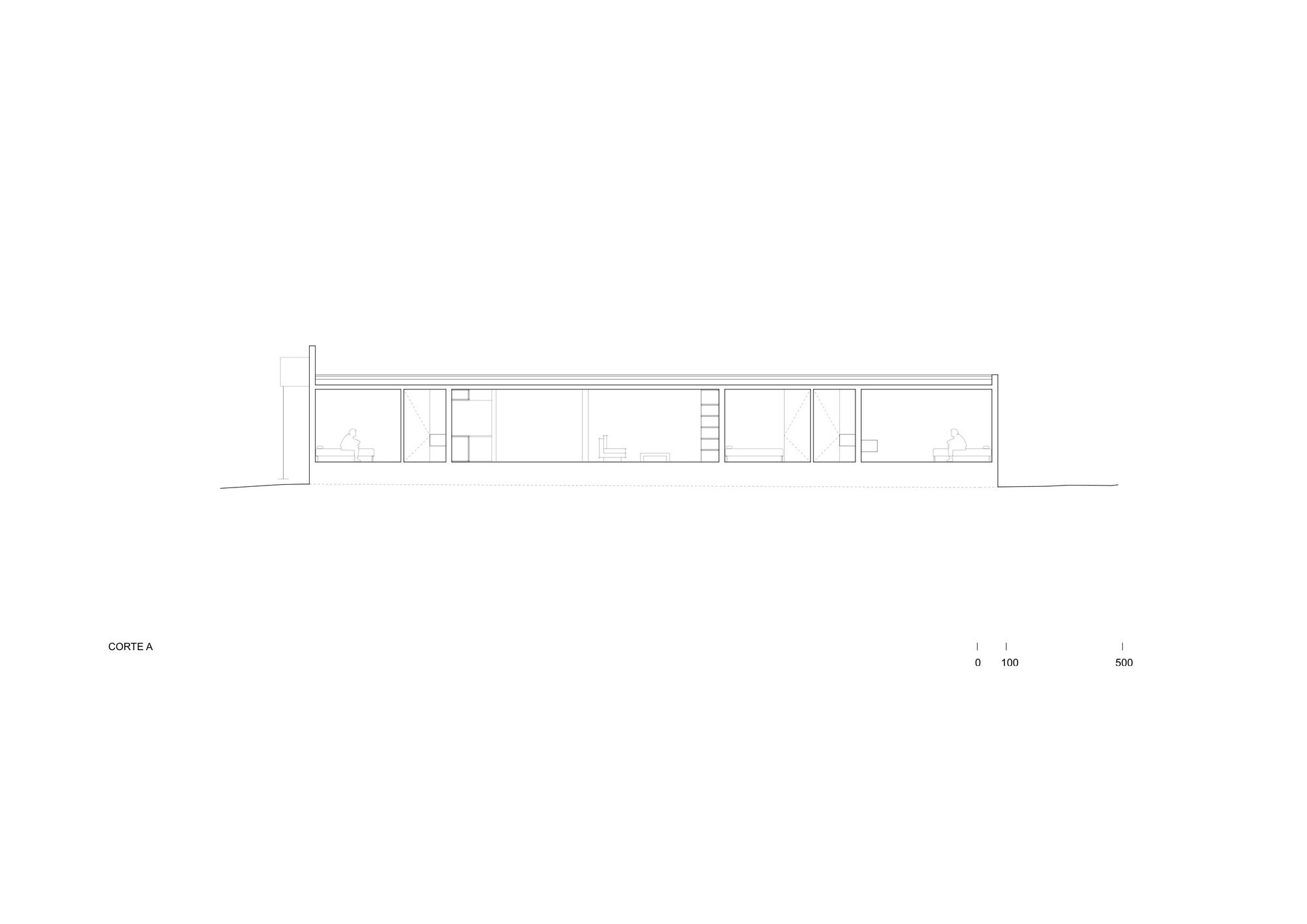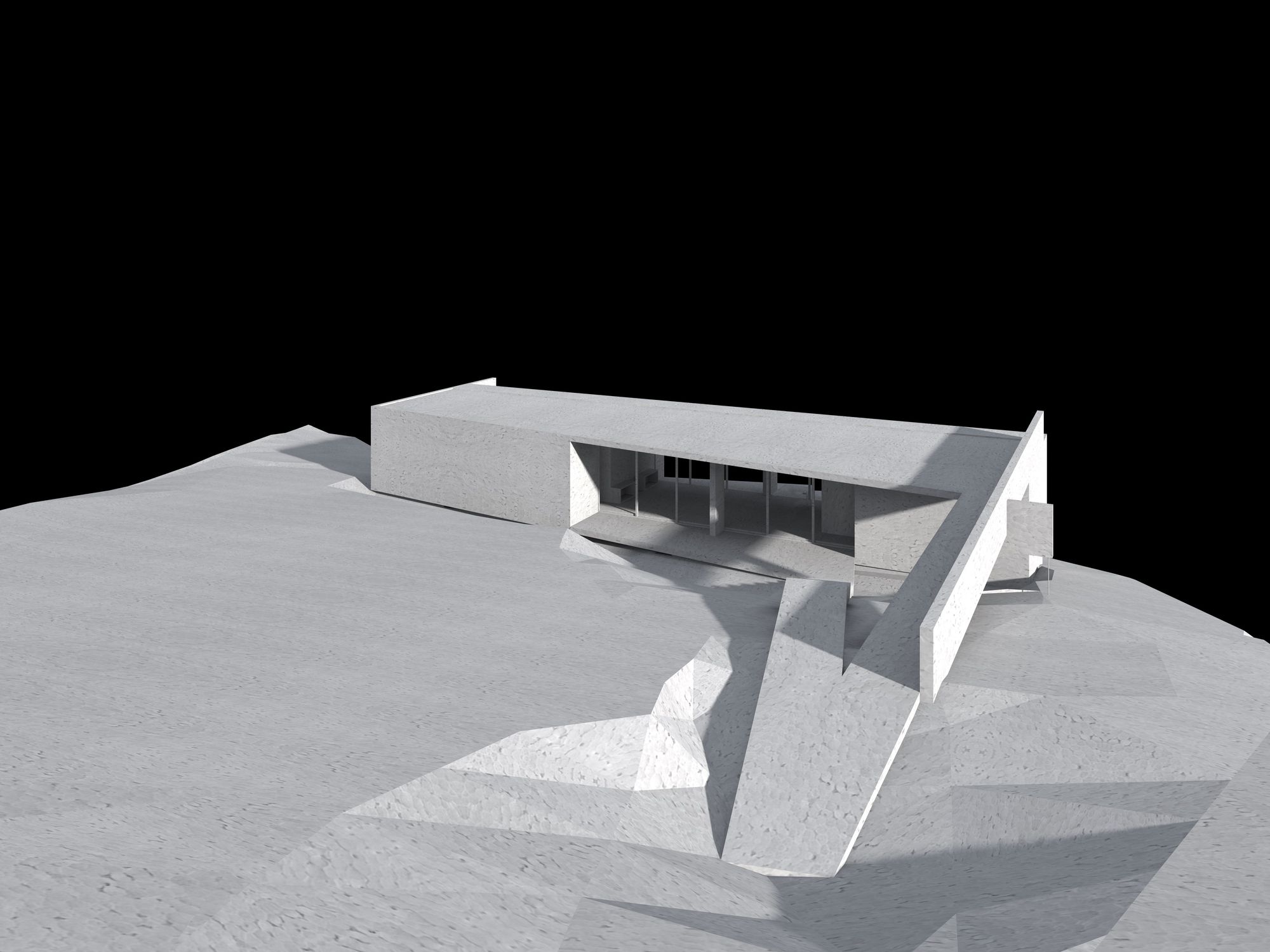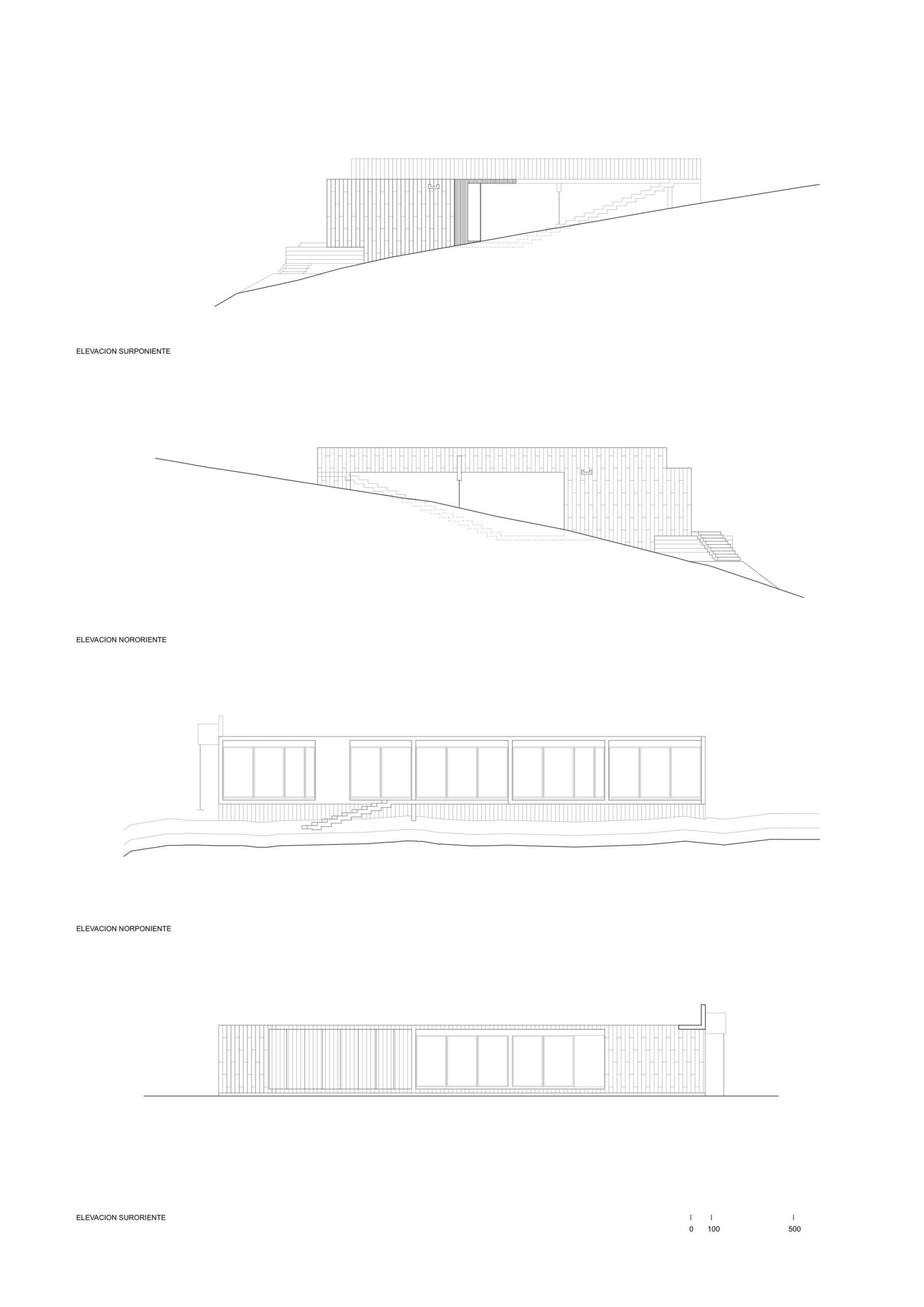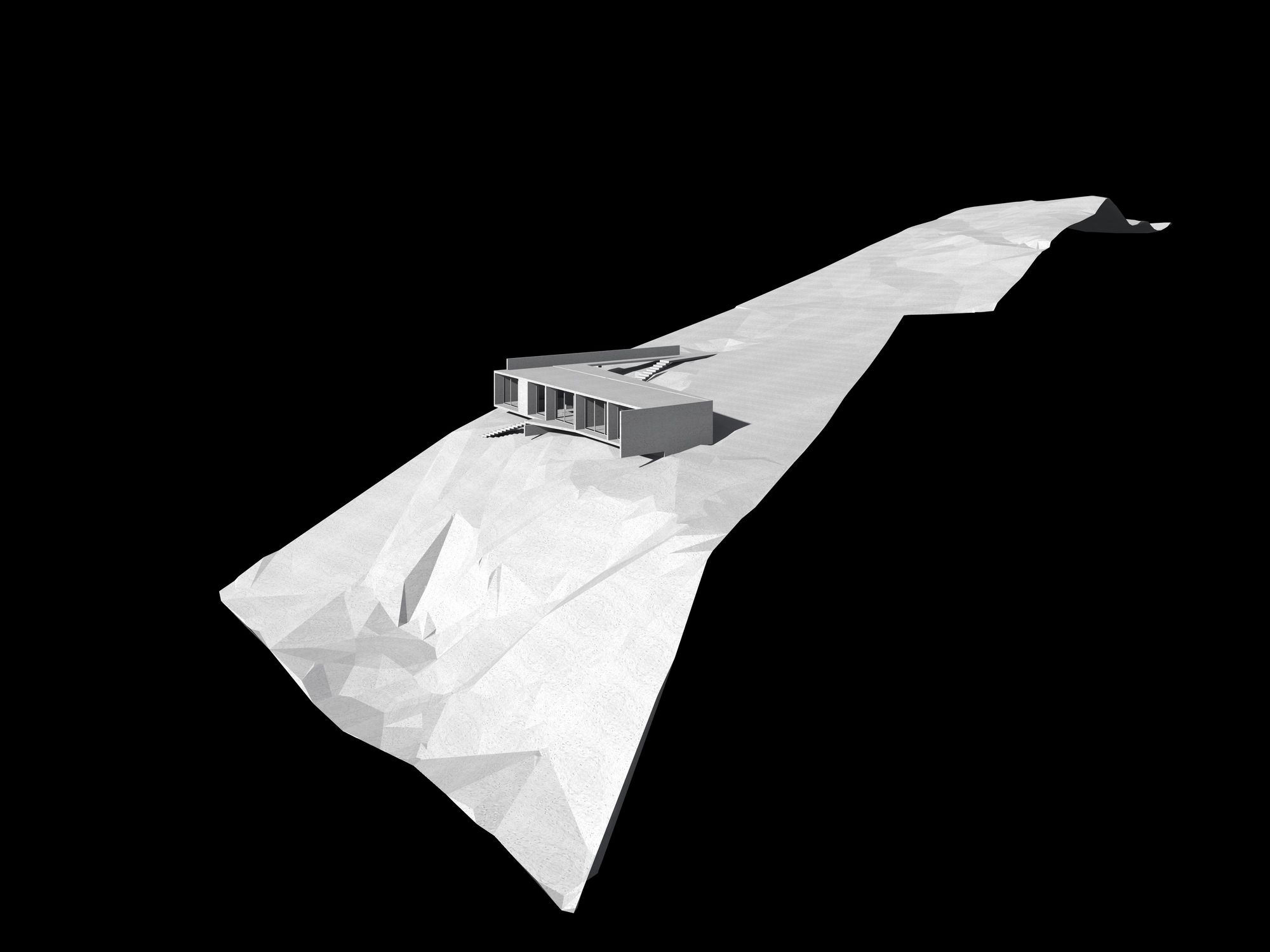 We further integrate two structural adjustments: a small one square meter wall attached to the beam of the bridge towards the roof is detached on the outside, counteracting the torsion of the beam with its weight. This wall is also attached to the ground through a metal tensioner, fixed to a concrete cube underground. Likewise, the transverse wall that encloses the house in the main bedroom area extends towards the sea only to counteract the torsion that the entire structure exerts towards its opposite side.