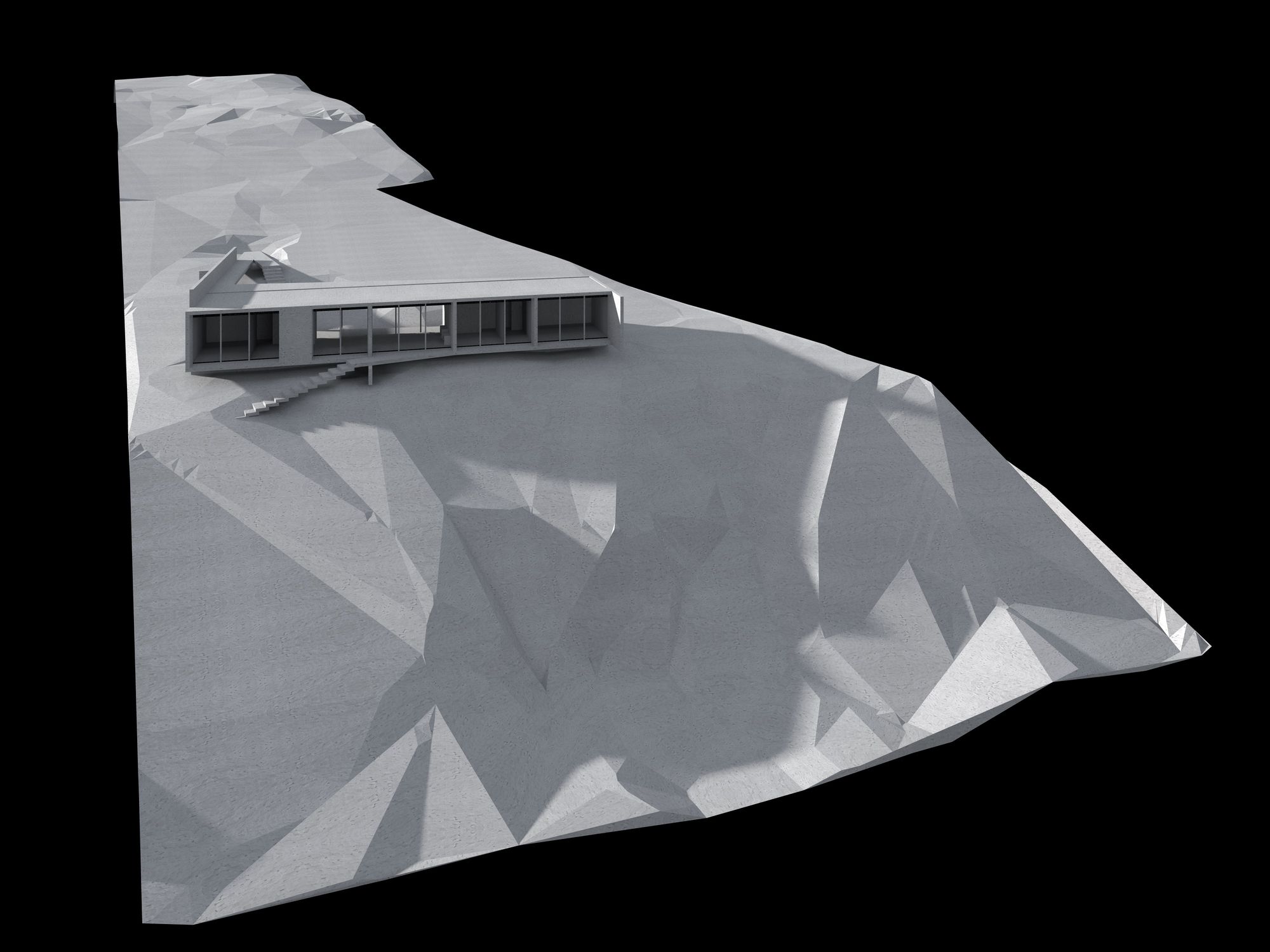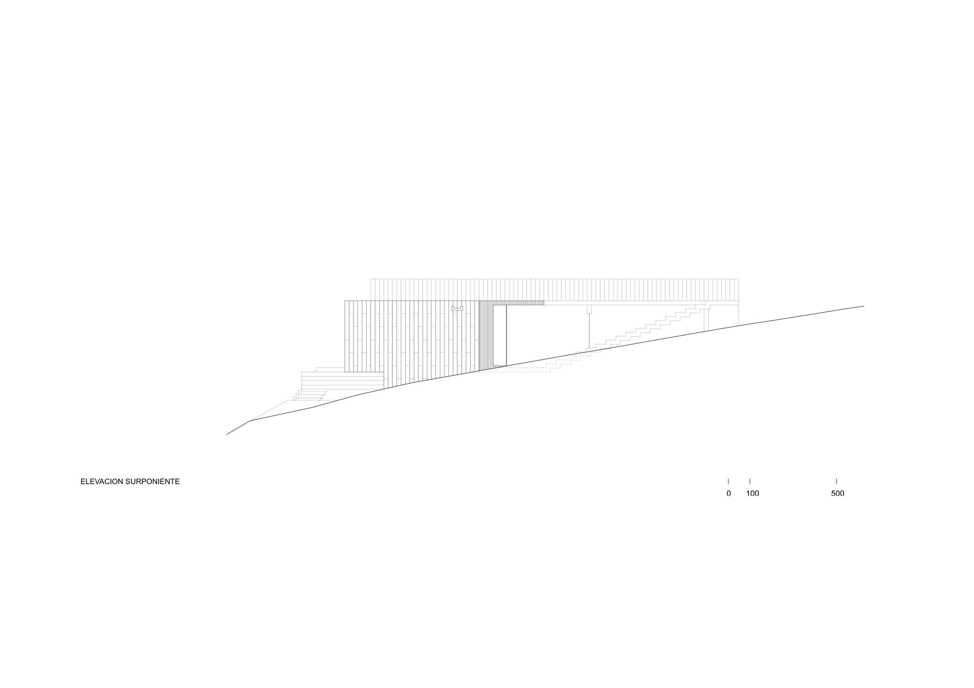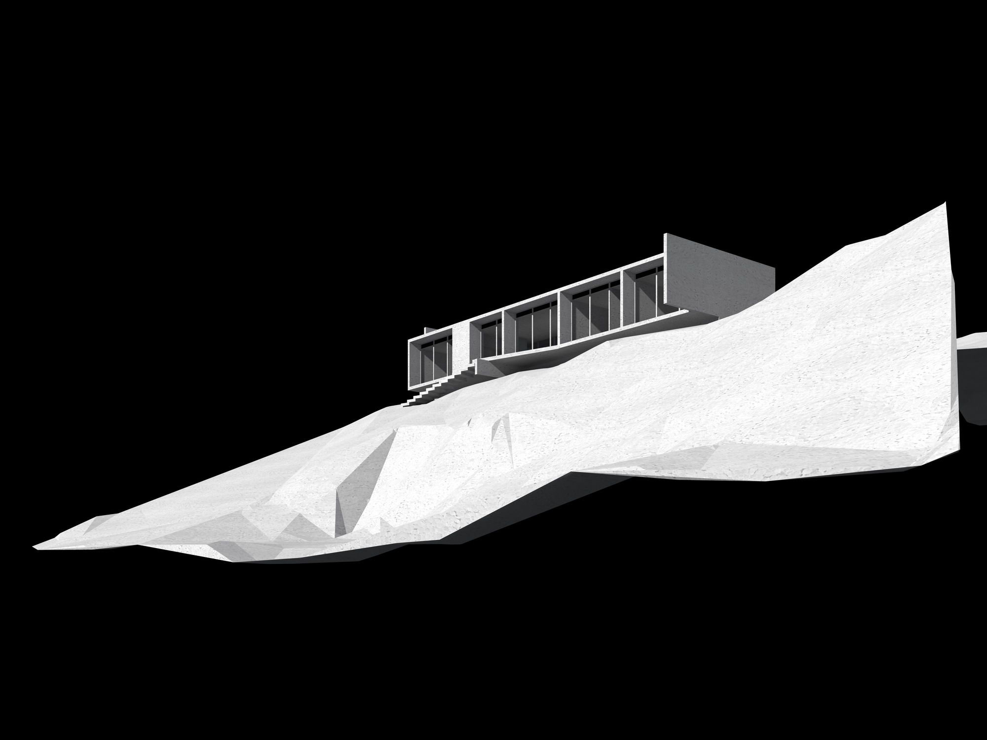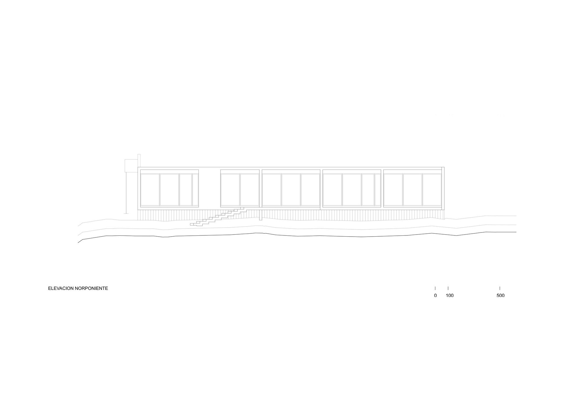 We further integrate two structural adjustments: a small one square meter wall attached to the beam of the bridge towards the roof is detached on the outside, counteracting the torsion of the beam with its weight. This wall is also attached to the ground through a metal tensioner, fixed to a concrete cube underground. Likewise, the transverse wall that encloses the house in the main bedroom area extends towards the sea only to counteract the torsion that the entire structure exerts towards its opposite side.