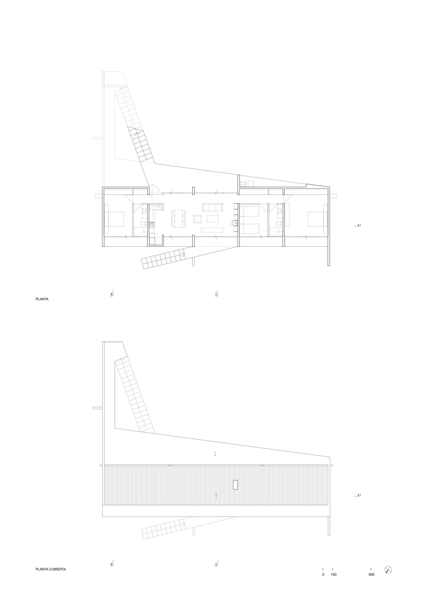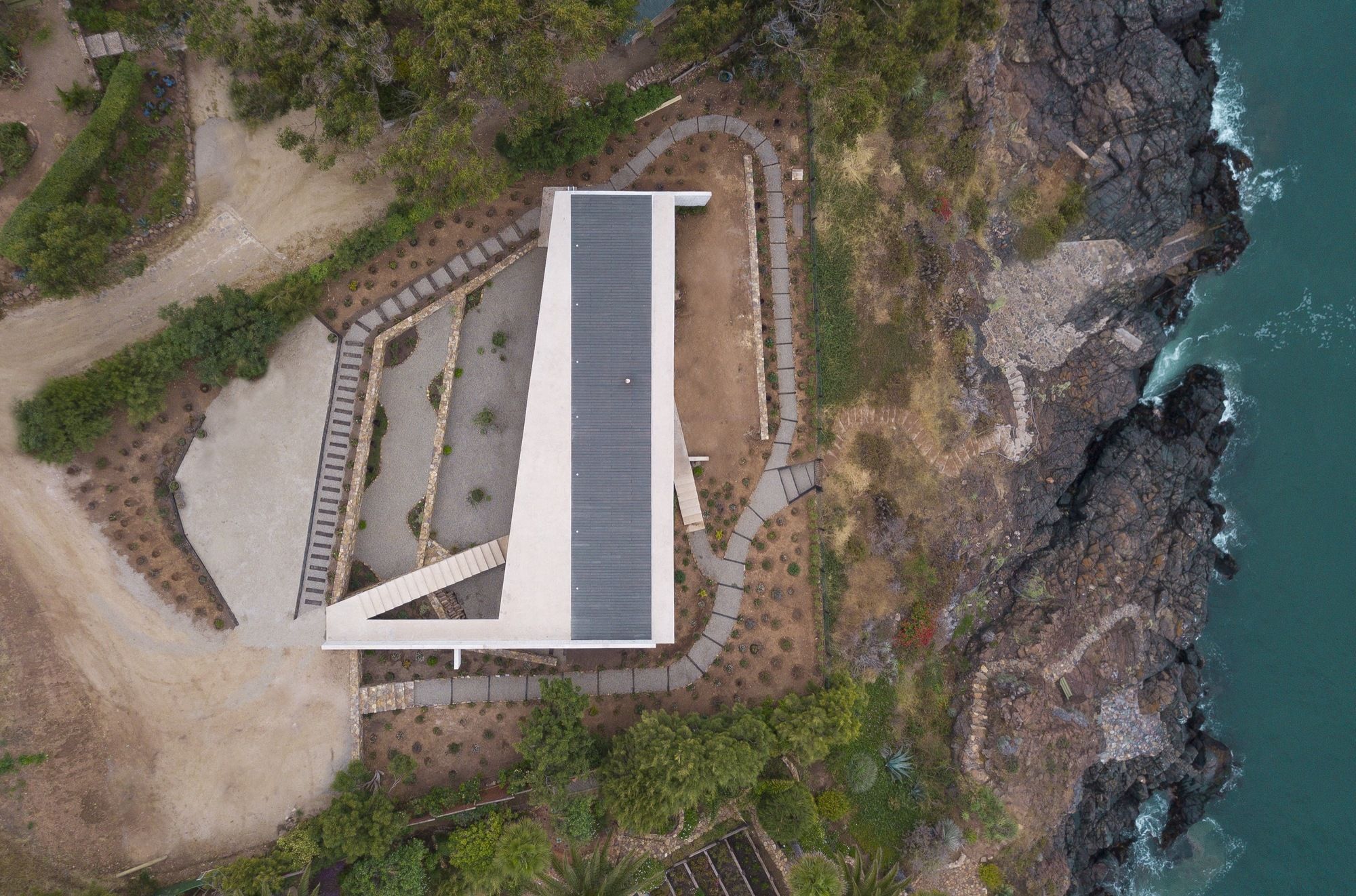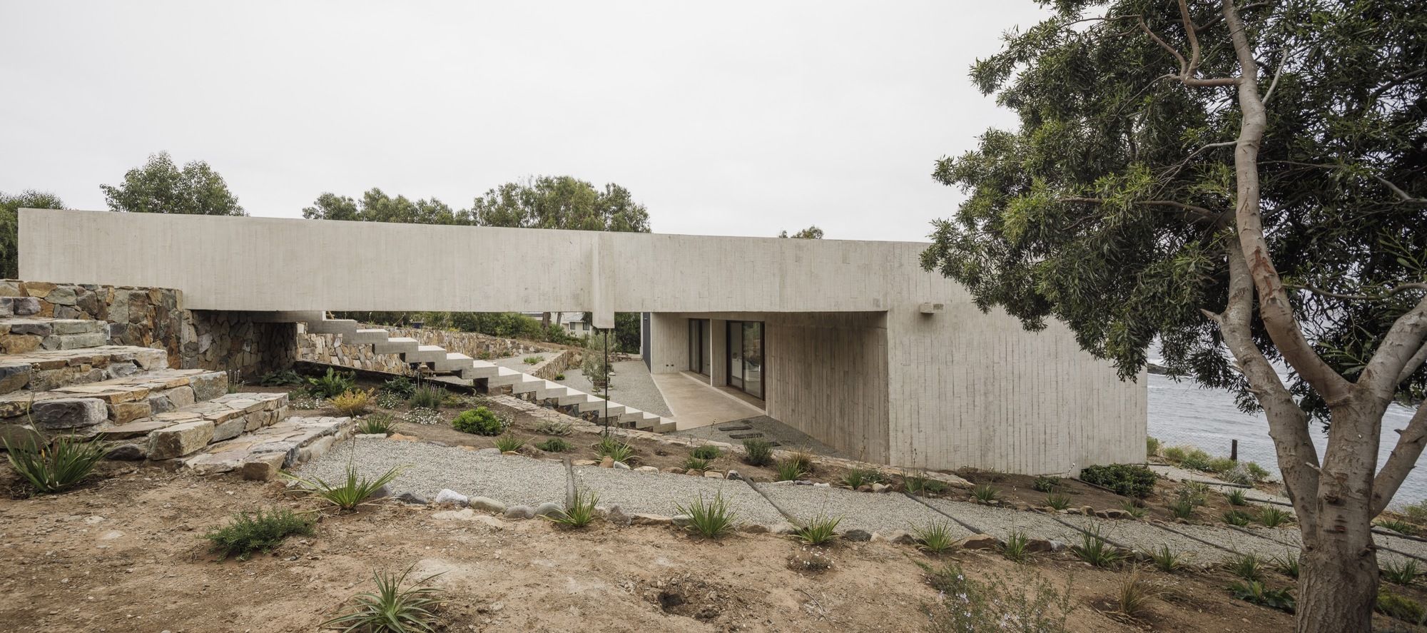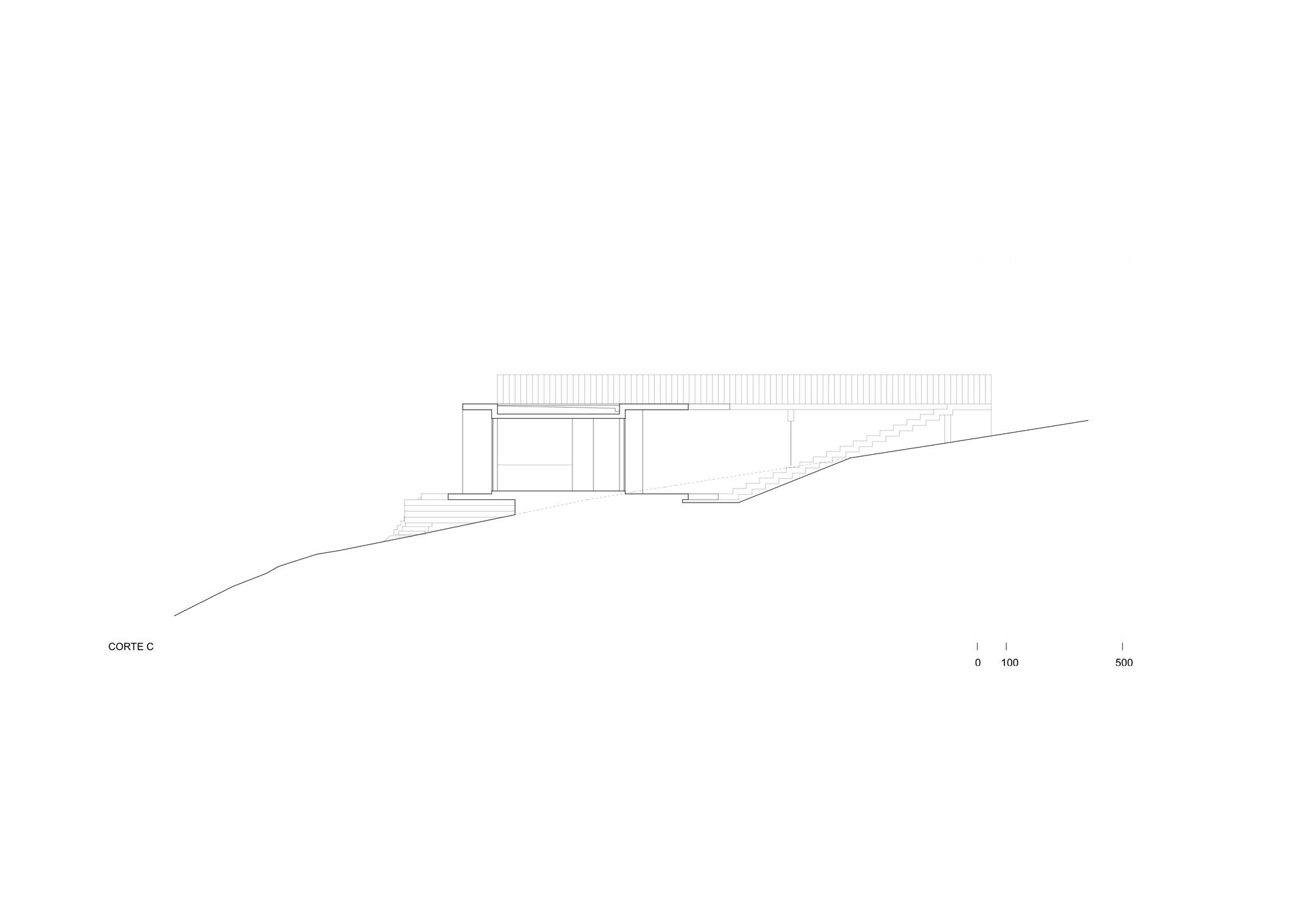 Thus, a basic domestic program composed of three bedrooms, two bathrooms, a living room, an integrated kitchen and dining area, plus a small outdoor cellar, is laid out along an exposed reinforced concrete slab 20 cms thick. The slab frames a series of architectural elements: the entrance and staircase towards the house, the bridge towards the roof, the beam that stiffens it and that functions simultaneously as the handrail, the roof which is also the eave of an intermediate space that precedes the entrance, the transverse structural walls that divide the interior spaces, the staircase that leads out to the sea and the beam that supports it; as if all of these elements were inseparable and integrated.