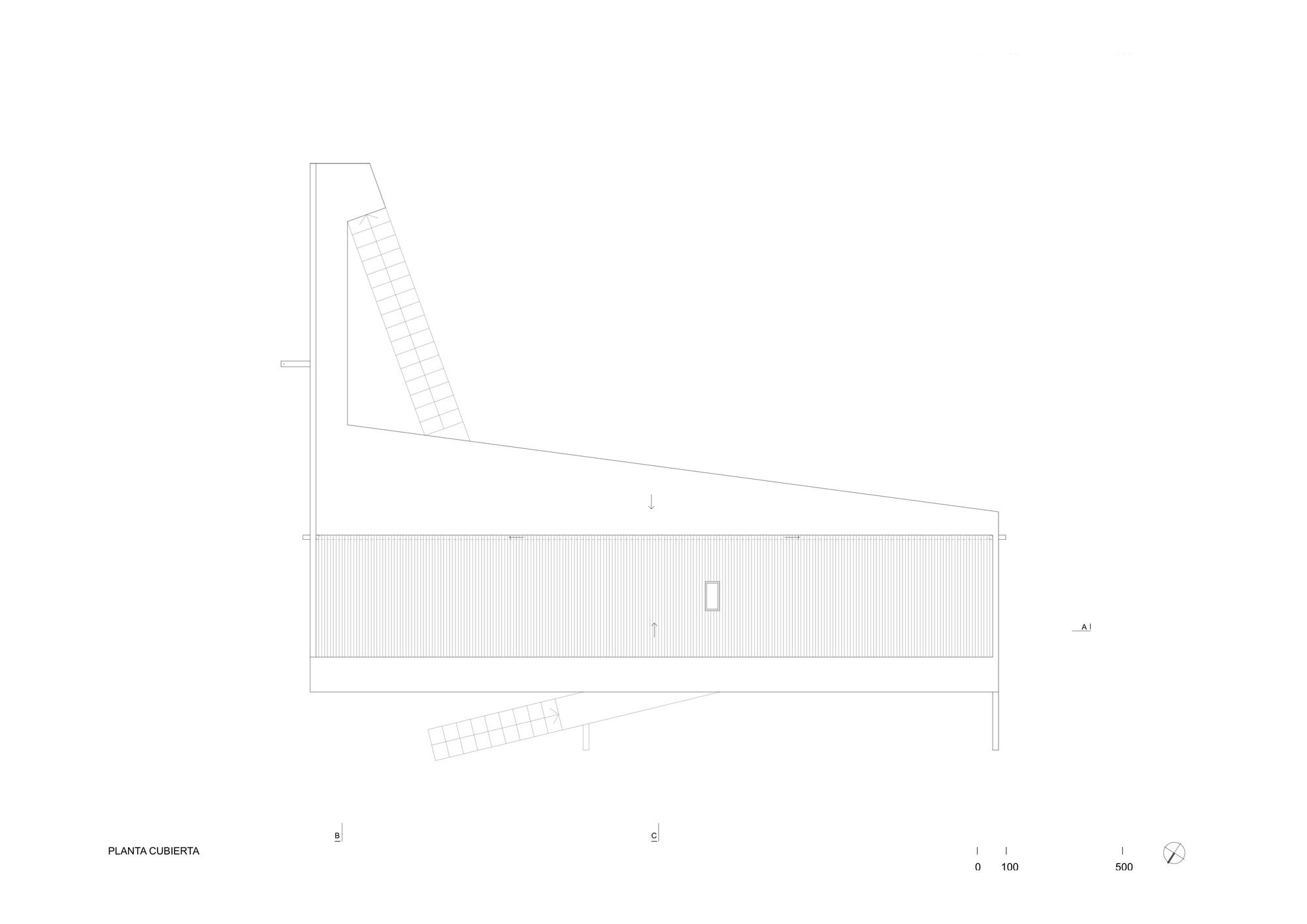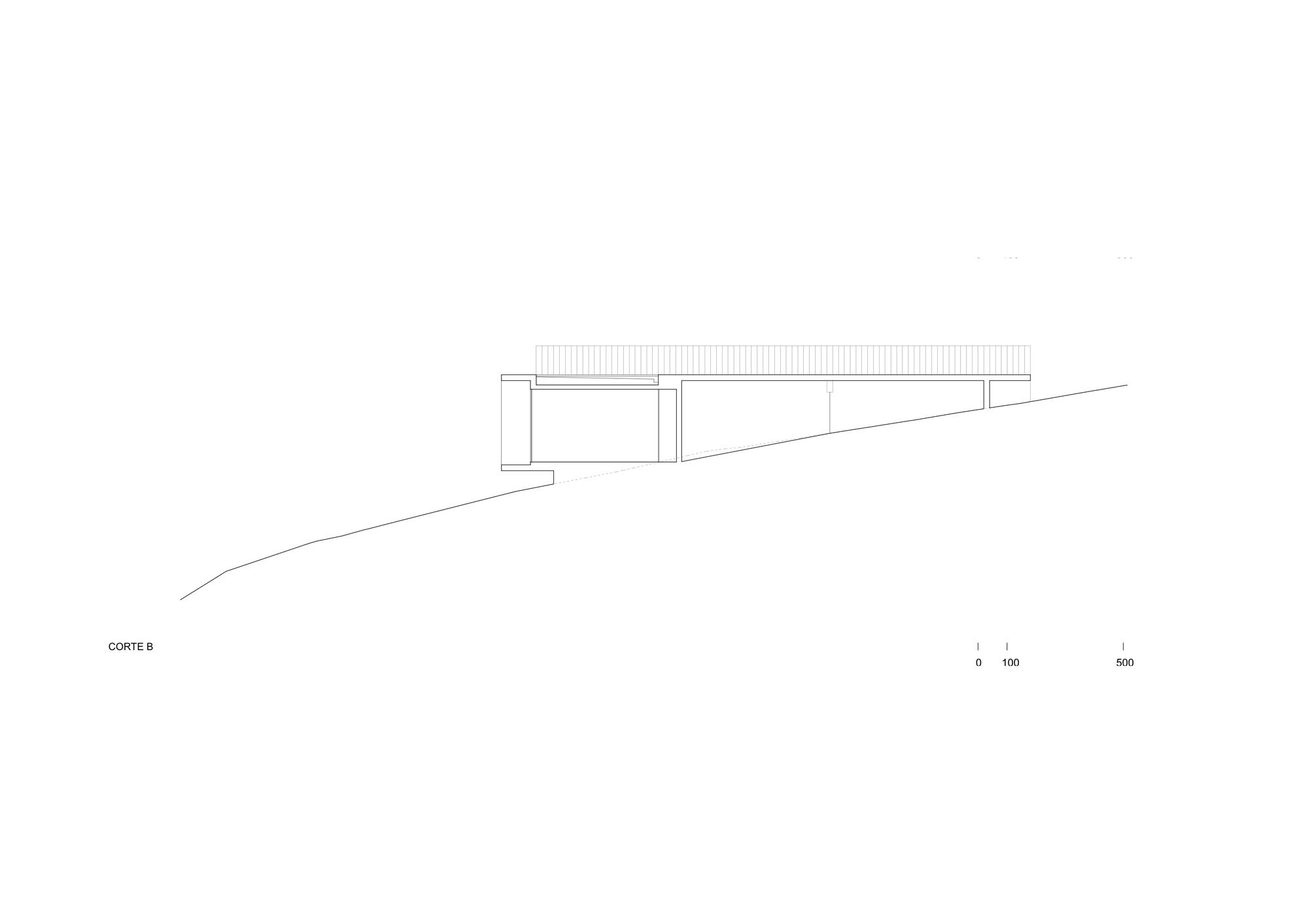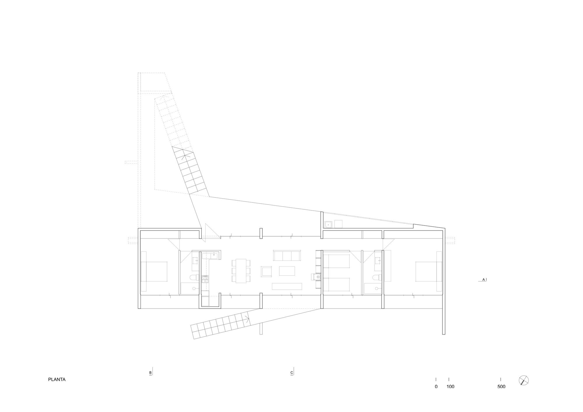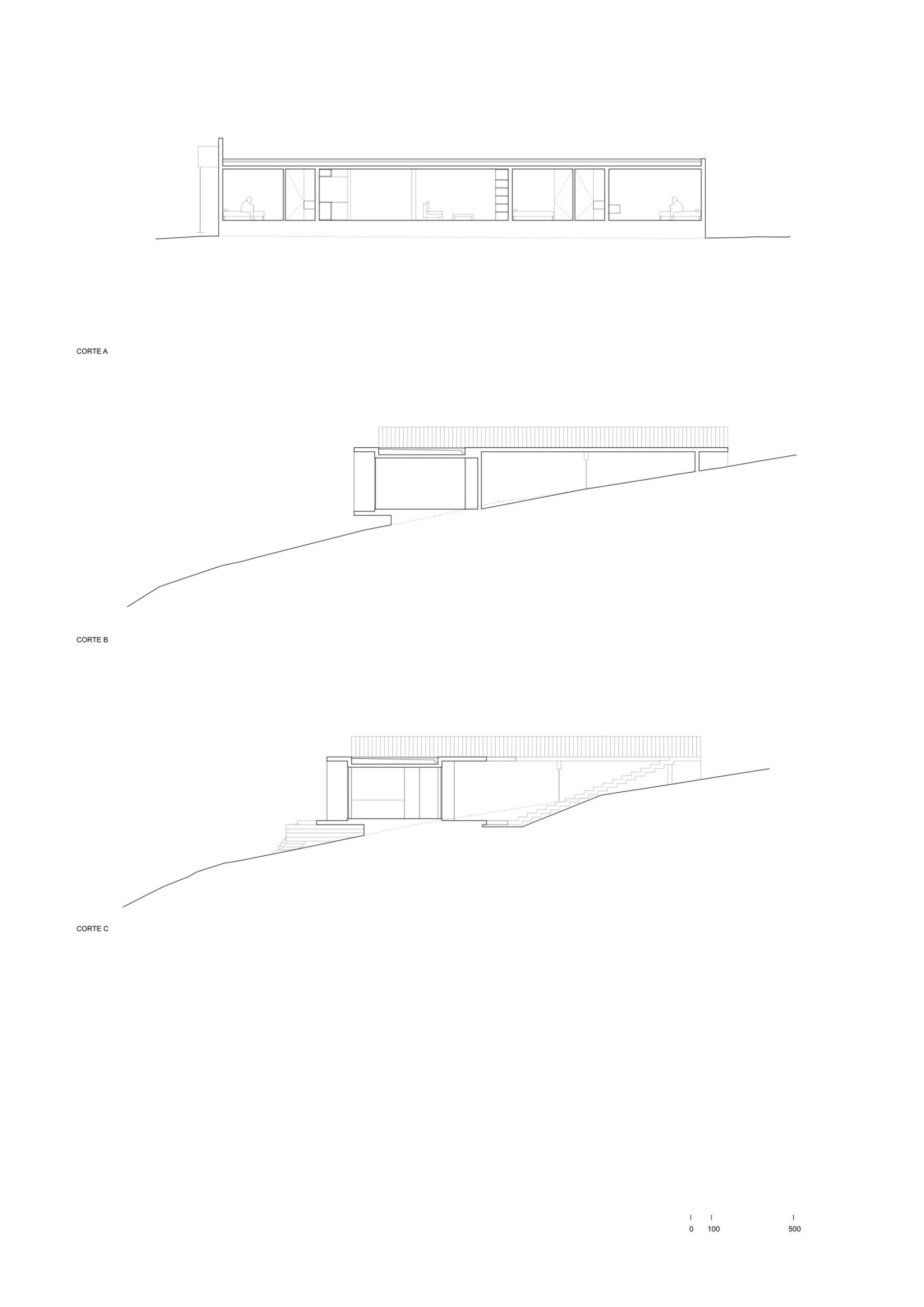 Thus, a basic domestic program composed of three bedrooms, two bathrooms, a living room, an integrated kitchen and dining area, plus a small outdoor cellar, is laid out along an exposed reinforced concrete slab 20 cms thick. The slab frames a series of architectural elements: the entrance and staircase towards the house, the bridge towards the roof, the beam that stiffens it and that functions simultaneously as the handrail, the roof which is also the eave of an intermediate space that precedes the entrance, the transverse structural walls that divide the interior spaces, the staircase that leads out to the sea and the beam that supports it; as if all of these elements were inseparable and integrated.